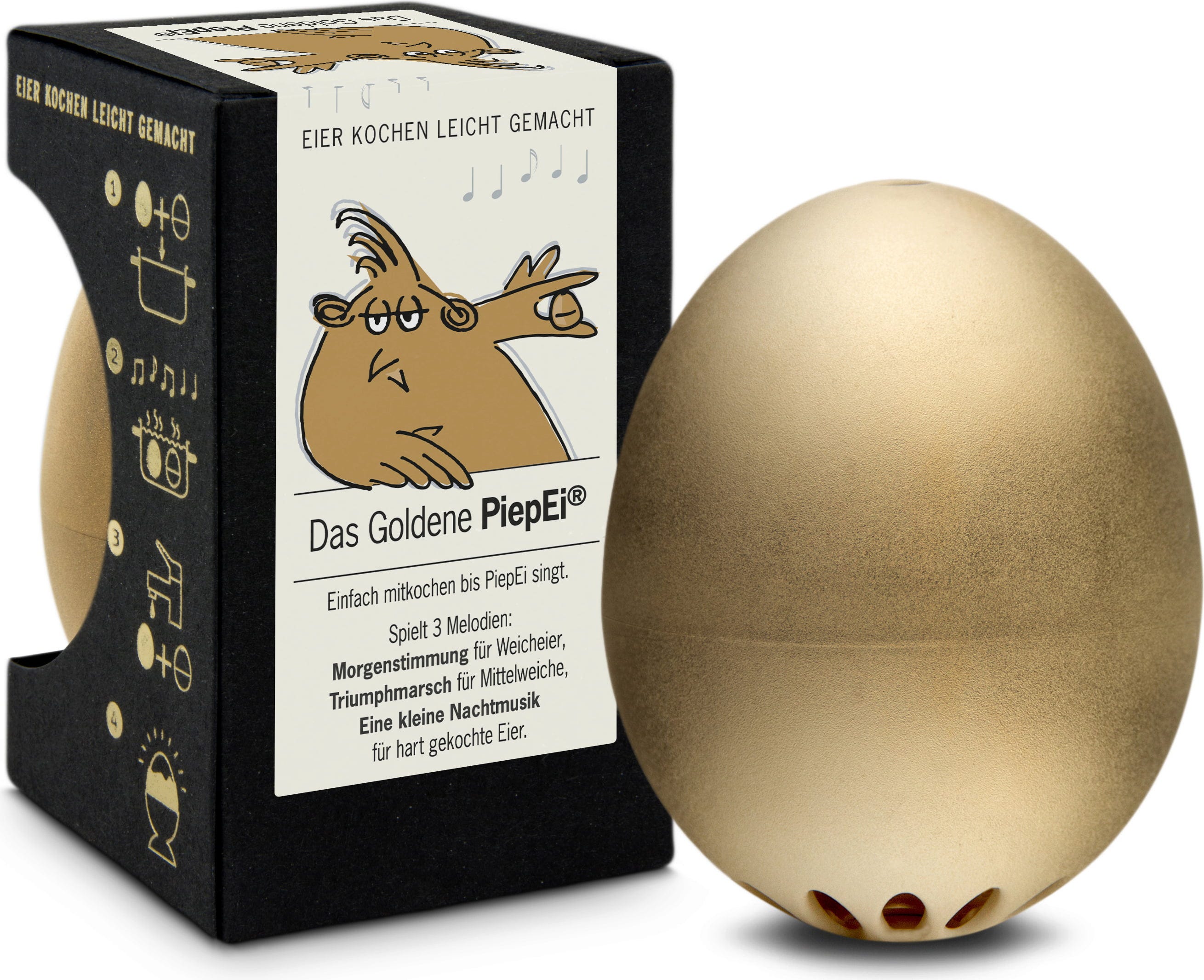 Einfach das Das Goldene PiepEi mit den Eiern lagern, gemeinsam kochen und warten, bis die Melodie des gewünschten Härtegrades spielt. Unabhängig davon, mit welcher Wassertemperatur man startet, welche Eiergröße und auf welcher Höhe gekocht wird.