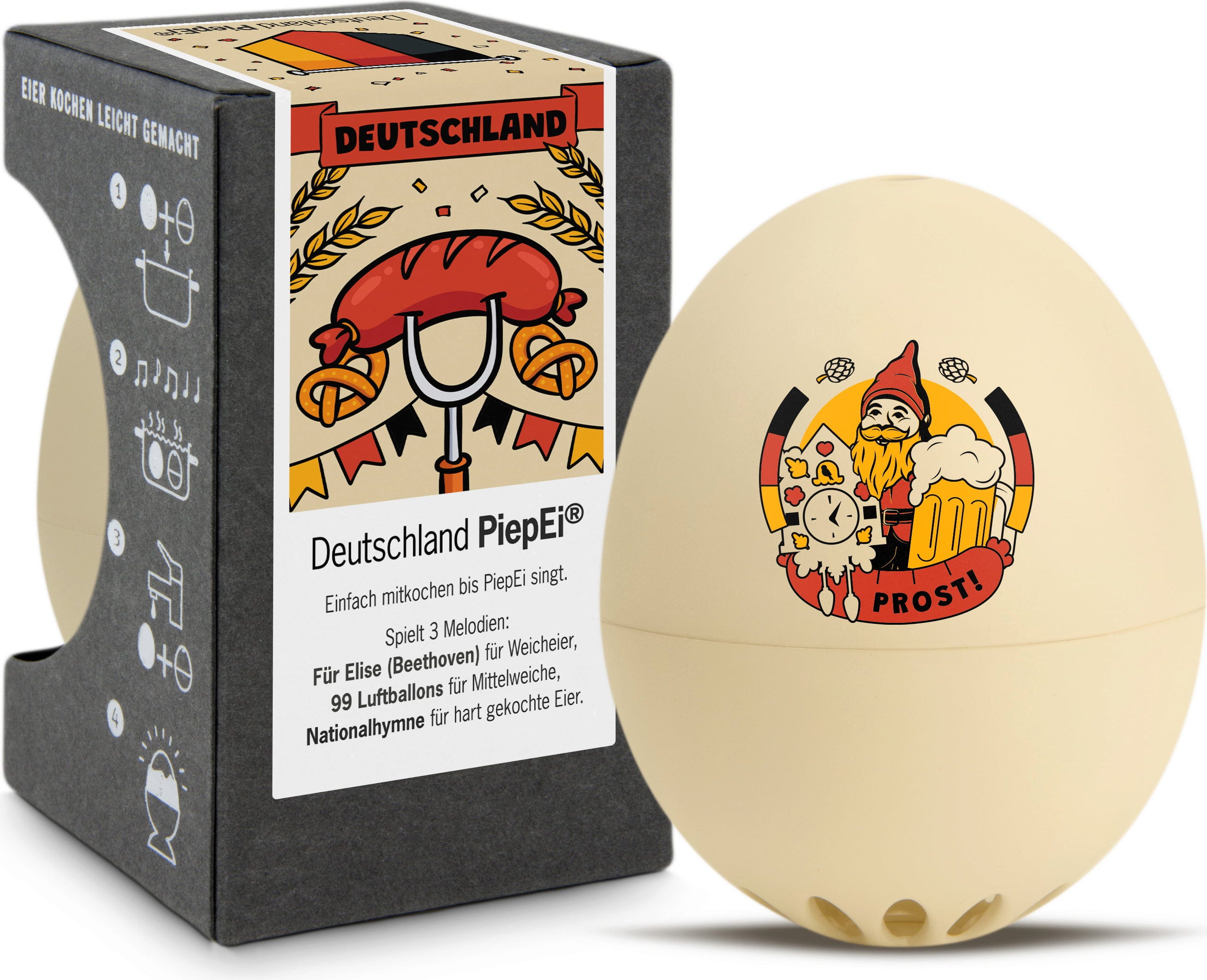 Man kennt es – gekochte Eier sind eine Wissenschaft für sich: Mal ist das Ei zu hart, mal ist das Ei zu weich. Das Deutschland PiepEi von Brainstream ist der ideale Assistent zu deinem perfekt gekochten Ei.