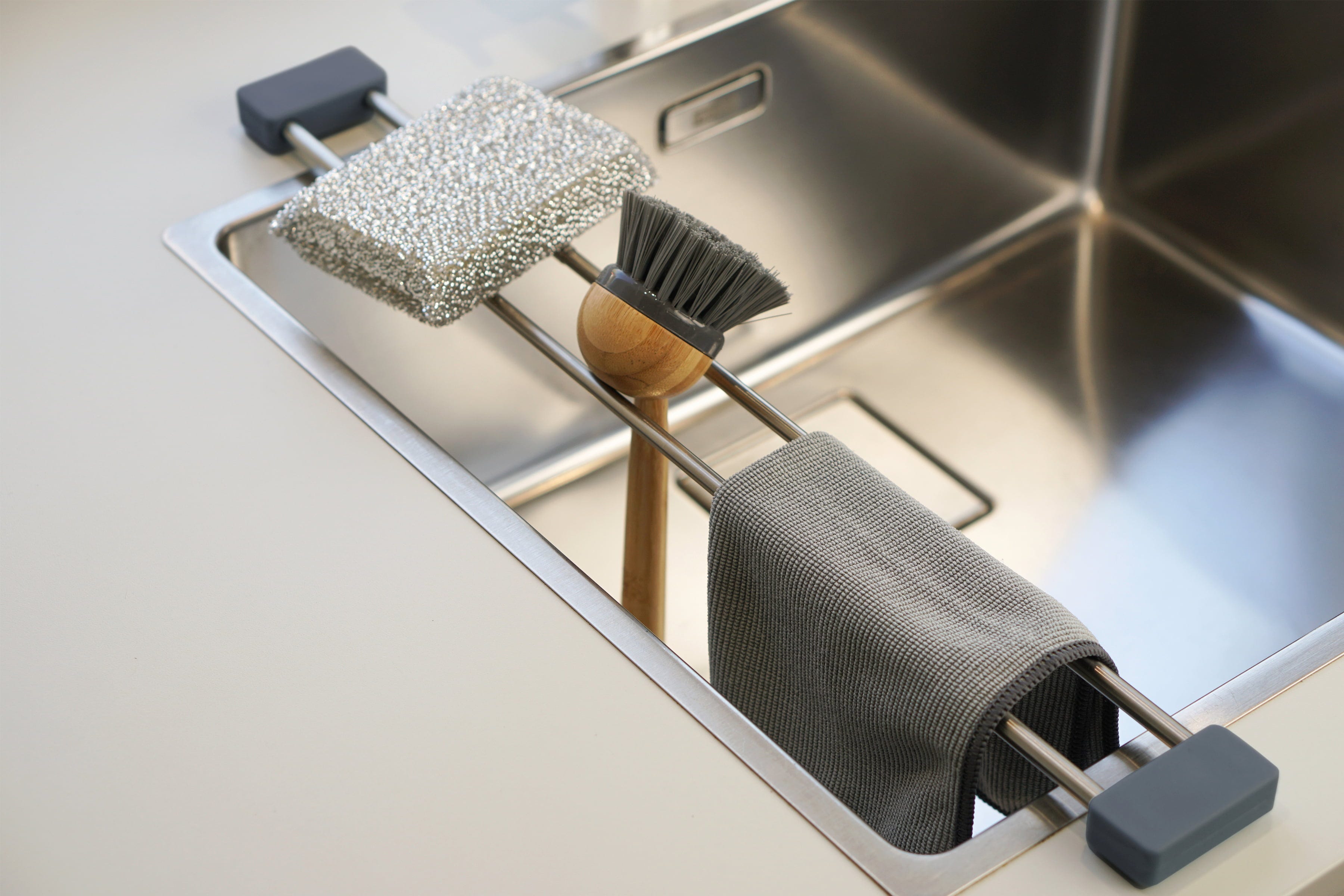 Verabschiede dich von feuchten Lappen und unhygienischen Keimschleudern an deiner Spüle. Mit drip.line schaffst du im Handumdrehen einen sauberen Platz für Schwämme, Bürsten und Tücher, damit diese optimal an der Luft trocknen können. Die Schiene ist flexibel ausziehbar und passt sich so fast jedem Spülbecken individuell an.