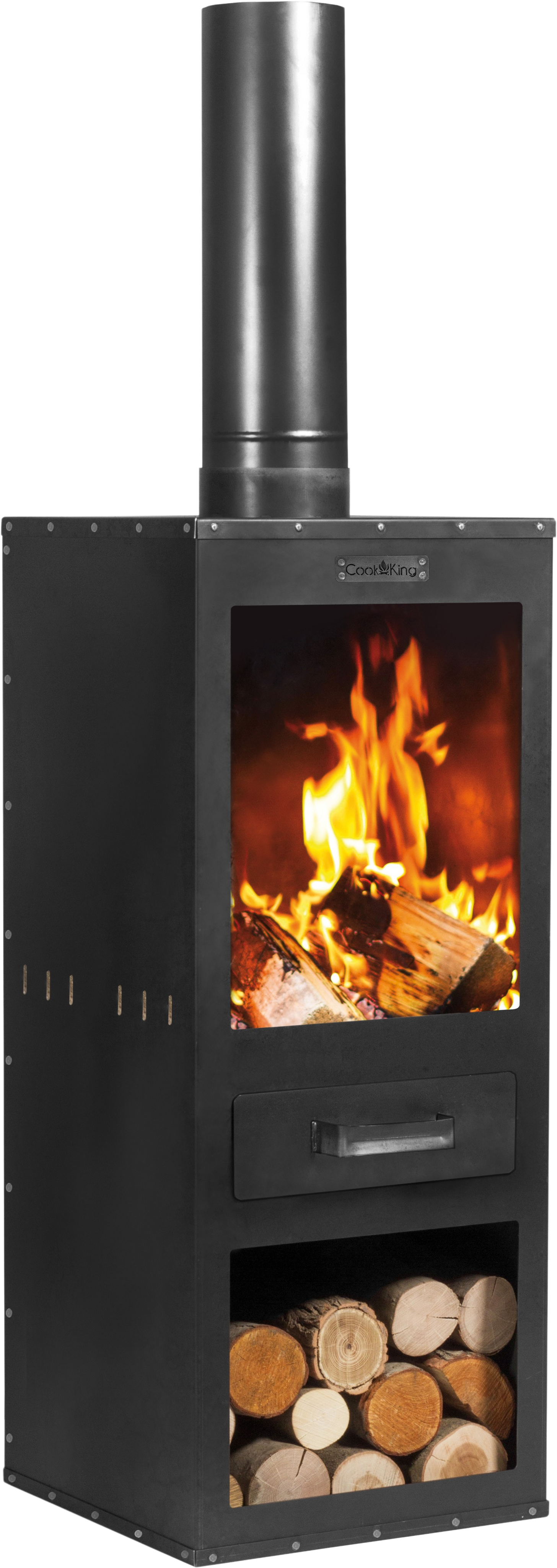 Der großzügige Brennraum nimmt mühelos größere Holzscheite auf und sorgt für ein beeindruckendes Flammenbild, während der markante Rauchabzug dafür sorgt, dass du und deine Gäste den Abend ohne störende Rauchentwicklung genießen könnt. Besonders durchdacht ist das Handling: Im Sockel des Ofens findest du ein integriertes Holzlager, damit der Nachschub immer in Griffweite bleibt.