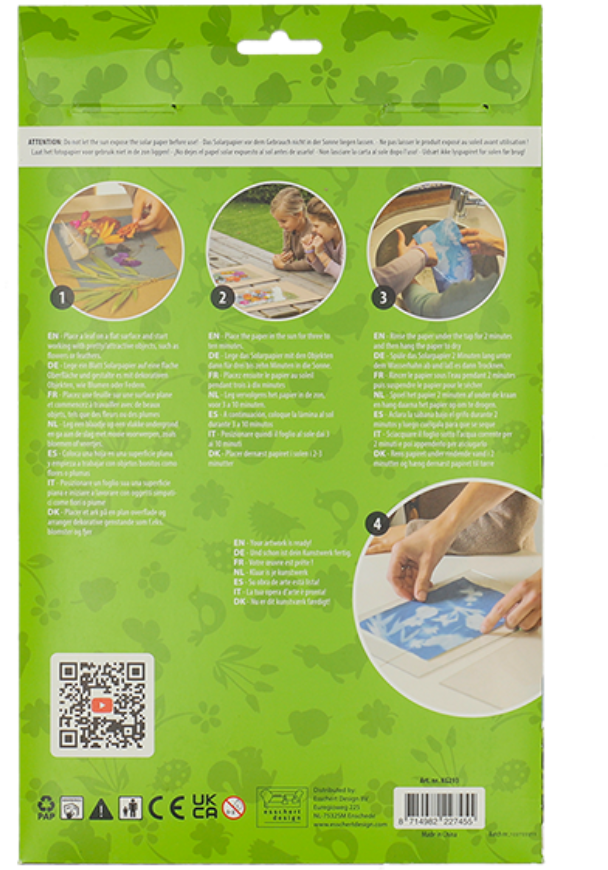 Mit diesem Solarpapier kannst du ganz besondere Kunstwerke gestalten - und das nur mit der Kraft der Sonne! Das Papier reagiert nämlich auf UV-Strahlung und lässt so wundervolle Motive entstehen. Suche einfach etwas Schönes wie Blätter, Blüten oder Federn und lege es auf das Papier. nach rund 10 Minuten in der Sonne kannst du die Objekte wieder entfernen. Spüle das Papier nun noch 2 Minuten lang unter fließendem Wasser ab, um das Motiv zu entwickeln und zu fixieren. Hänge es dann zum Trocknen auf und freue dich über ein ganz besonderes Kunstwerk.