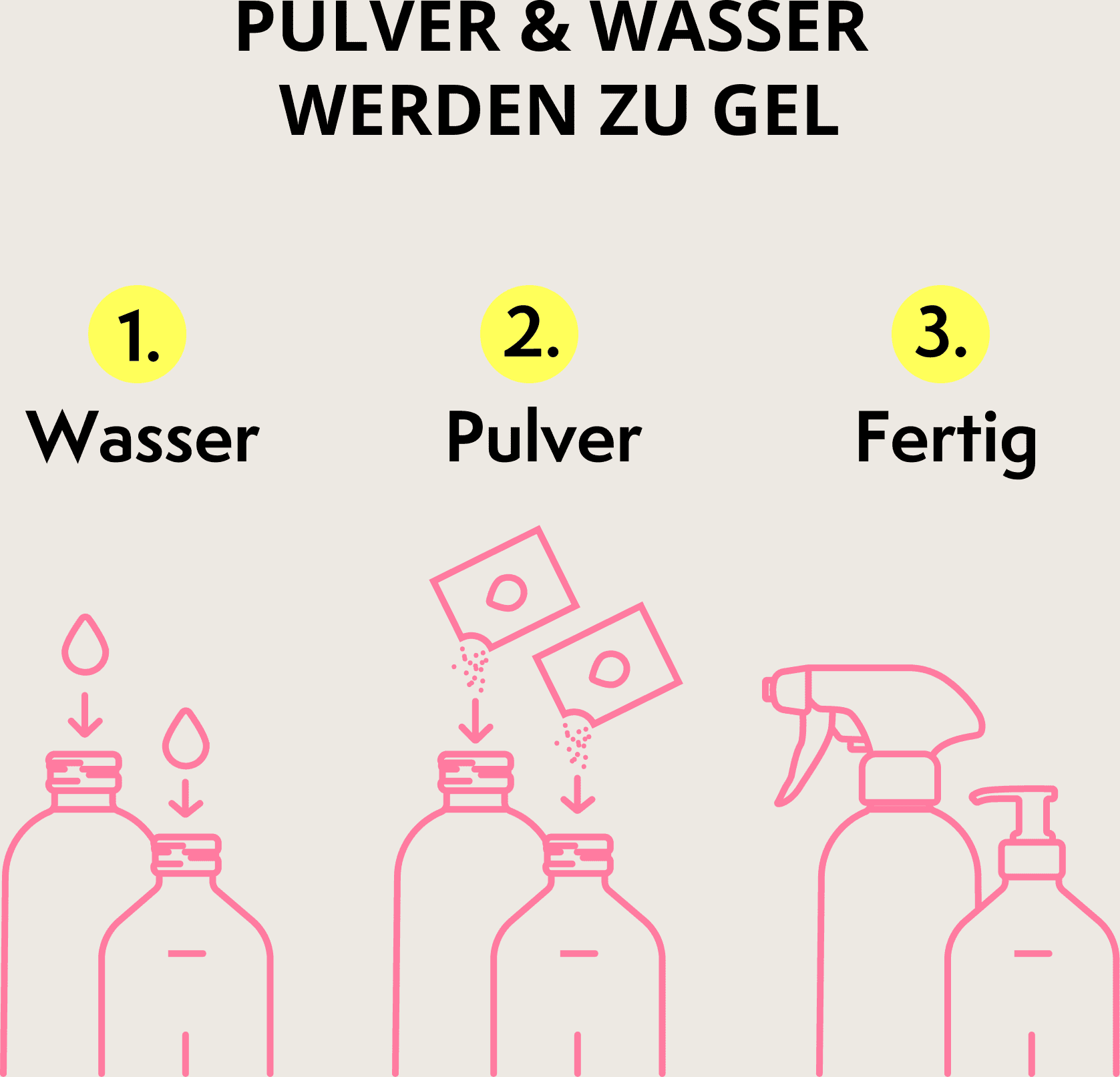 Hinweis: Beim Auflösen des Pulvers kann sich Druck in der Flasche bilden. Öffne die Flasche vorsichtig und halte die Öffnung von dir weg.