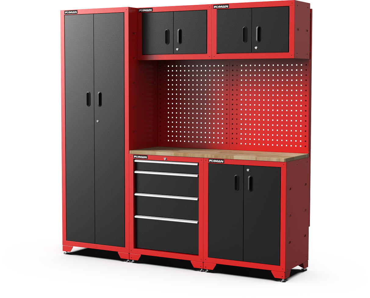 Ergänzt wird das System durch praktische Lochwände, an denen du Kleinteile und Werkzeuge griffbereit auf Augenhöhe platzieren kannst. Damit du auch auf unebenen Böden stets sicher arbeitest, lassen sich die Füße der Unterschränke individuell in der Höhe verstellen.