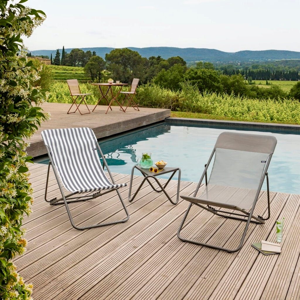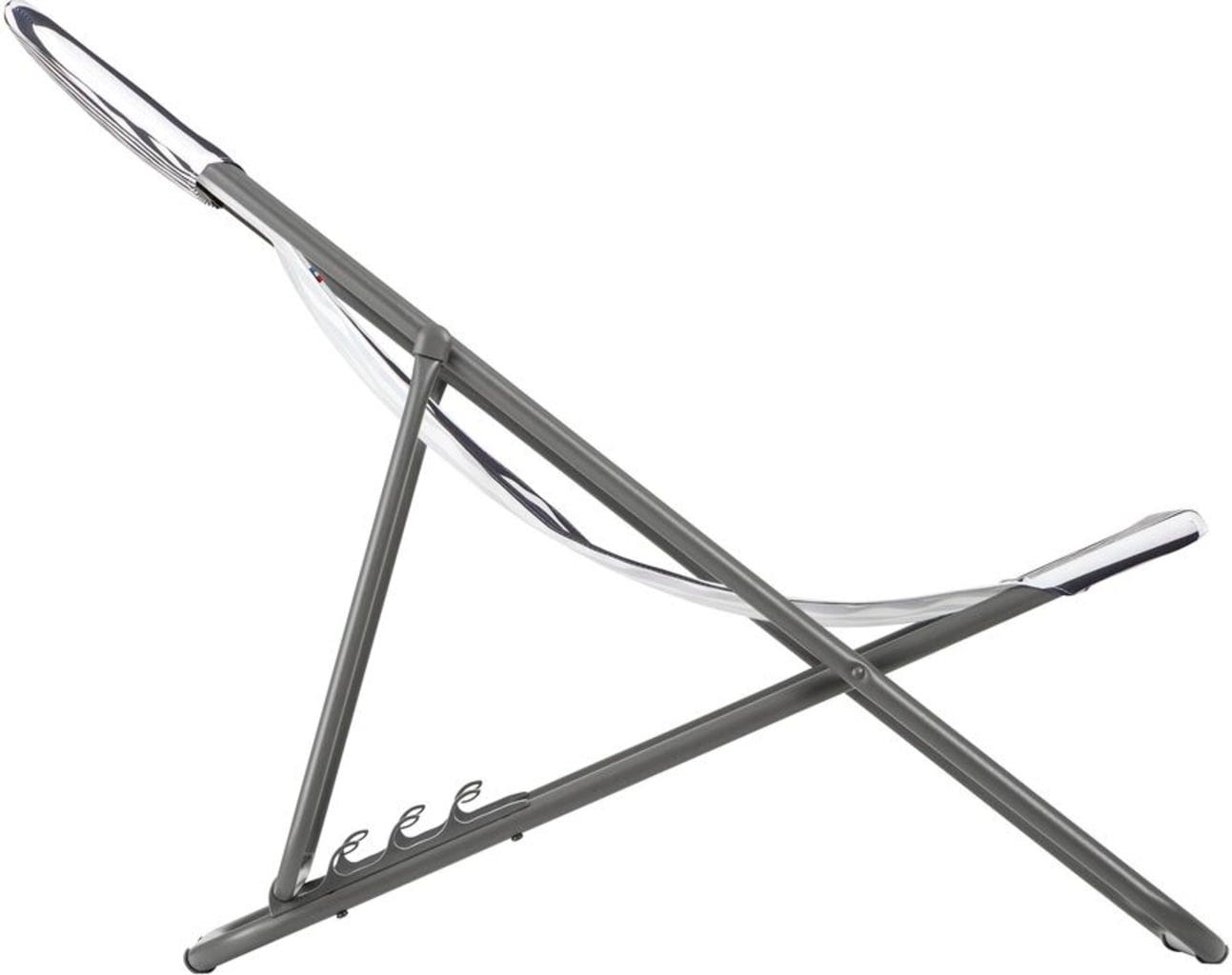 Erlebe mit dem MAXI TRANSAT Liegestuhl "Riviera" von Lafuma pure Entspannung auf einer besonders großzügigen Liegefläche, die dir durch den Verzicht auf störende Querstreben im Beinbereich absolute Freiheit bietet. Der hochwertige Airlon-Stoff im eleganten Streifen-Look ist nicht nur robust und bequem, sondern bringt auch sofort maritimes Flair auf deine Terrasse oder an den Pool.