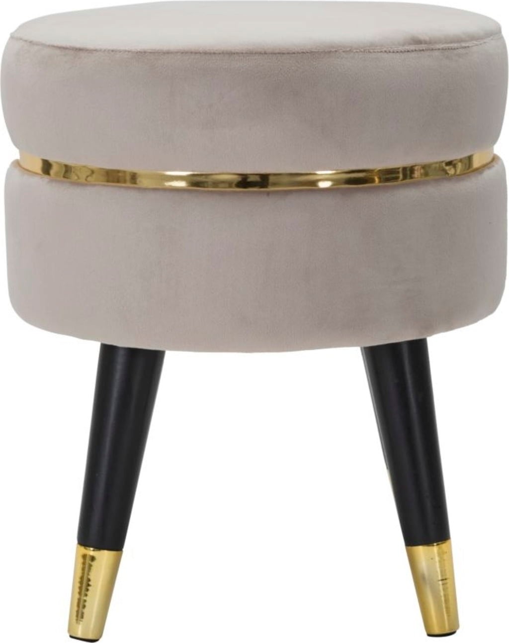 Ein auffälliger, goldfarbener Metallring umschließt die Sitzfläche und sorgt für einen funkelnden Akzent. Getragen wird der Hocker von schrägen, schwarzen Holzfüßen, die mit goldenen Metallabschlüssen veredelt sind. Ideal als Beistellhocker im Wohnzimmer oder als stilvolle Sitzgelegenheit im Schlafzimmer!
