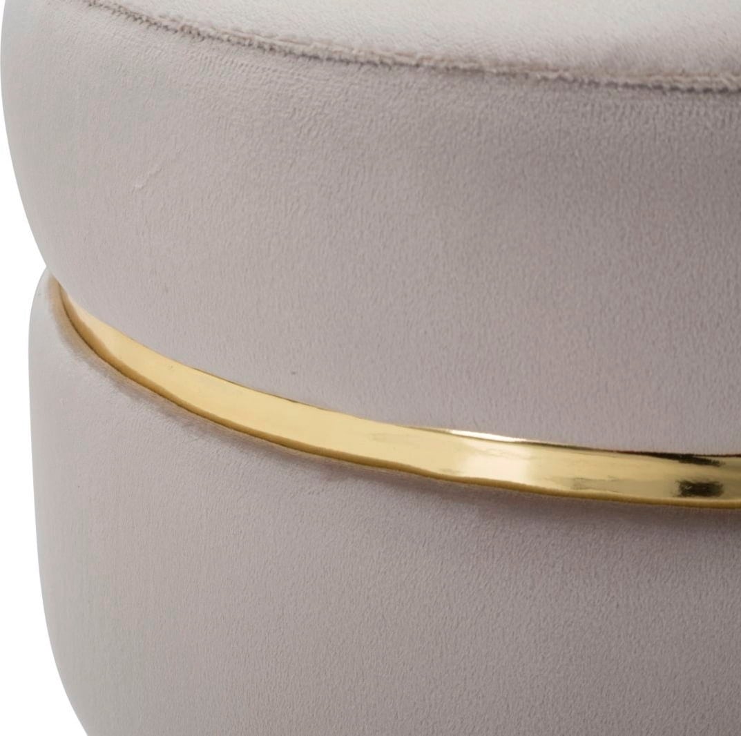 Erlebe einen Hauch von Hollywood-Glamour mit diesem eleganten, runden Hocker, dessen Design von den luxuriösen Ankleidezimmern großer Diven inspiriert ist! Er ist mit einem weichen, grauen Samtbezug gepolstert, der ihm eine luxuriöse Haptik verleiht.