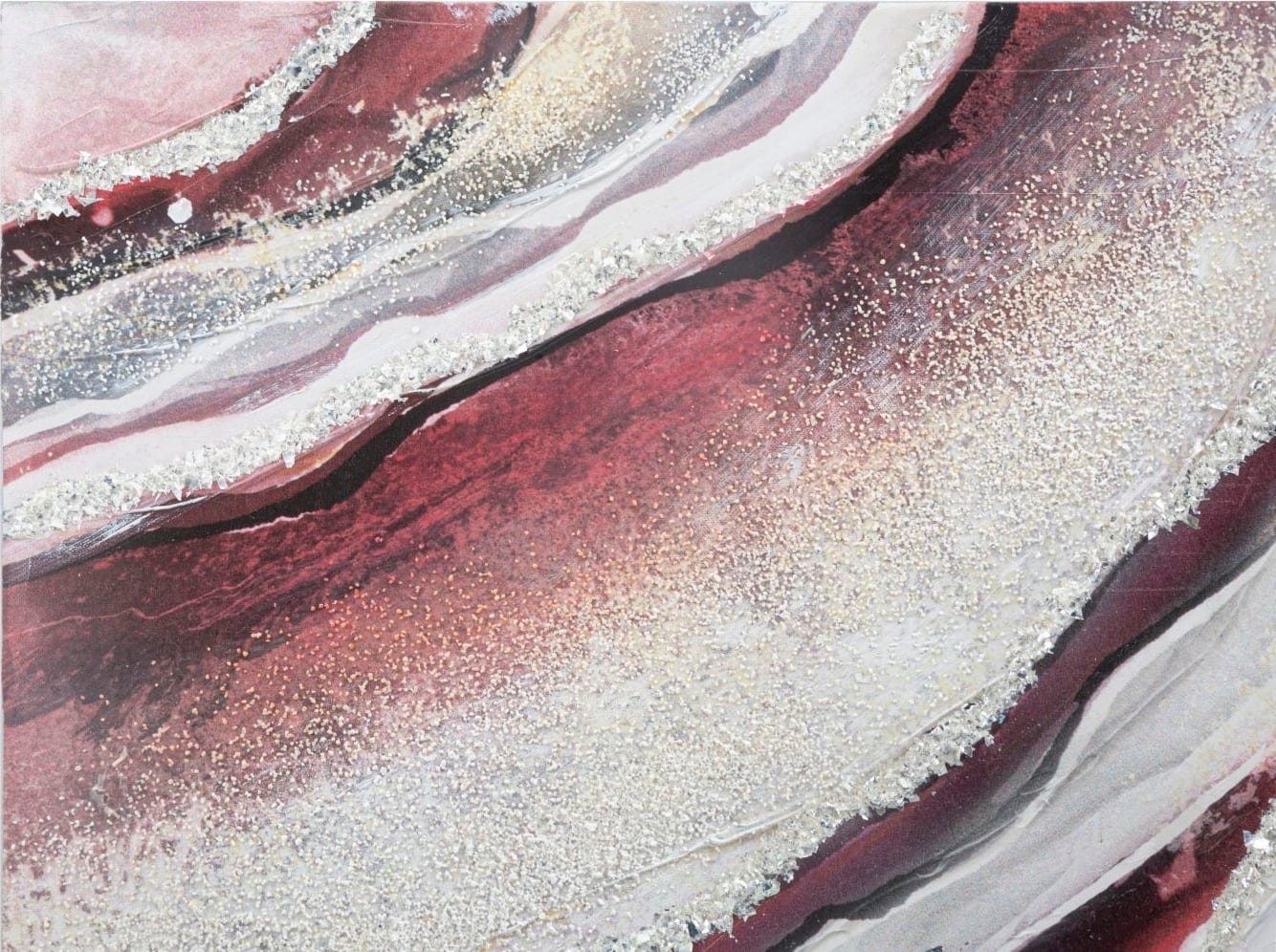 Das Design erinnert an die natürliche Schönheit eines edlen Achats oder einer geologischen Formation. Dynamische Wellen in kräftigem Rot, tiefem Burgunder und sanften Cremetönen fließen harmonisch ineinander. Das besondere Highlight sind die glitzernden, silbernen Akzente, die wie Adern aus wertvollem Quarz durch das Bild verlaufen und bei Lichteinfall für brillante Effekte sorgen. Aufgespannt auf einem stabilen Holzrahmen, bringt Redy einen Hauch von moderner Kunst und exklusiver Raffinesse direkt in dein Zuhause!