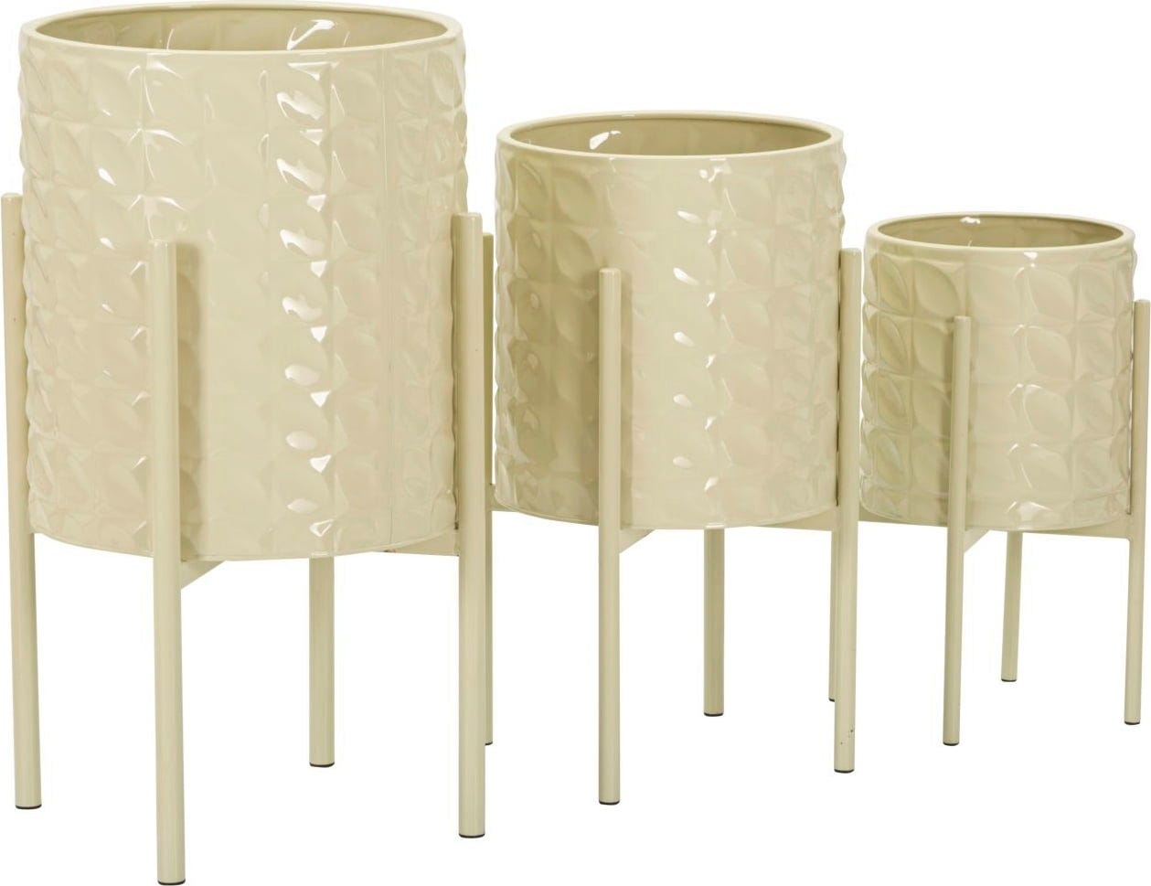 Verleihe deinem Raum mit diesem 3er-Set von Pflanztopfhaltern eine elegante und natürliche Note! Dieses Ensemble ist ein echtes Highlight und begeistert mit einem kühnen, modernen Design, das jeden Raum sofort erhellt. Die Pflanzgefäße aus robustem Metall beeindrucken durch ihr dezent glänzendes Finish und präsentieren sich auf schlanken, hohen Gestellen.