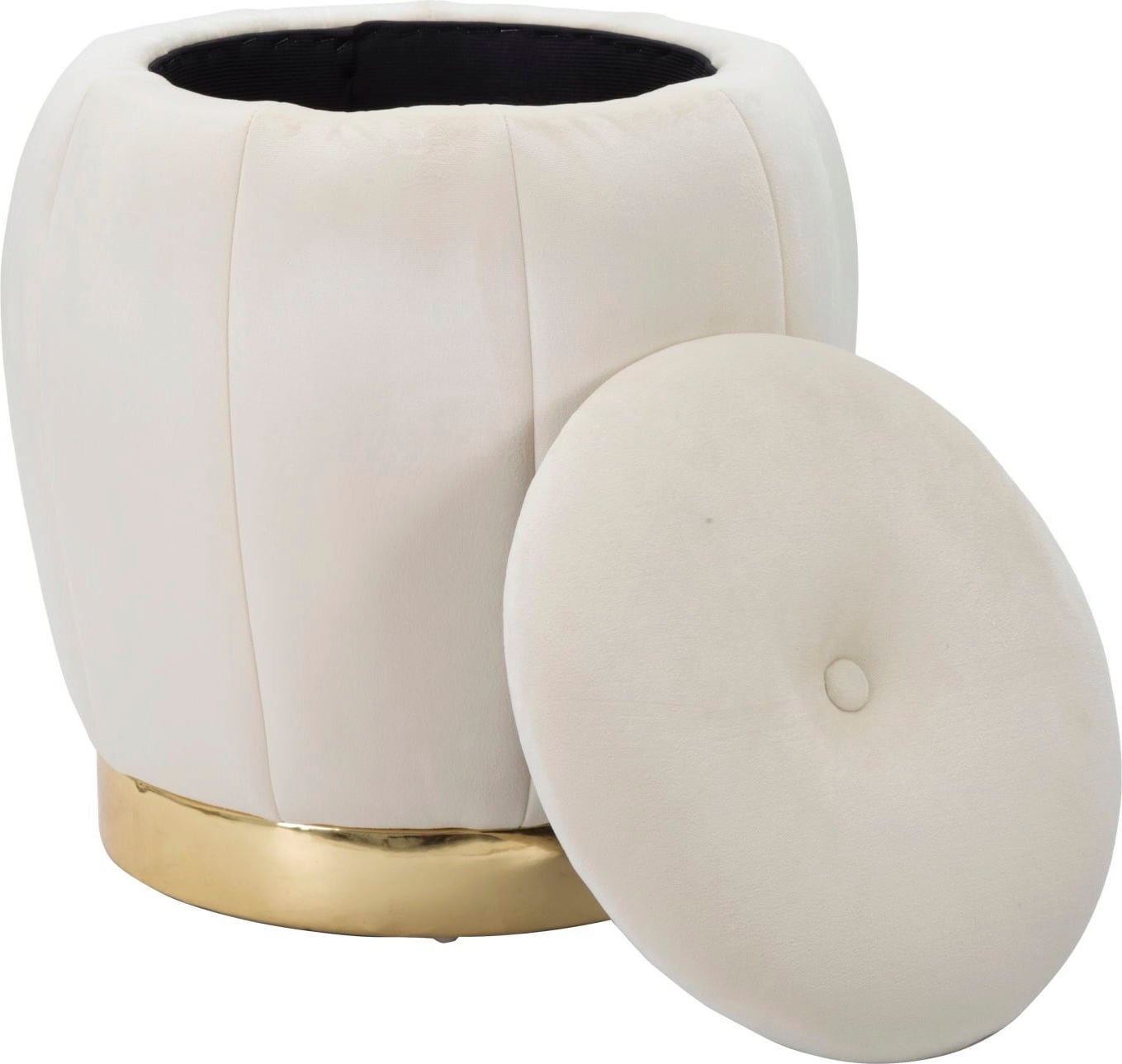 Setze einen glamourösen Akzent in deinem Wohn- oder Schlafzimmer mit diesem eleganten Pouf, dessen Design von den luxuriösen Ankleidezimmern großer Hollywood-Diven inspiriert ist! Er ist mit einem weichen, cremefarbenen Samtbezug gepolstert, der ihm eine luxuriöse Haptik verleiht.