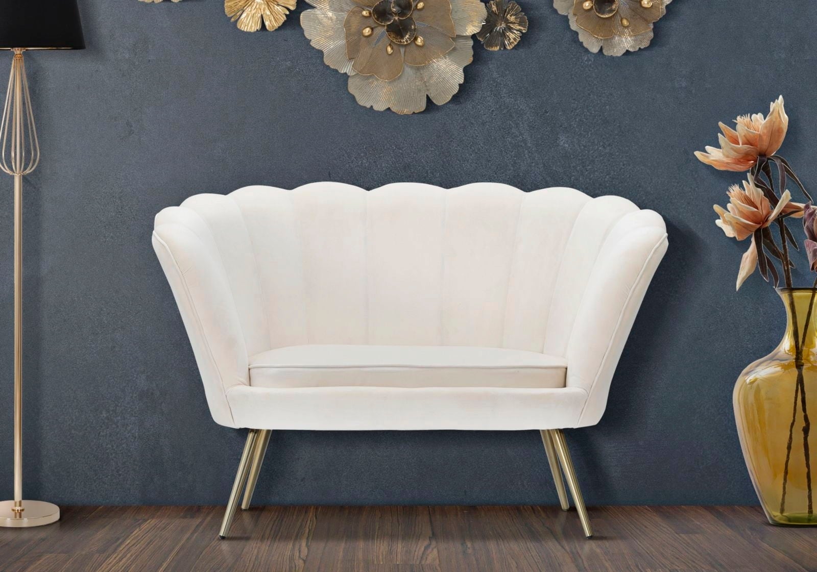 Setze ein stilvolles Statement in deinem Wohn- oder Schlafzimmer mit diesem außergewöhnlichen Zweisitzer-Sofa! Das Design besticht durch eine Rückenlehne, die in ihrer geschwungenen Form an filigrane Blütenblätter erinnert. Der cremefarbene Samtbezug verleiht dem Möbelstück zudem eine edle Haptik sowie eine sanfte Optik!