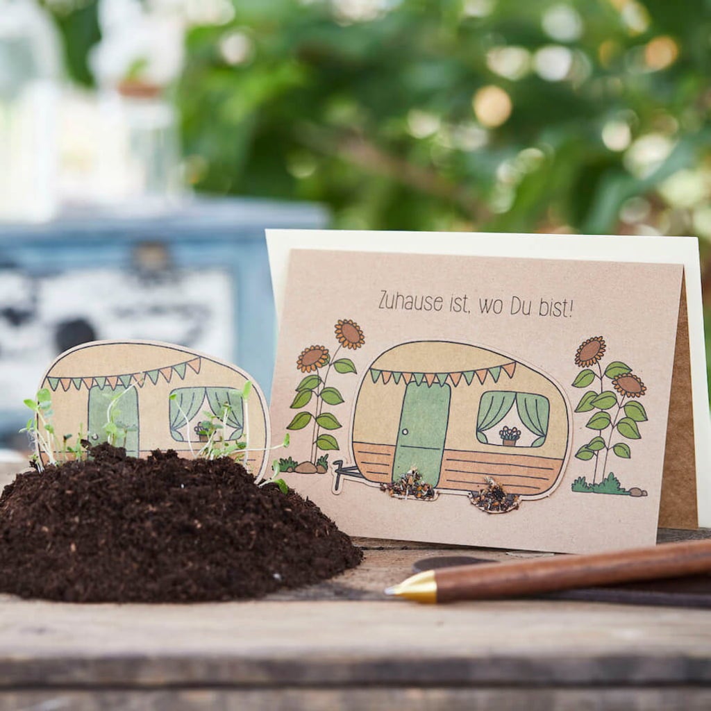 Da der Wohnwagen zusätzlich auf die Karte gedruckt ist, bleibt das Motiv auch nach dem Entfernen des Saatpapiers erhalten.