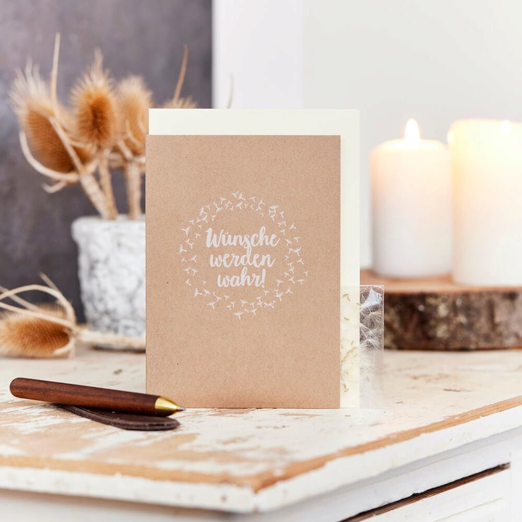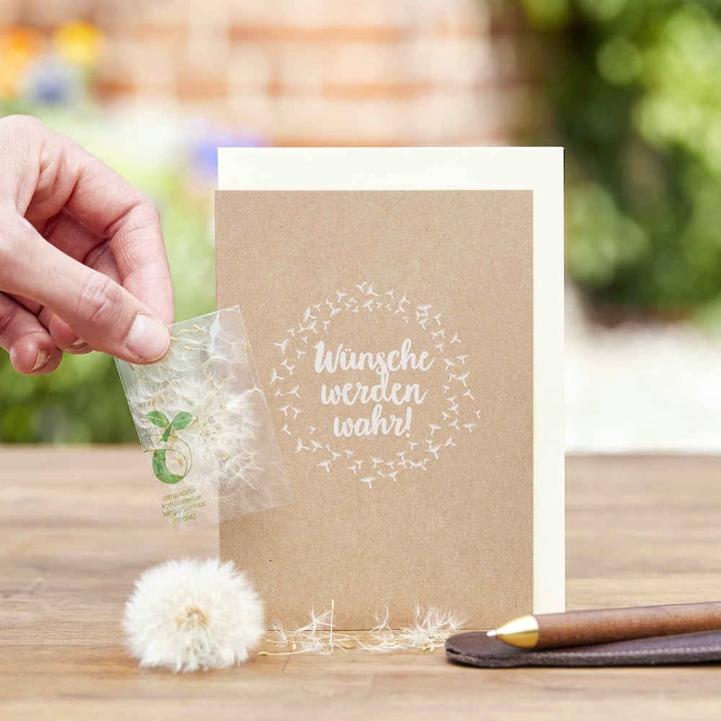 Diese liebevoll gestaltete Grußkarte ist perfekt, wenn du einem besonderen Menschen einen Herzenswunsch erfüllen oder einfach etwas Zuversicht für die Zukunft geben möchtest. Passend dazu enthält sie Saatgut für selbst gezüchtete Pusteblumen, die Wünsche ganz sicher wahr werden lassen - wenn man nur fest daran glaubt ;)