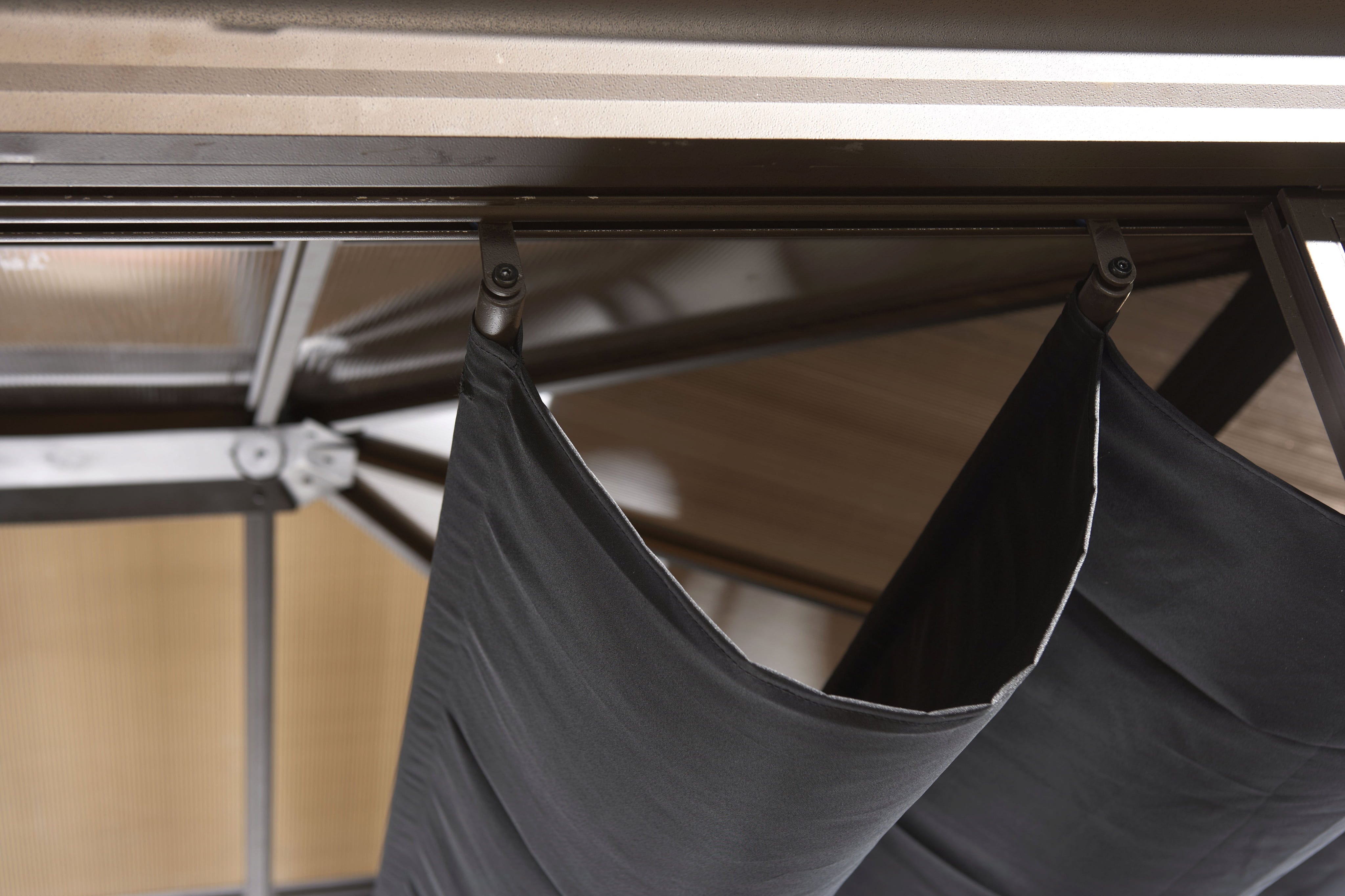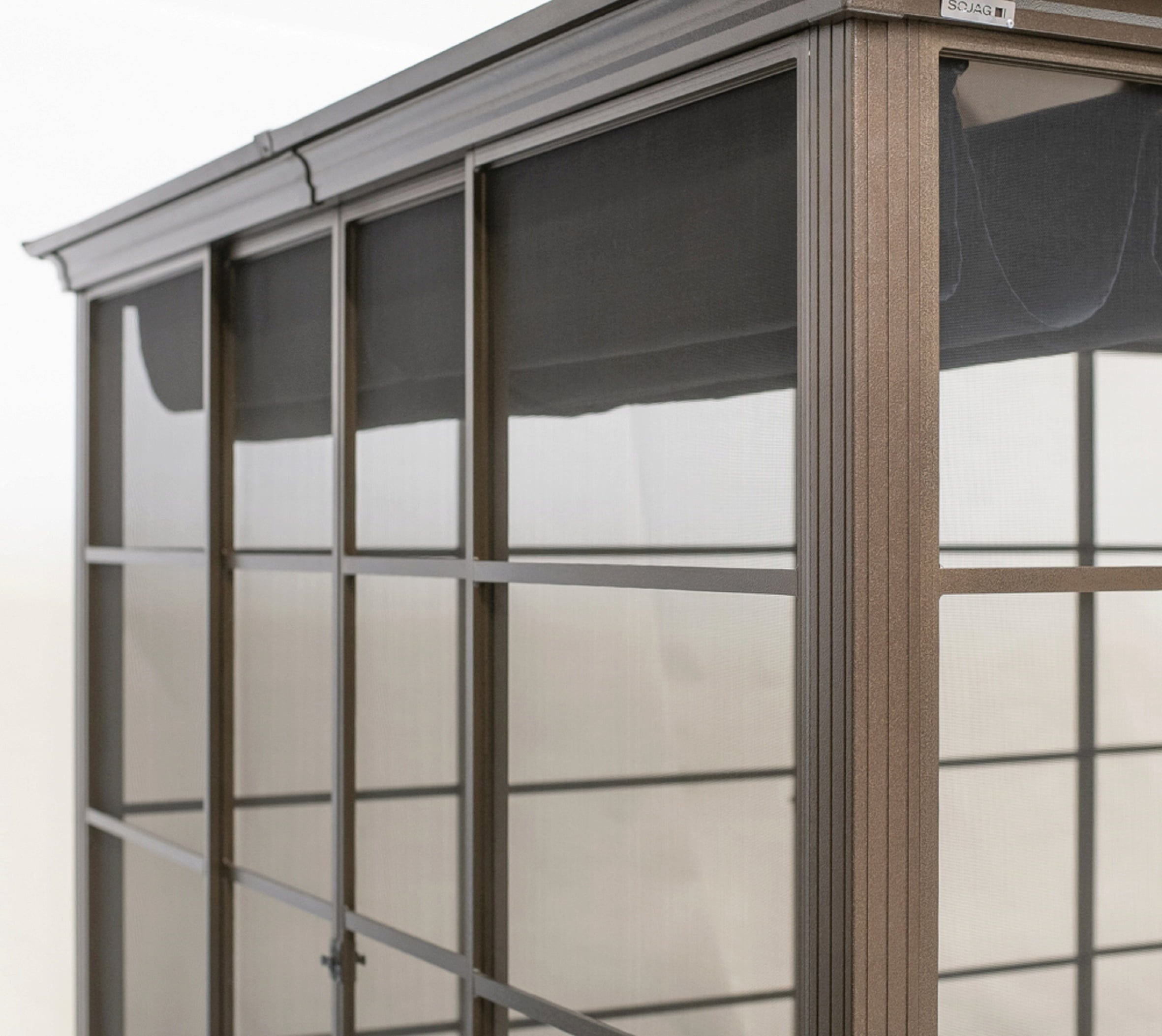 Die massive Konstruktion aus pulverbeschichtetem Aluminium und die edle Dachverglasung aus bronzefarbenen Doppelstegplatten bieten dir das ganze Jahr über einen geschützten Rückzugsort. Ein besonderes Highlight ist das integrierte Raffdach, welches du händisch spannen und so den Sonnenschutz ganz individuell an den Stand der Sonne anpassen kannst.