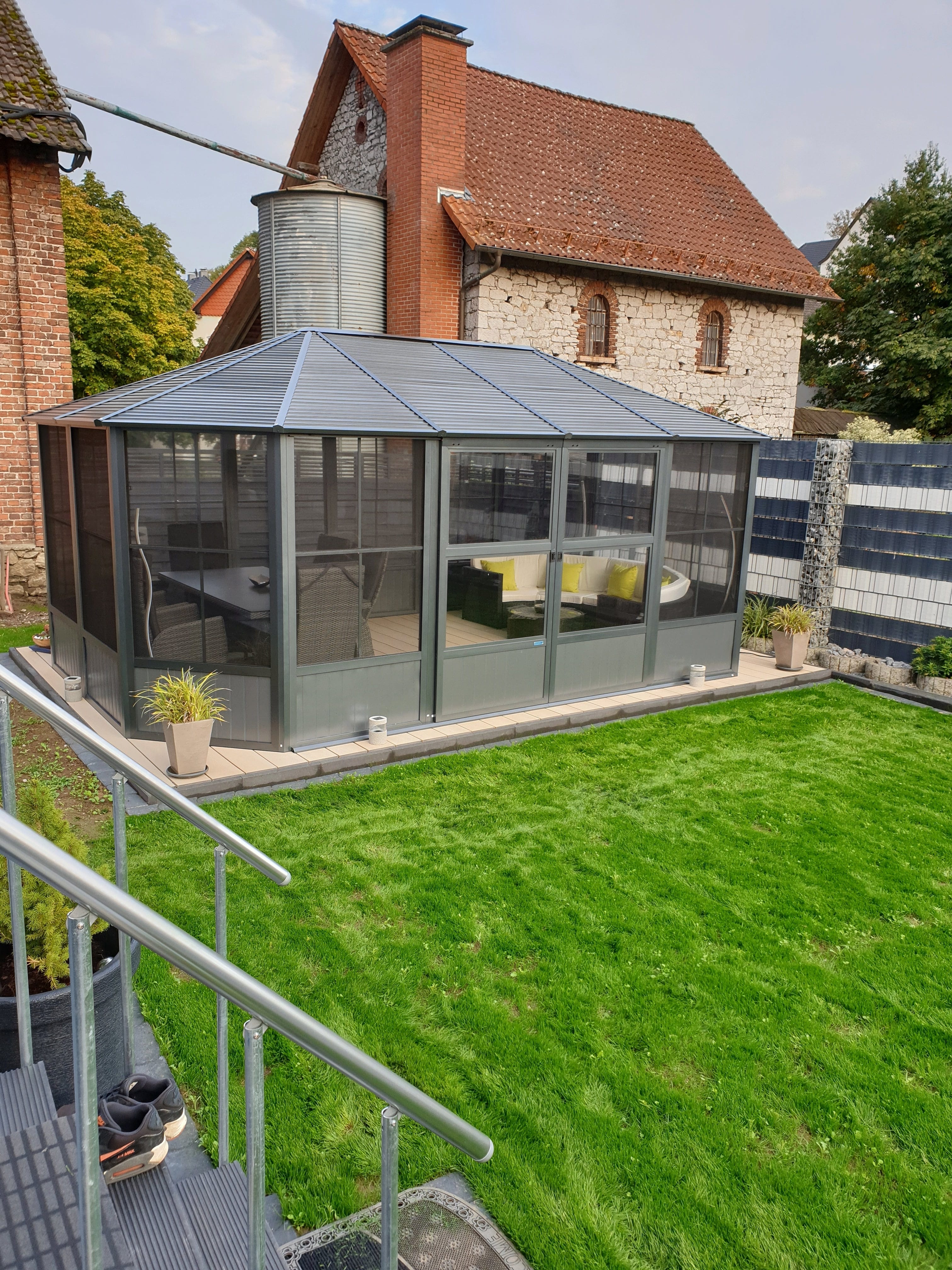 Als beeindruckender Hybrid aus Pavillon und Kaltwintergarten ermöglicht er dir, die Zeit an der frischen Luft bei jedem Wetter zu verlängern. Ob für ein entspanntes Frühstück, einen ruhigen Nachmittag mit einem Buch oder gesellige Abende mit Freunden und Freundinnen – diese imposante Gartenlaube bietet dir einen geschützten Rückzugsort.