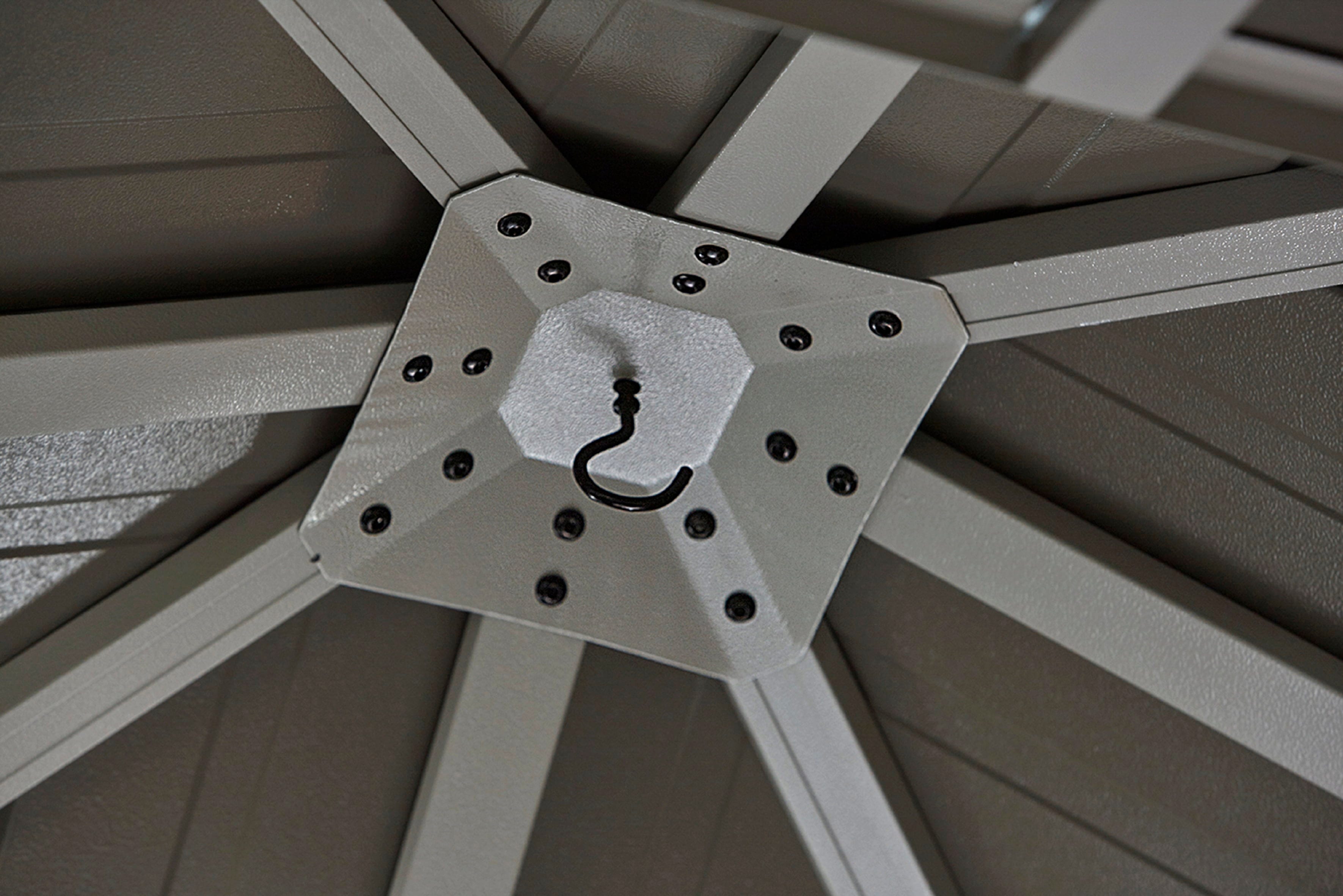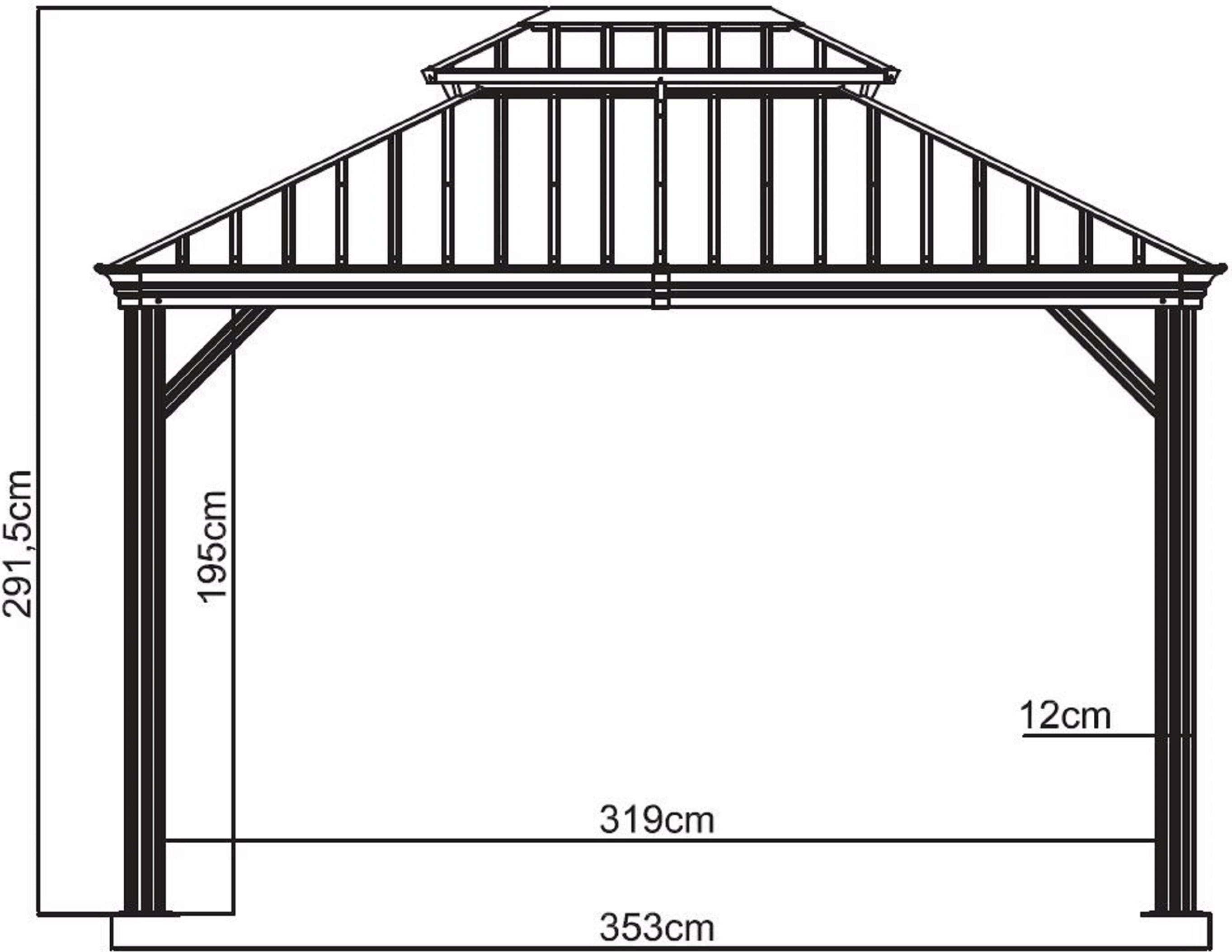 Dieser Blickfang vereint klassisches Design mit maximalem Nutzen und einer besonders soliden Konstruktion. Die tragenden Balken aus pulverbeschichtetem Aluminium verfügen über eine massive Pfostenstärke von 12 cm und sind dank Edelstahlschrauben äußerst witterungsbeständig. Das Dach aus galvanisiertem Stahlblech trotzt zuverlässig Wind und Wetter, sodass du deine Zeit im Garten das ganze Jahr über genießen kannst.