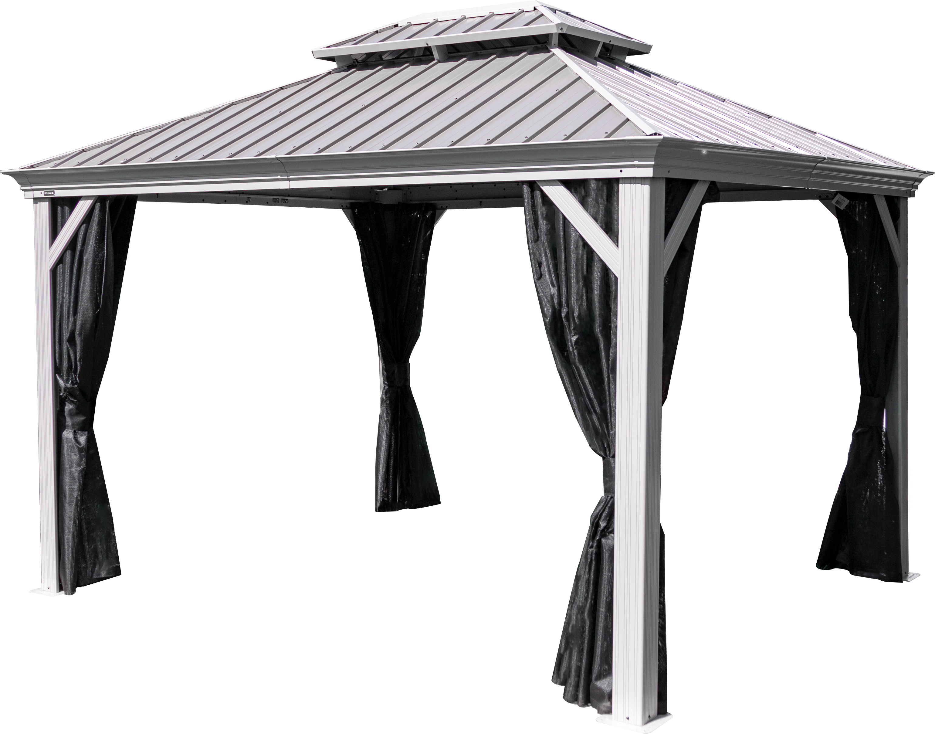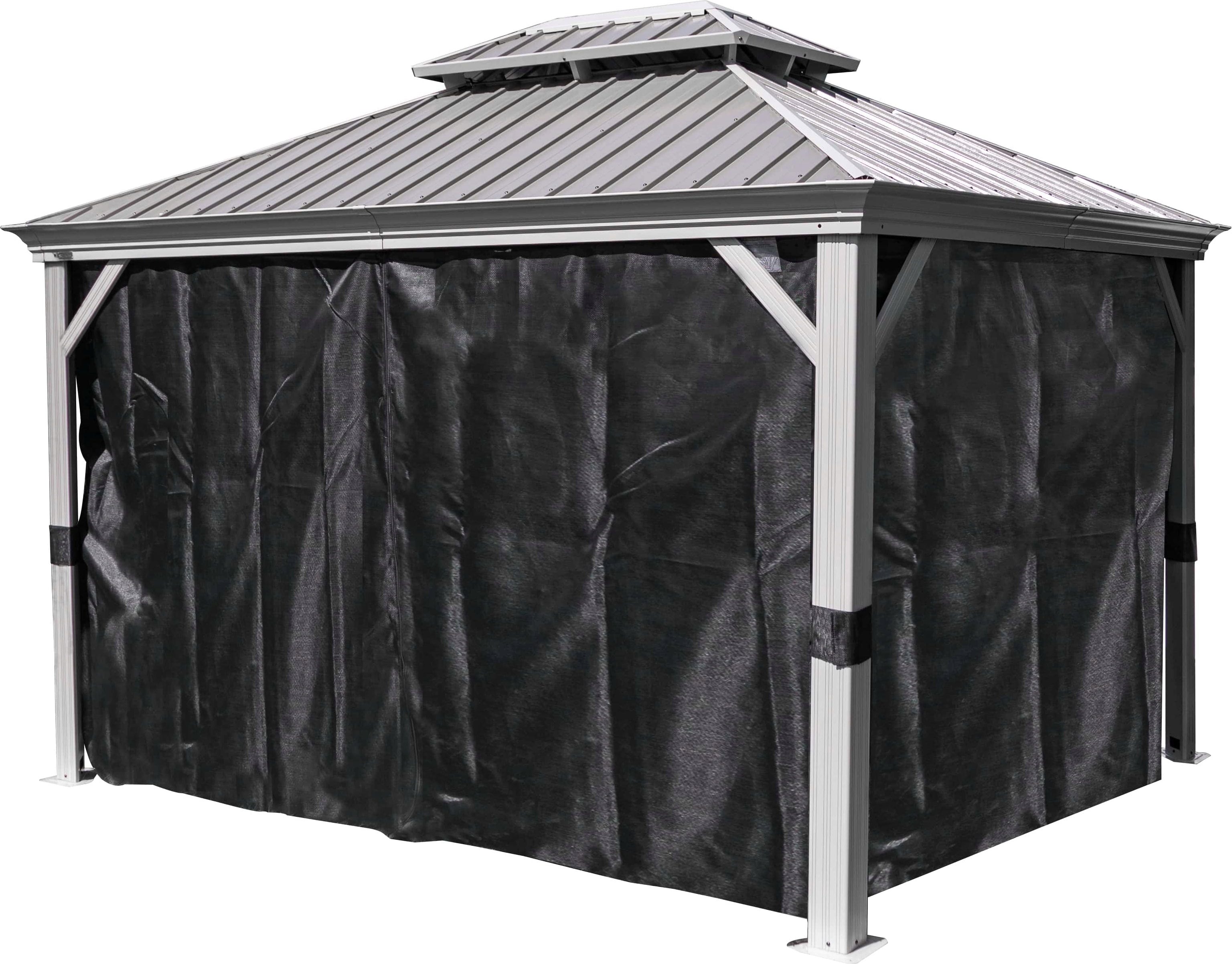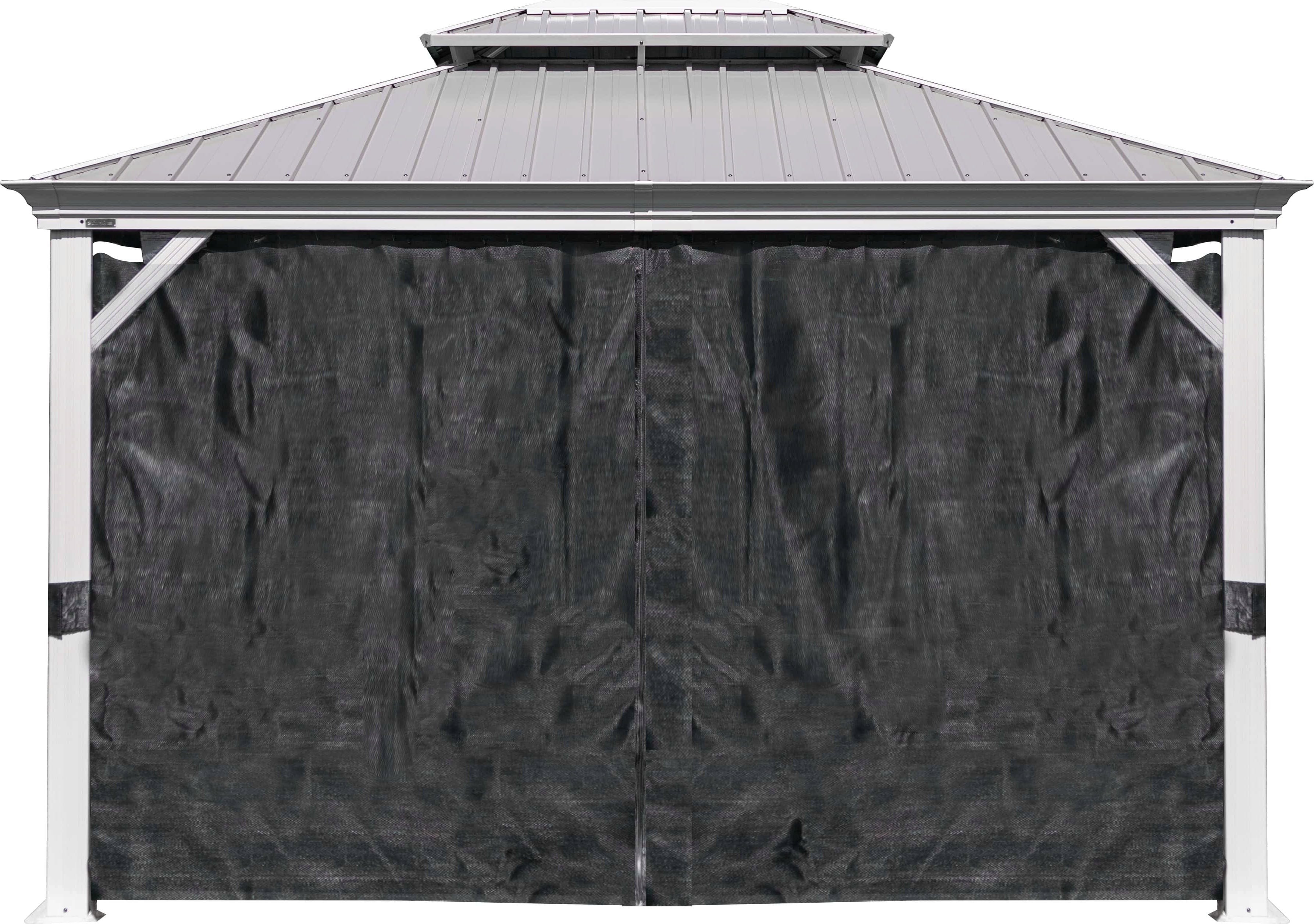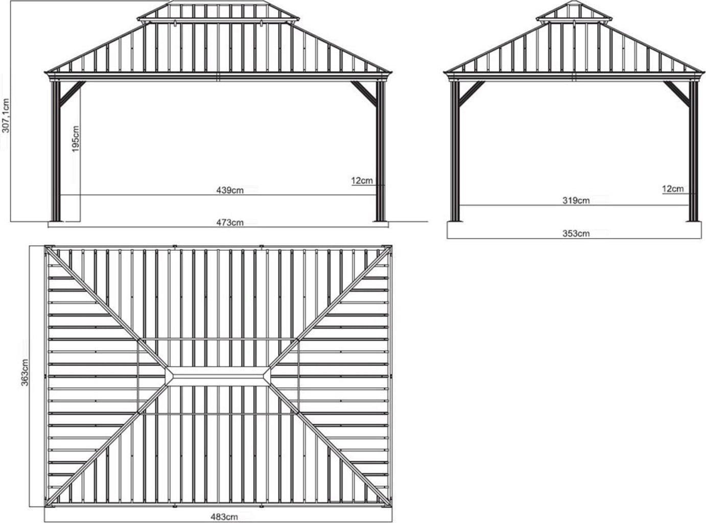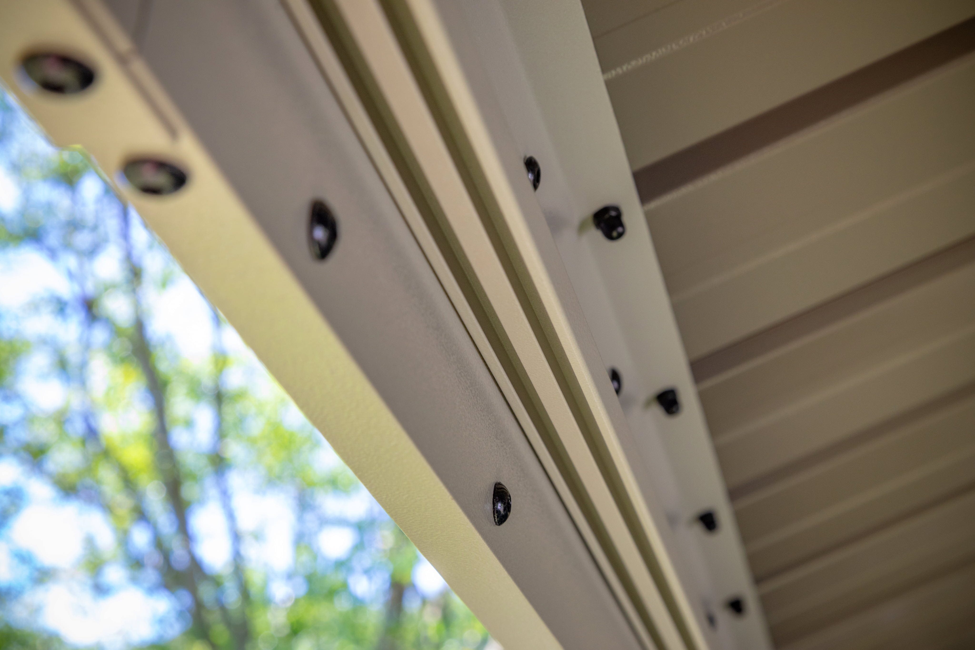 Die massive Konstruktion aus pulverbeschichtetem Aluminium mit 12 cm starken Pfosten bildet die Basis für das galvanisierte Stahldach, das Wind und Wetter zuverlässig trotzt. Das clevere doppelte Stahldach ist dabei nicht nur ein optisches Highlight, sondern garantiert durch den Windauslass eine stets angenehme Luftzirkulation unter deiner neuen Wohlfühloase.