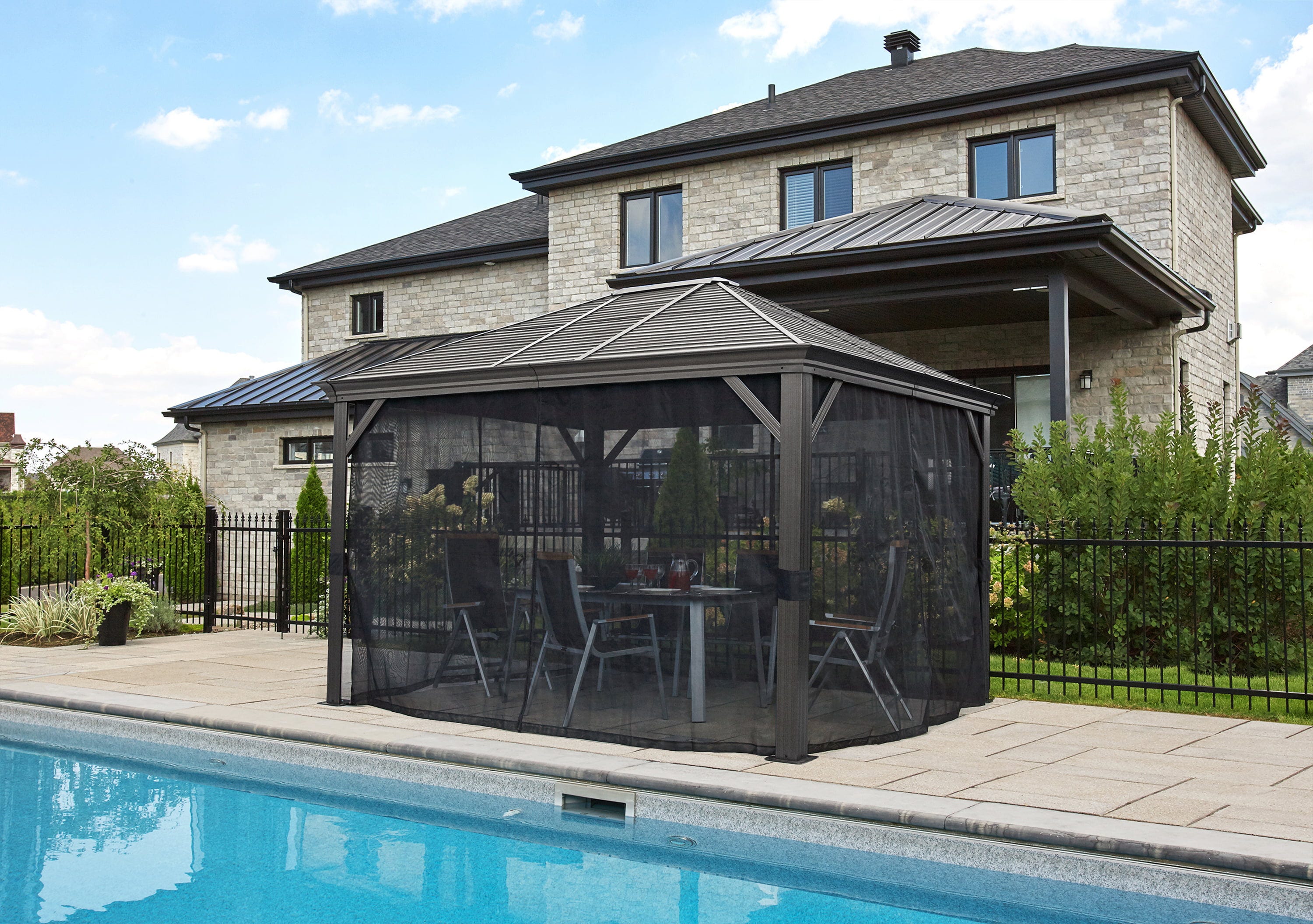 Ein funktionales Highlight ist das doppelte Stahldach aus galvanisiertem Blech: Es sieht nicht nur edel aus, sondern sorgt durch den integrierten Windauslass für eine optimale Belüftung und stets frische Luft unter dem Dach. Damit du deine Ruhe vor lästigen Insekten hast, sind die passenden Moskitonetze aus Nylon bereits inkl. – und dank der zweigleisigen Laufschienen kannst du sogar gleichzeitig optionale Vorhänge anbringen. Besonders clever für dich gelöst: Das integrierte Entwässerungssystem leitet Regenwasser diskret durch die Pfosten ab.