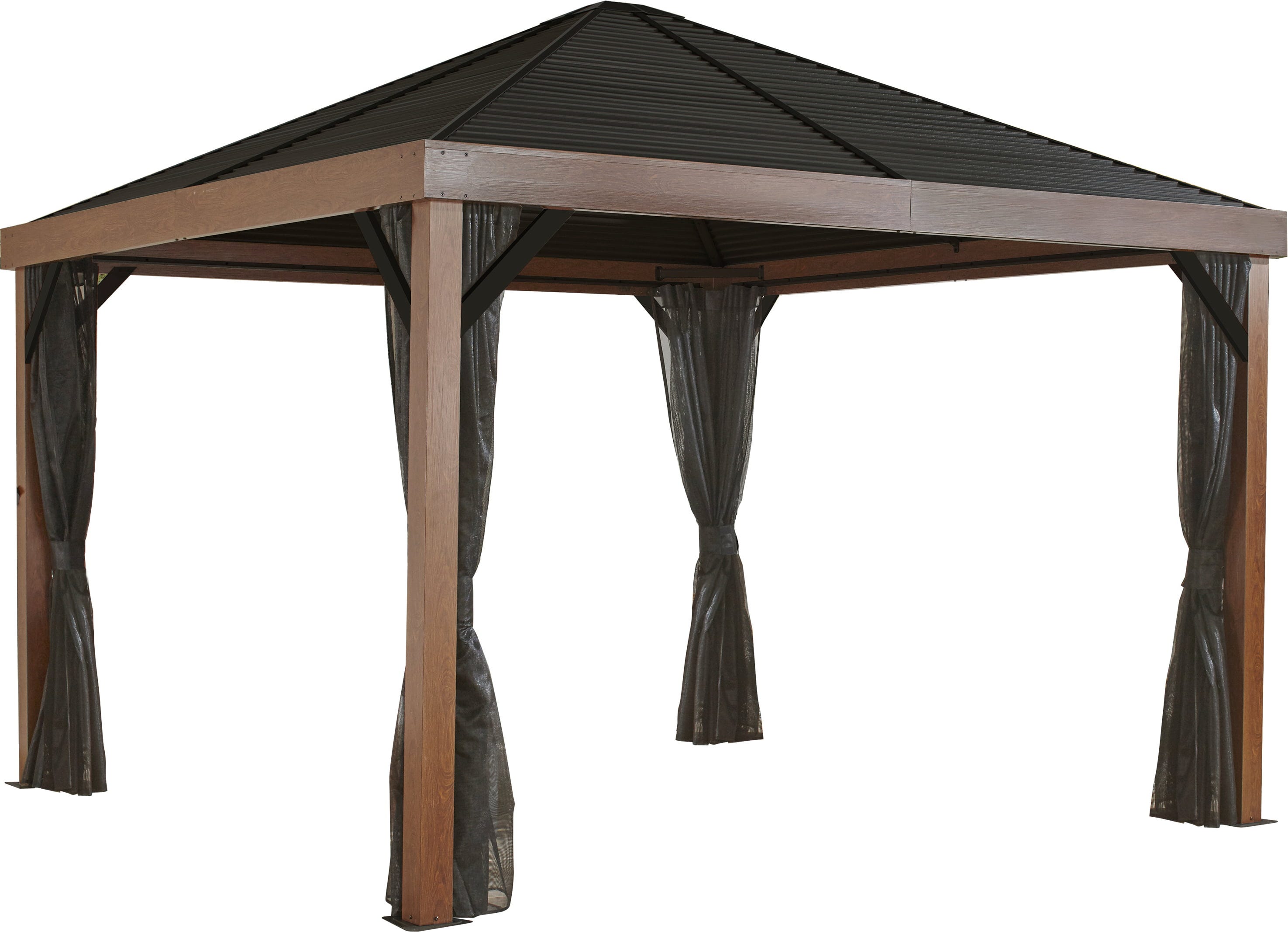 Das einzigartige geriffelte Spitzdach macht den Pavillon zum modernen Blickfang in deinem Garten. Dank der zweigleisigen Laufschienen kannst du die mitgelieferten PVC-Moskitonetze und optional erhältliche Vorhänge gleichzeitig nutzen.