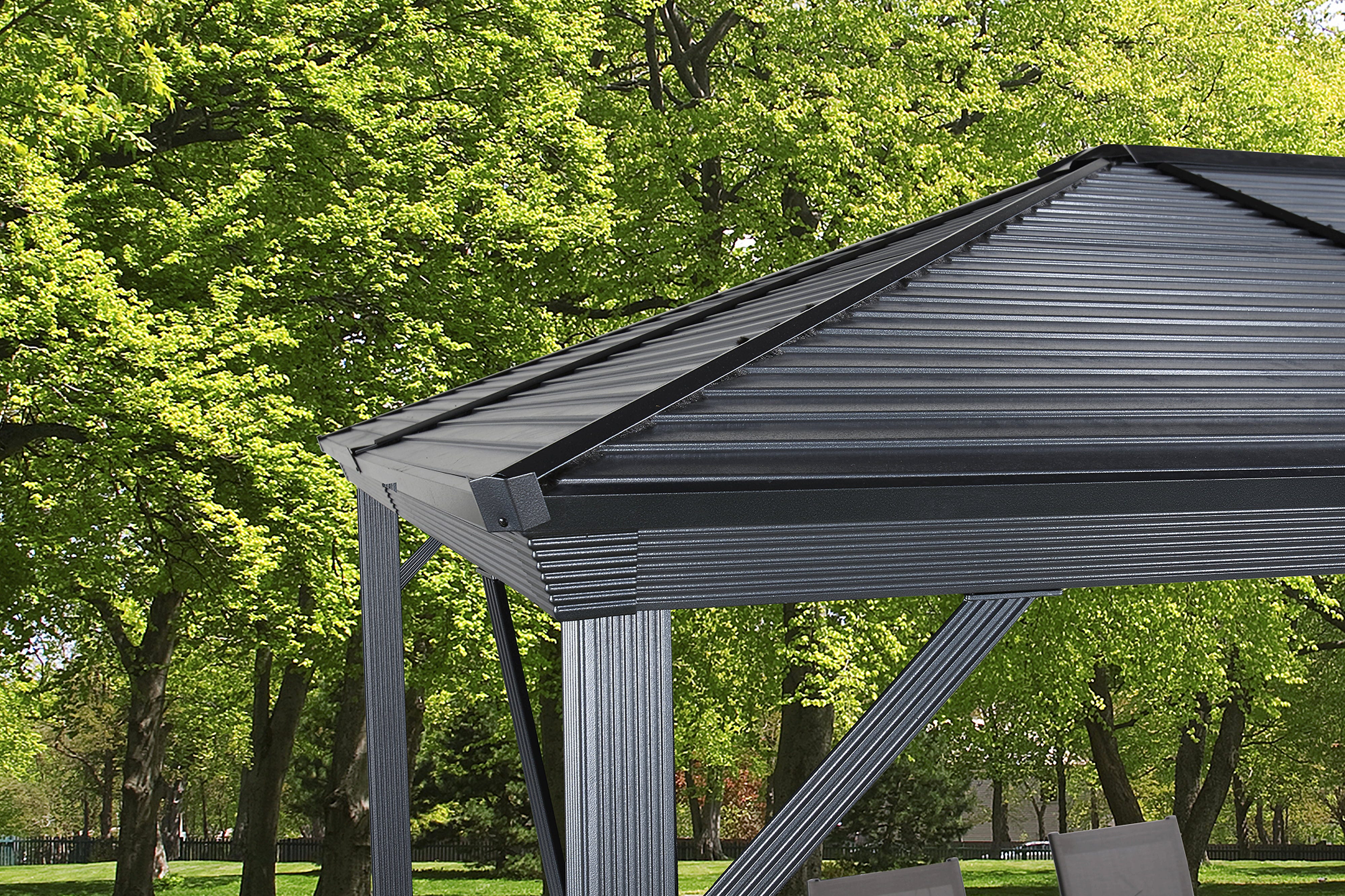 Hol dir die Qualität des kanadischen Marktführers SOJAG in deinen Garten! Der Premium Aluminium Pavillon Ventura überzeugt durch sein langlebiges Hard-Top aus formschönem Stahl, das im Gegensatz zu Stoffdächern extrem witterungsbeständig ist. Ob brennende Sonne, starker Regen oder hohe Schneelasten – diese massive Konstruktion im edlen Basaltgrau wurde speziell für den ganzjährigen Außenbetrieb entwickelt und muss im Winter nicht abgebaut werden.