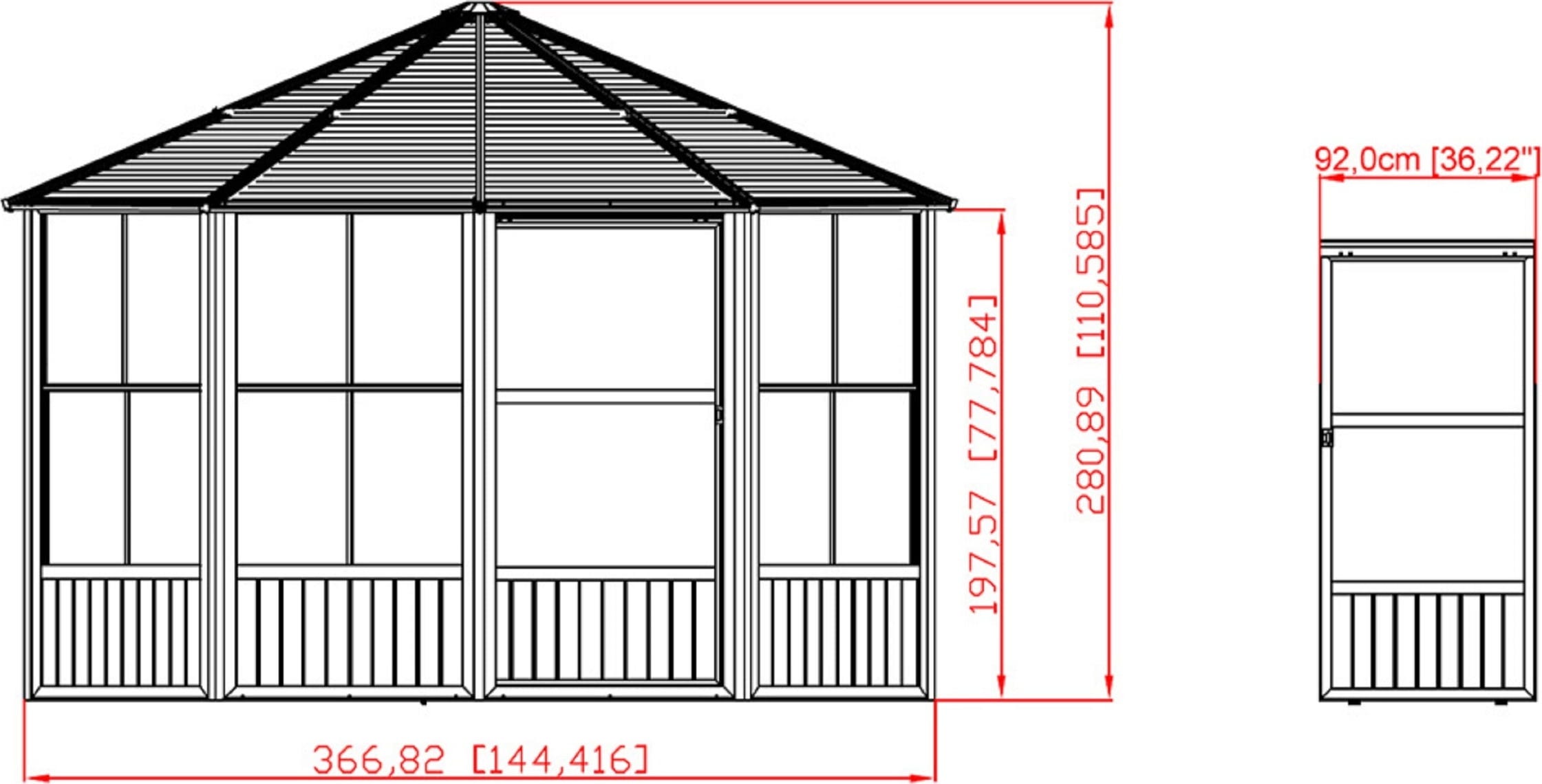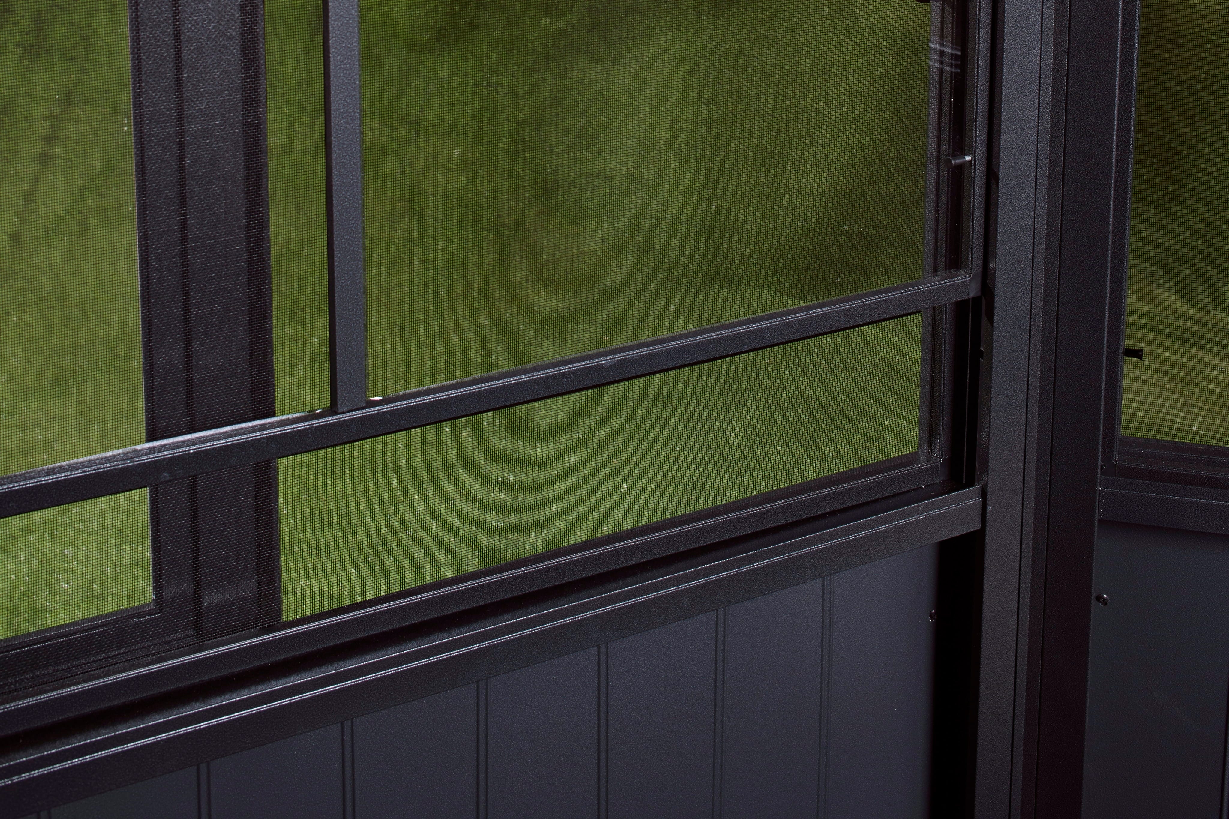 Die massive Konstruktion aus pulverbeschichtetem Aluminium und einem Dach aus galvanisiertem Stahl bietet dir das ganze Jahr über einen wetterfesten Rückzugsort. Das Besondere: Die 10 integrierten Fenster aus PVC-Folie lassen sich zum Lüften einfach nach unten schieben und sind komplett mit Moskitonetzen ausgestattet, sodass du stets geschützt vor Insekten die frische Luft genießen kannst.