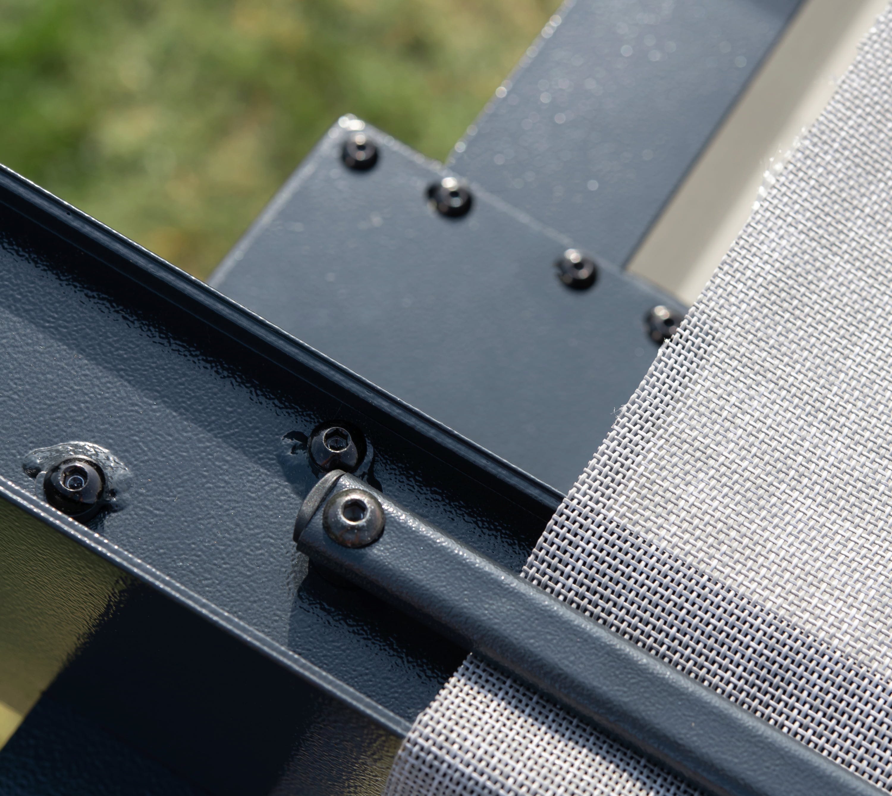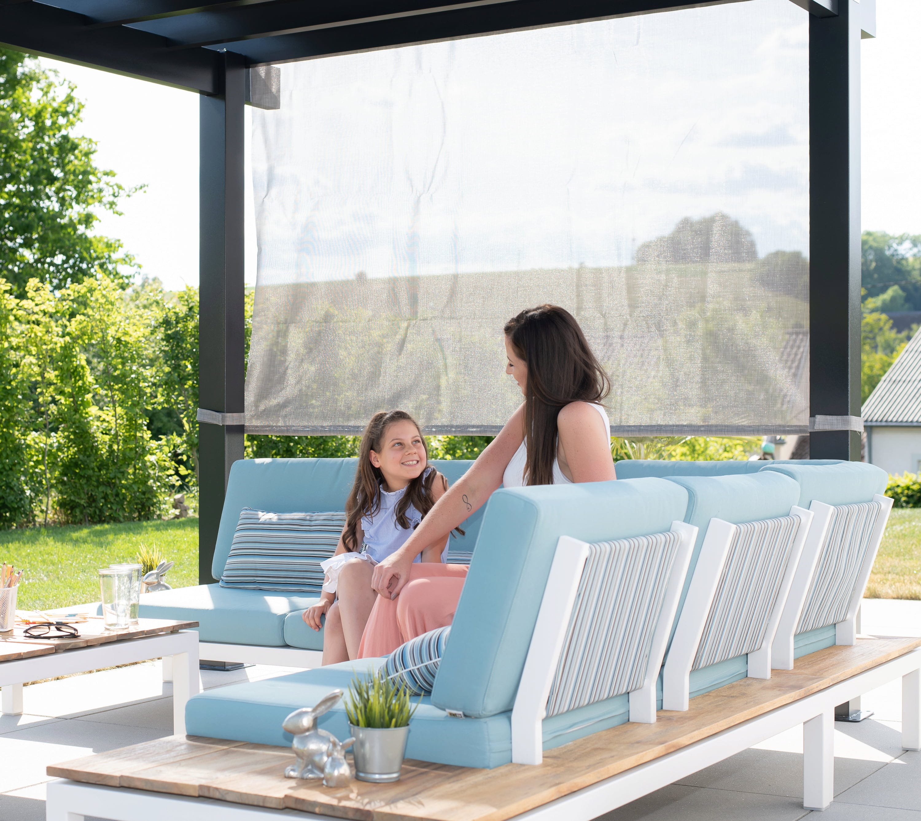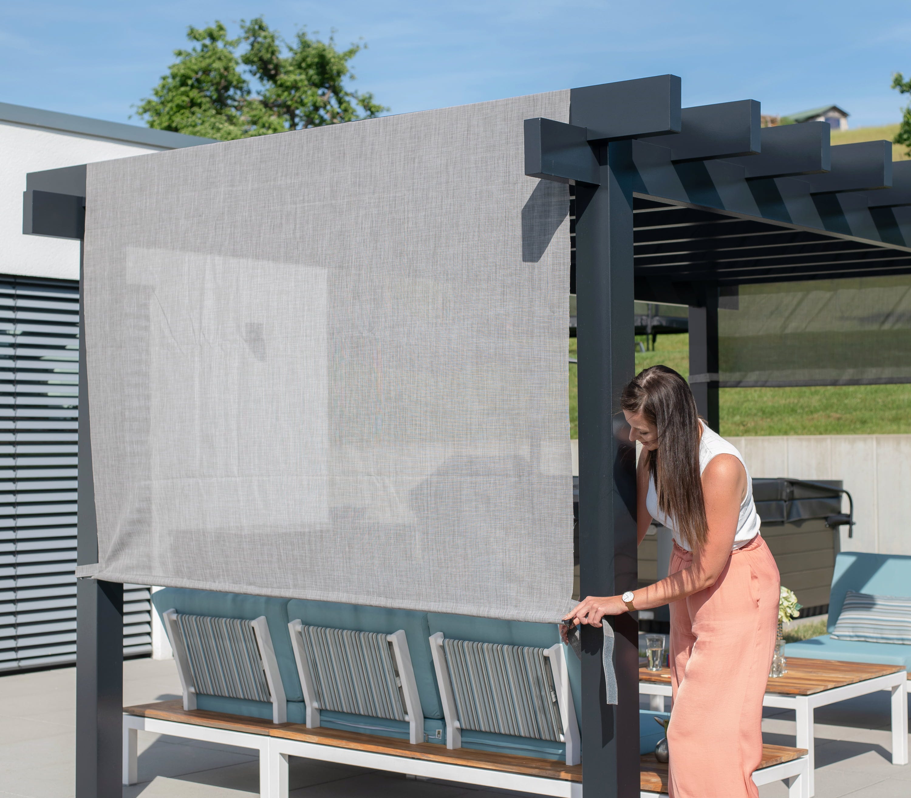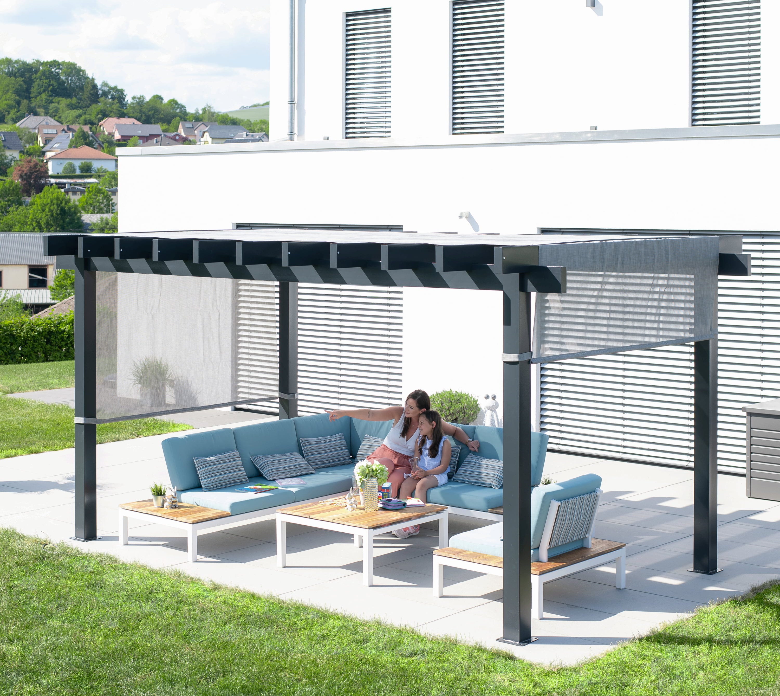 Die Konstruktion aus robustem, anthrazitfarbenem Aluminium ist dank der hochwertigen Pulverbeschichtung komplett wartungsfrei und schenkt dir über viele Jahre hinweg Freude. Das Besondere: Du kannst das verstellbare Netzgewebedach ganz nach deinen Wünschen nutzen. Lass es für kühlen Schatten montiert oder nimm es ab, um eine völlig andere optische Wirkung zu erzielen.