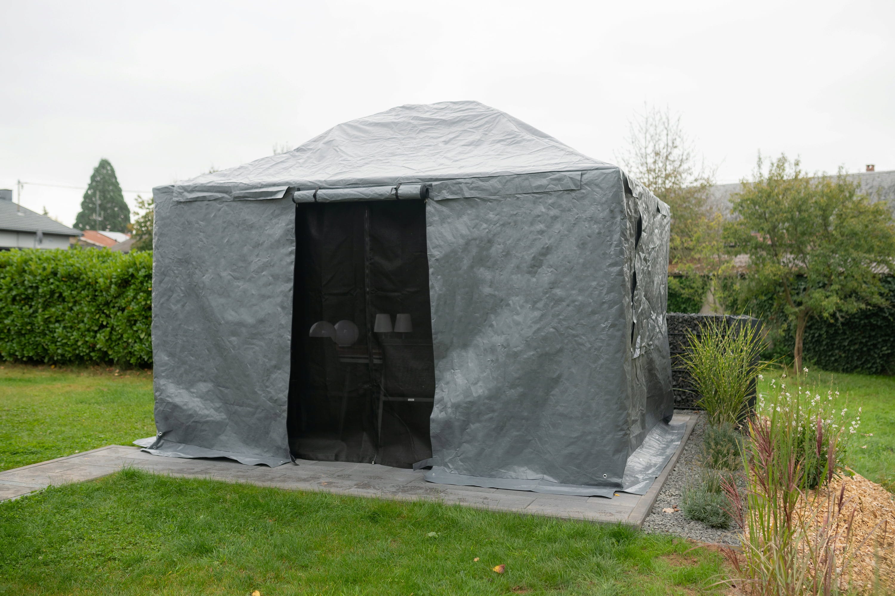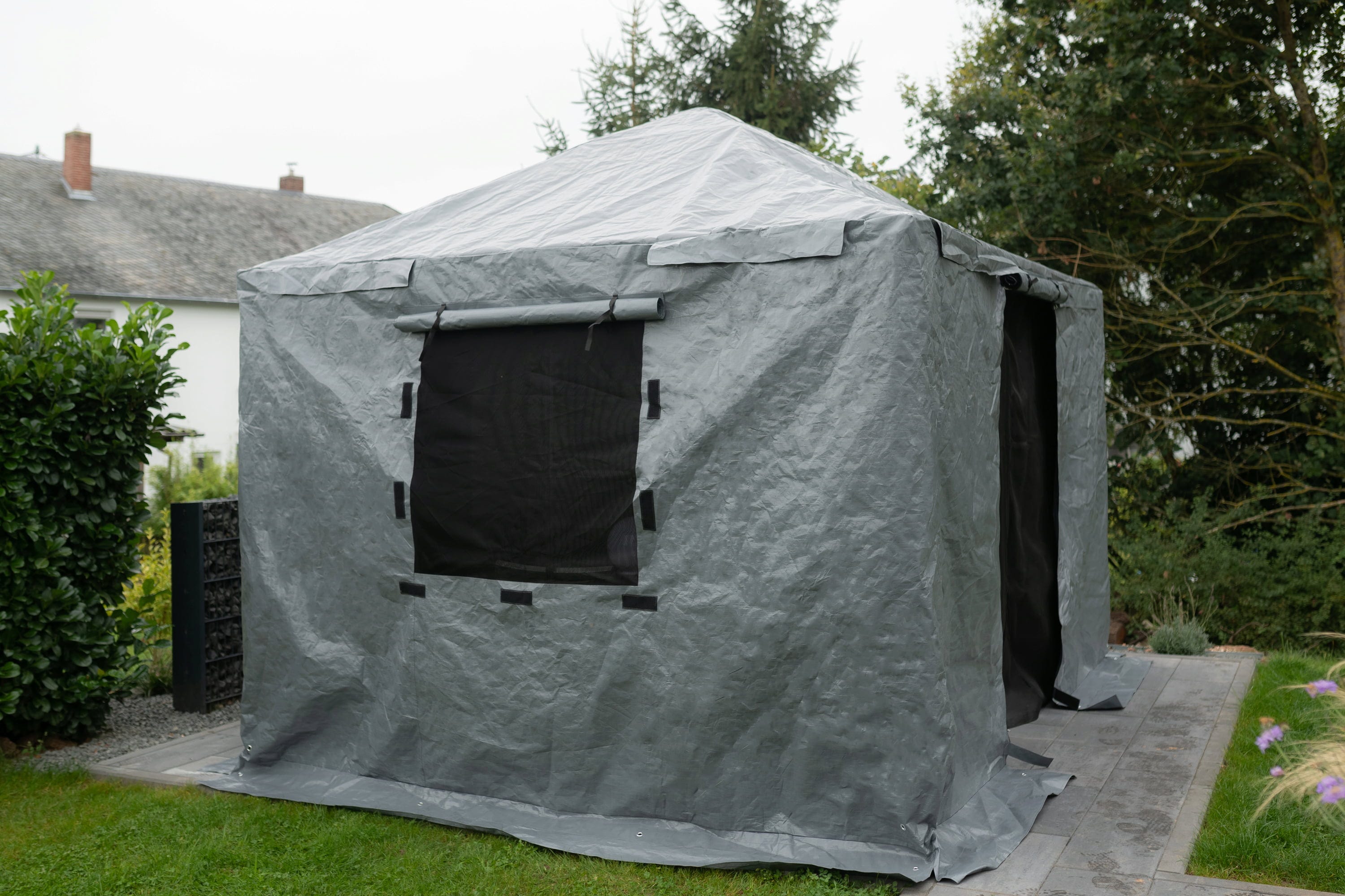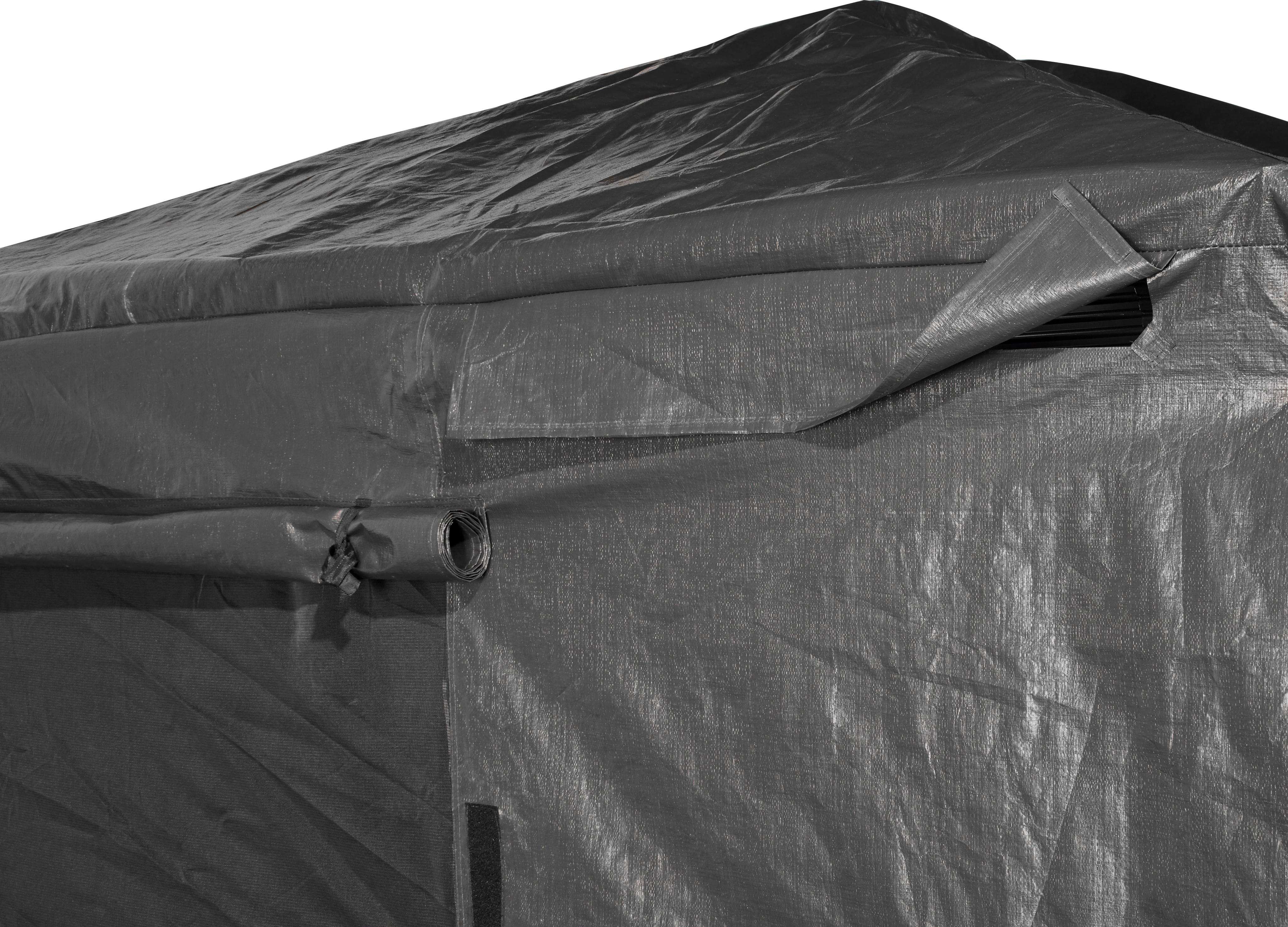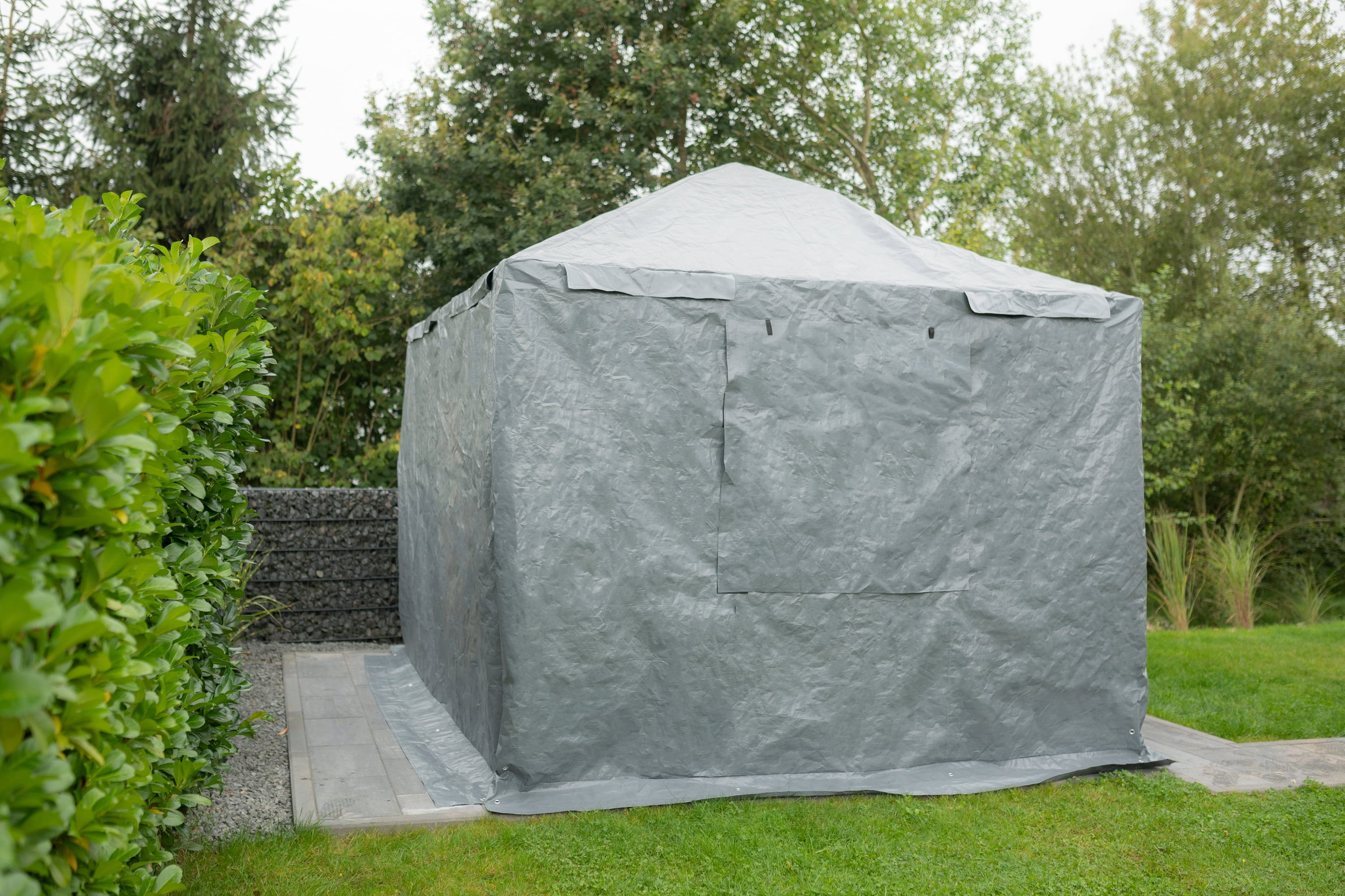 Die Hülle aus hochwertigem, 200 g/m² starkem Polyethylen umschließt alle Seiten deines Pavillons vollständig und bewahrt ihn zuverlässig vor Schmutz, Niederschlag und Frost.