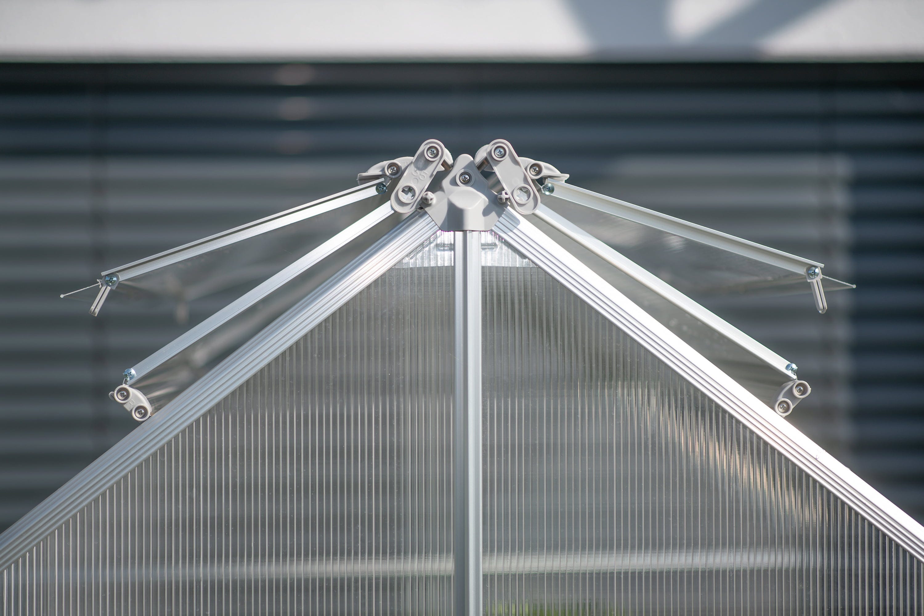 Die Basis bildet ein massives Untergestell aus galvanisiertem Stahl, das durch ein Dach aus hochisolierten Polycarbonat-Paneelen ergänzt wird. Diese Kombination wirkt wie ein Tresor für deine Pflanzen: Sie sind sicher vor Hagel, Starkregen und aggressiven UV-Strahlen geschützt.