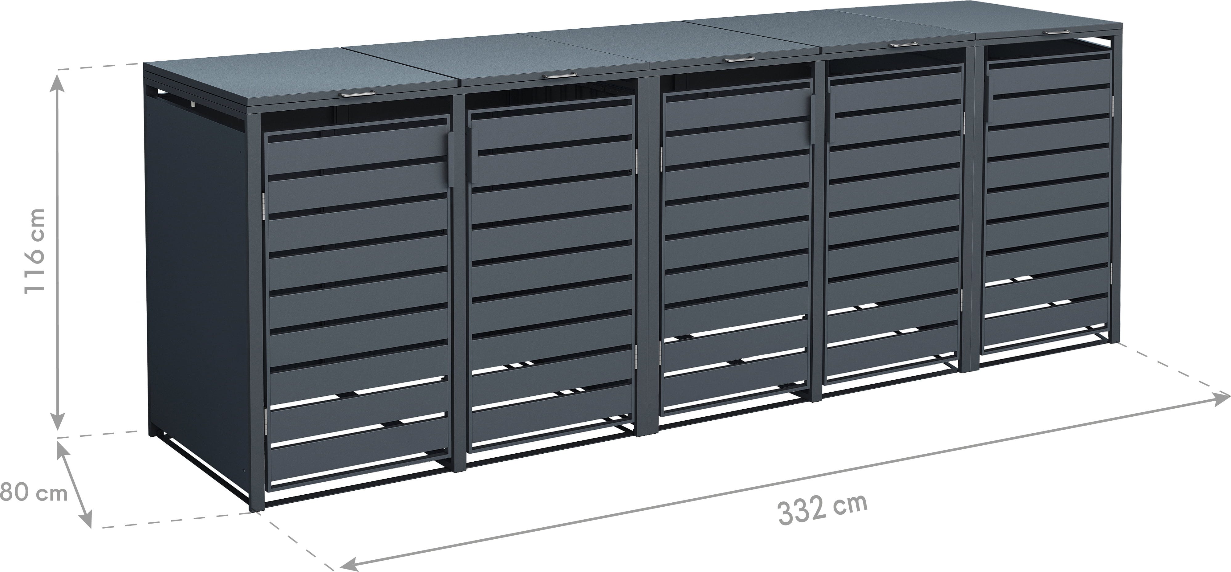 - 5 x 240 L: 80 x 332 x 116 cm