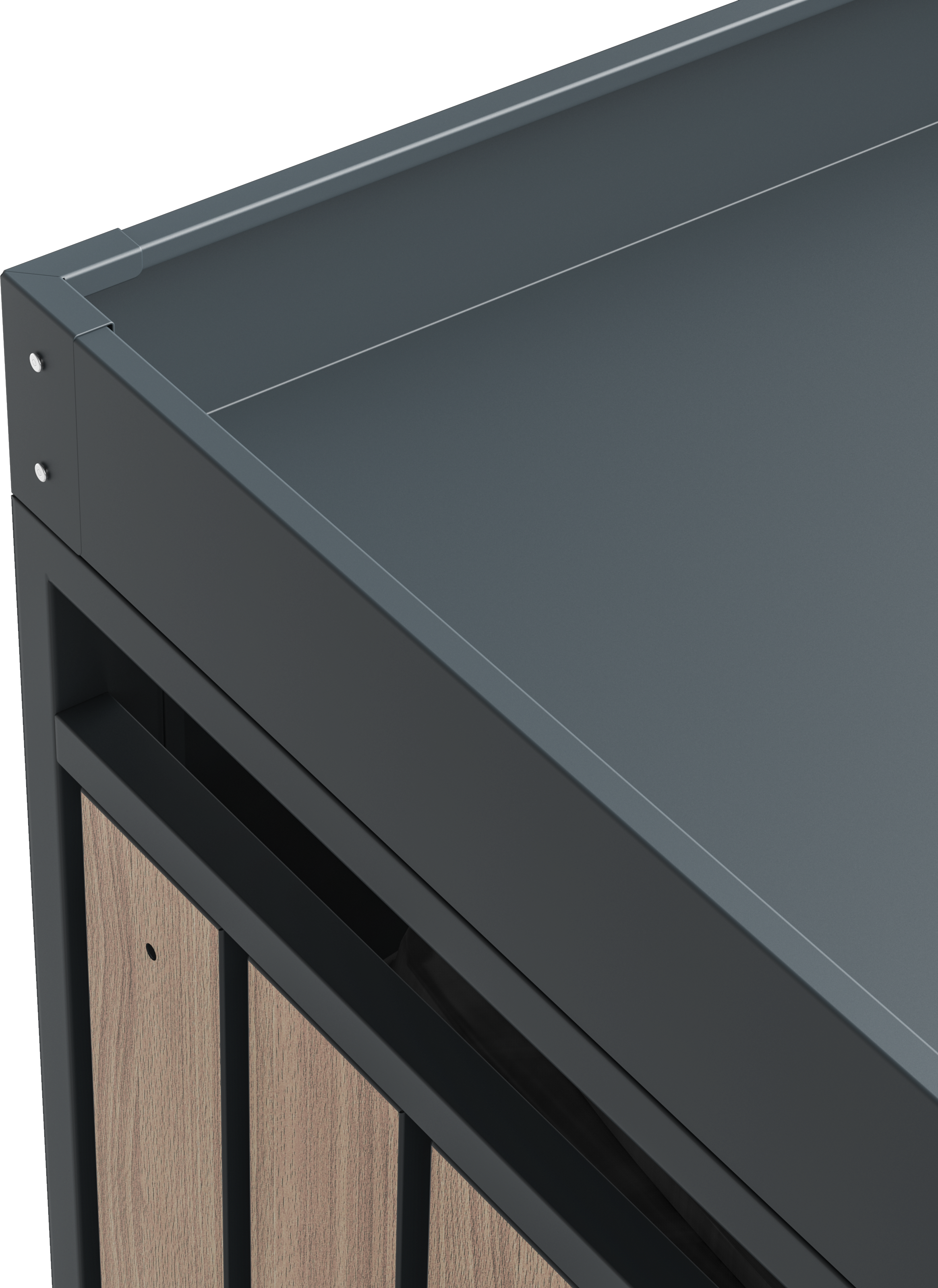 Hinter einem modernen Korpus aus hochwertigem, pulverbeschichtetem Stahl verschwinden deine Tonnen diskret und stilvoll. Das Besondere an diesem Modell ist das innovative Pflanzdach. Du hast die Freiheit, die beiden integrierten Kästen ganz nach deinem Geschmack zu begrünen – ob mit duftenden Kräutern, hängenden Sukkulenten oder saisonalen Blumen. So fügt sich die Box organisch in deine Gartenlandschaft oder deinen Einfahrtsbereich ein.