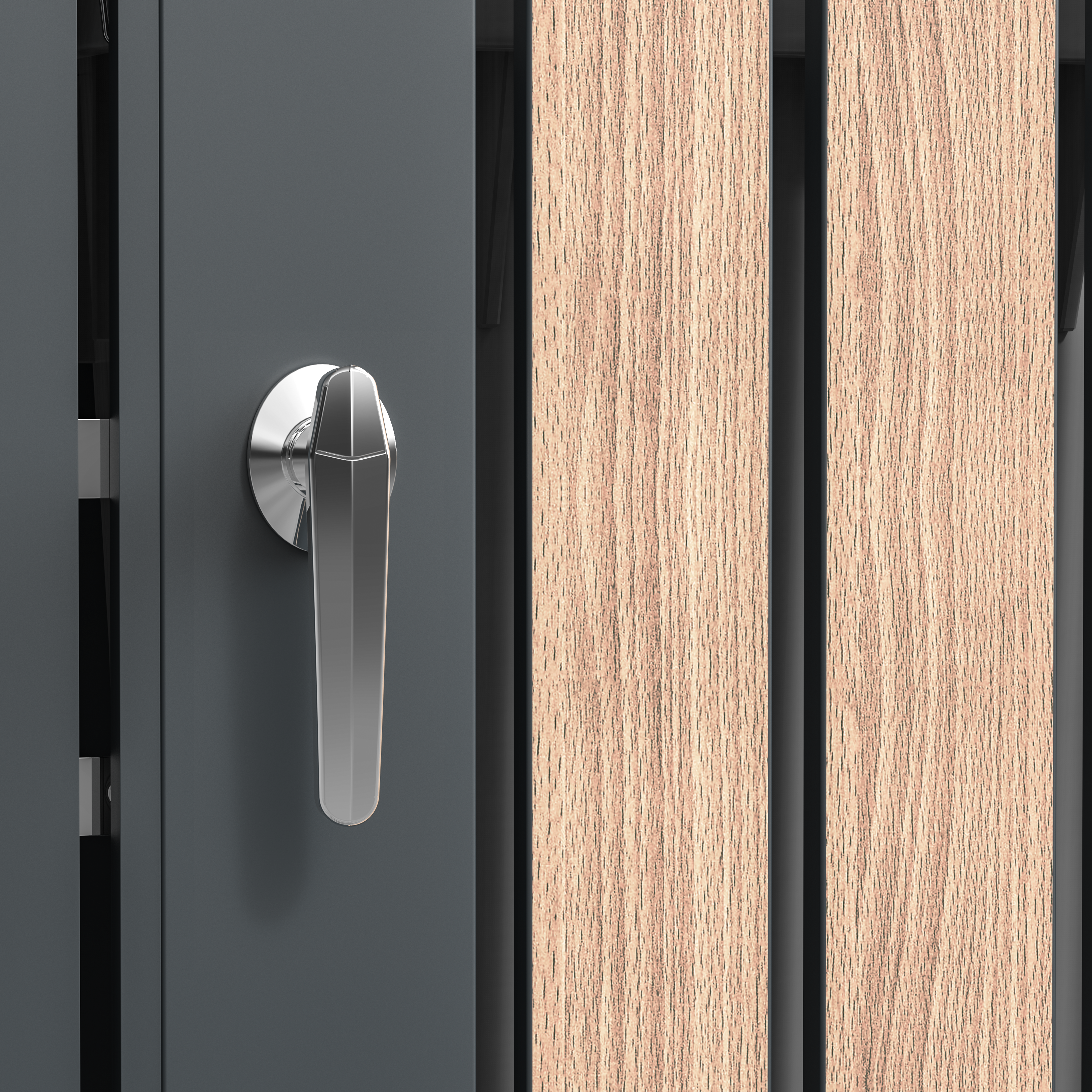 - Premium-Materialmix: Widerstandsfähiger Stahl trifft auf dekorative Holzoptik.