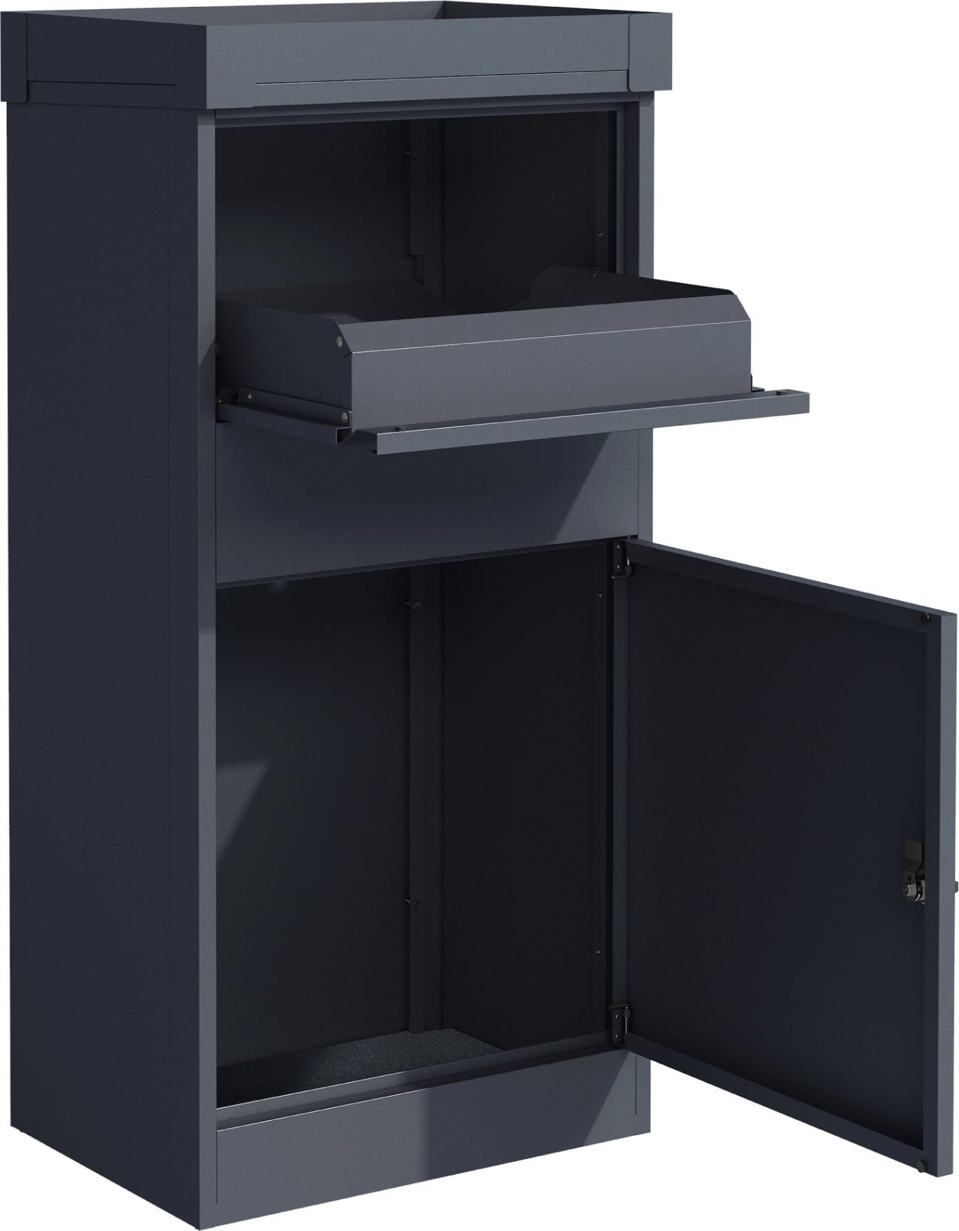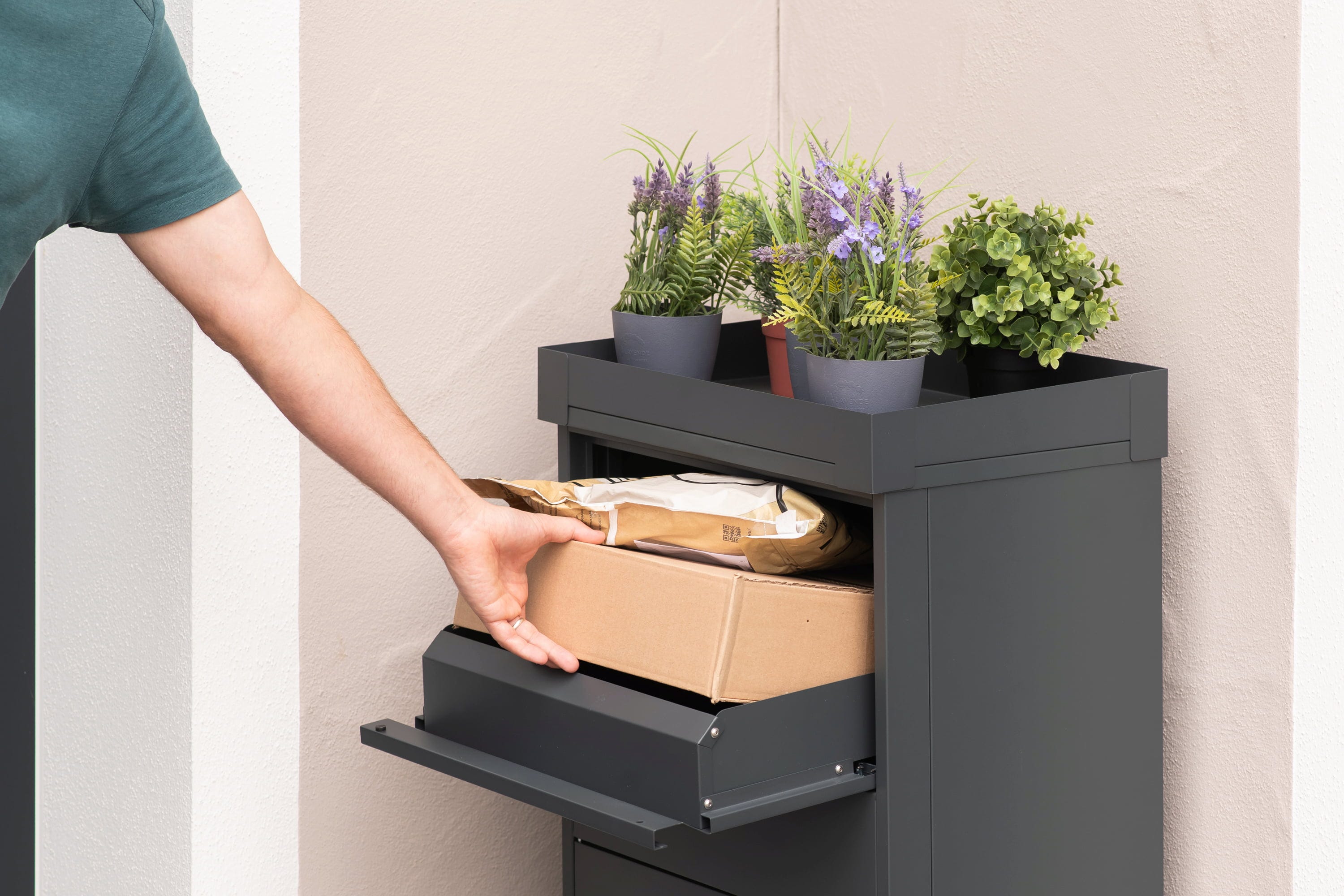 Die Sendung wird einfach in das großzügige obere Kippfach gelegt. Sobald das Fach geschlossen wird, gleitet das Paket automatisch in den unteren, abgeschlossenen Bereich der Box. Ein unbefugter Zugriff von oben ist danach nicht mehr möglich. Gefertigt aus pulverbeschichtetem und UV-beständigem Stahl, trotzt Piet jeder Witterung und bleibt dauerhaft korrosionsbeständig.