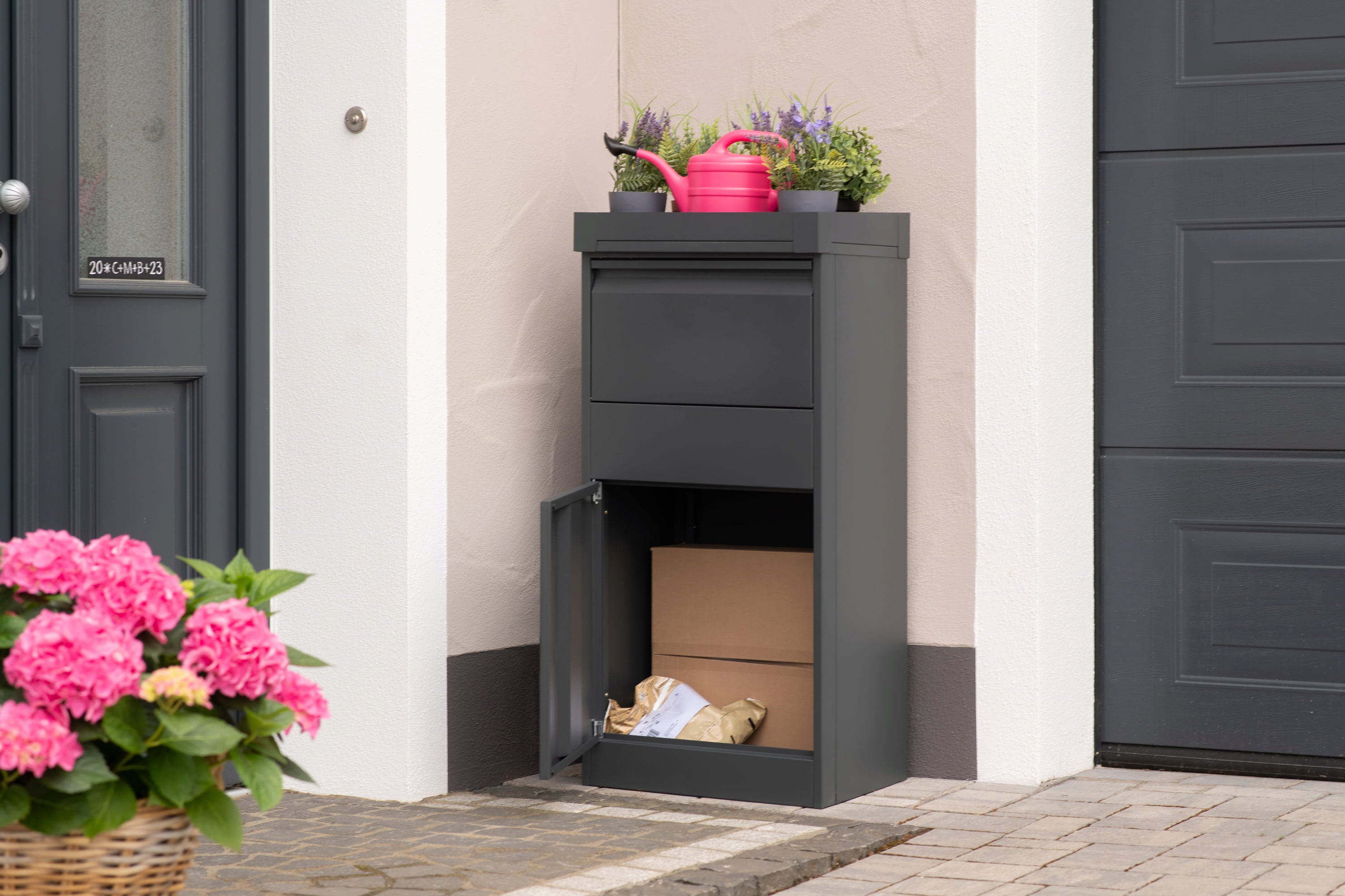 Mit der Westmann Paketbox Piet holst du dir deine Unabhängigkeit direkt an die Haustür! Diese smarte Lösung ermöglicht es dir, Pakete jederzeit sicher, kontaktlos und rund um die Uhr zu empfangen. Ob du gerade arbeitest, Besorgungen machst oder im Urlaub bist – deine Bestellungen landen direkt in deinem privaten Depot. Das geradlinige Design in elegantem Anthrazit sorgt dabei für ein modernes Erscheinungsbild, das perfekt zu zeitgemäßen Fassaden und Eingangsbereichen passt.