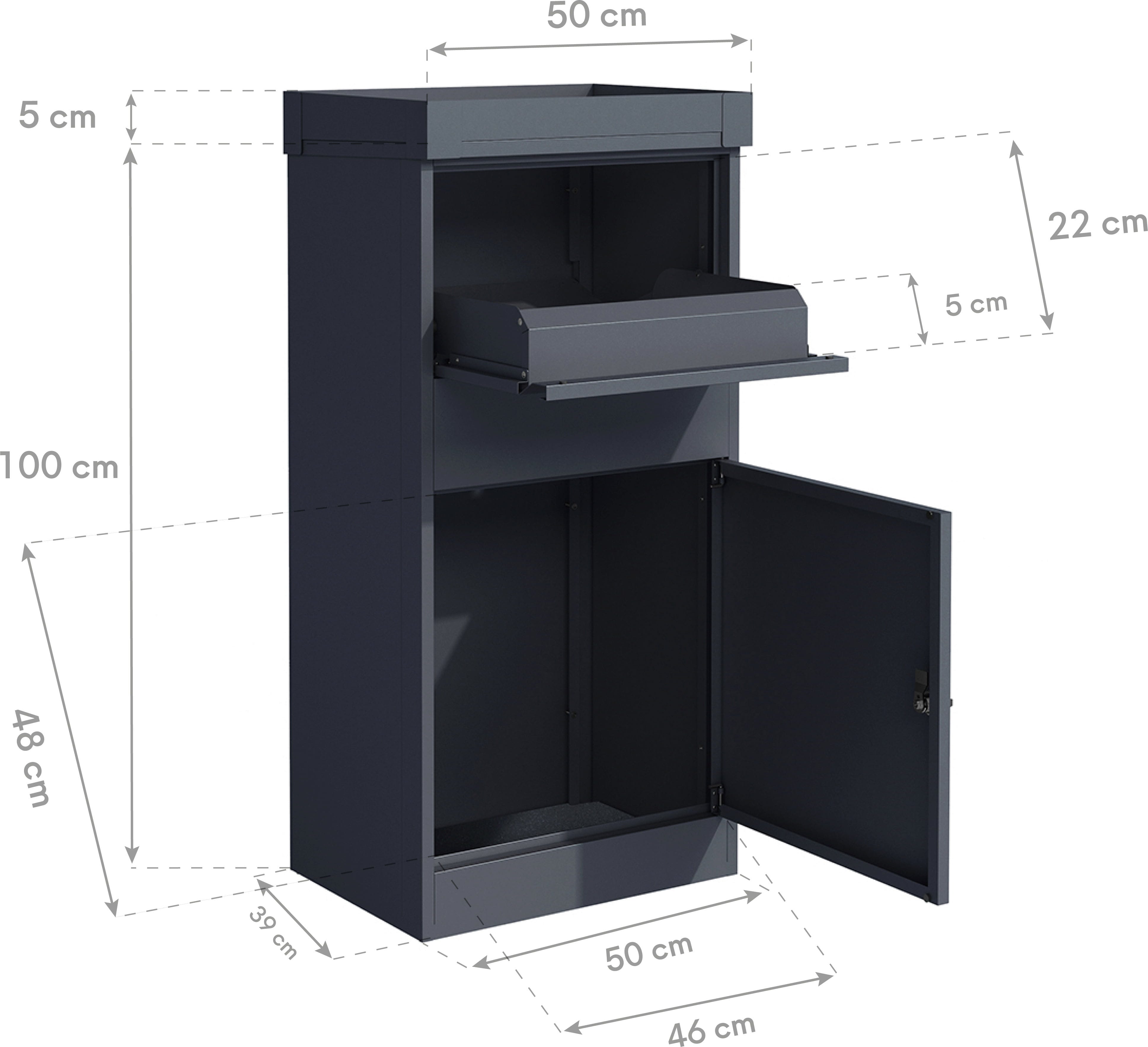 - Sicheres Kippfach für Pakete bis zu einer Größe von 40 x 40 x 14 cm