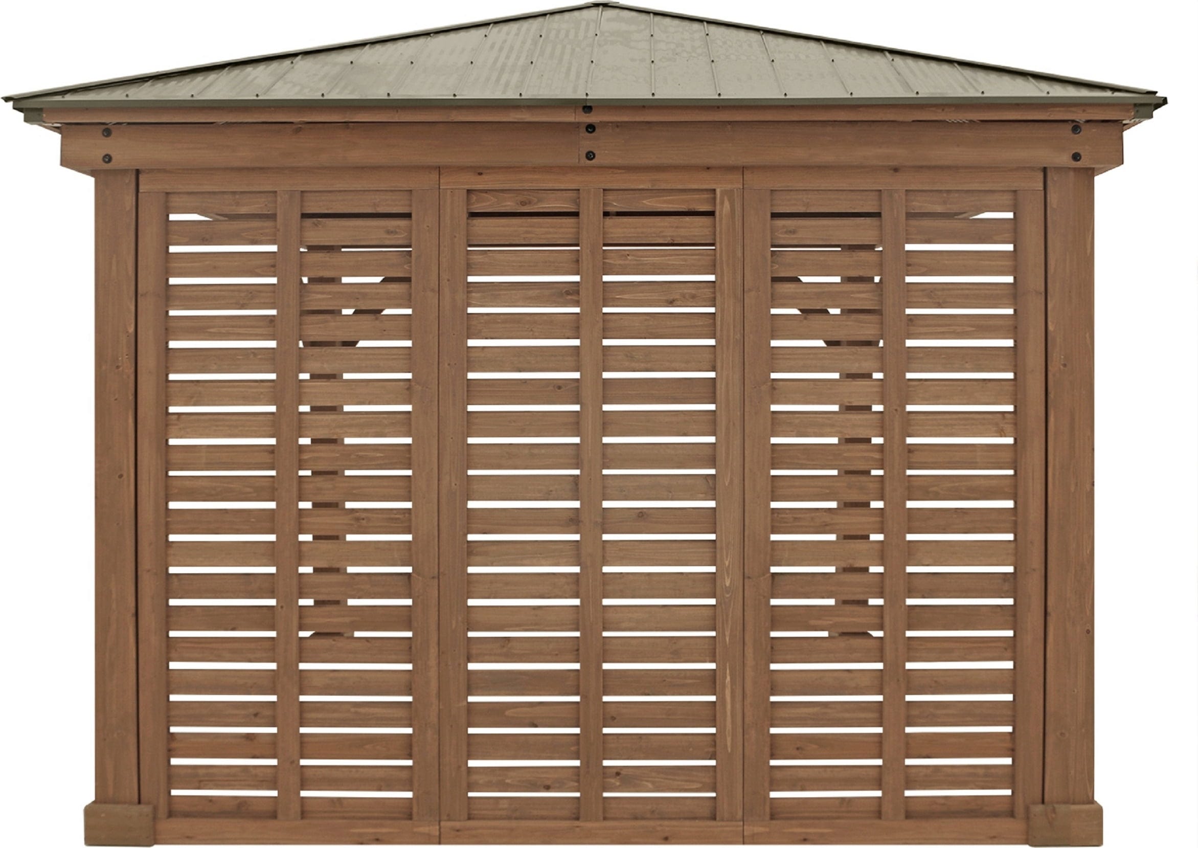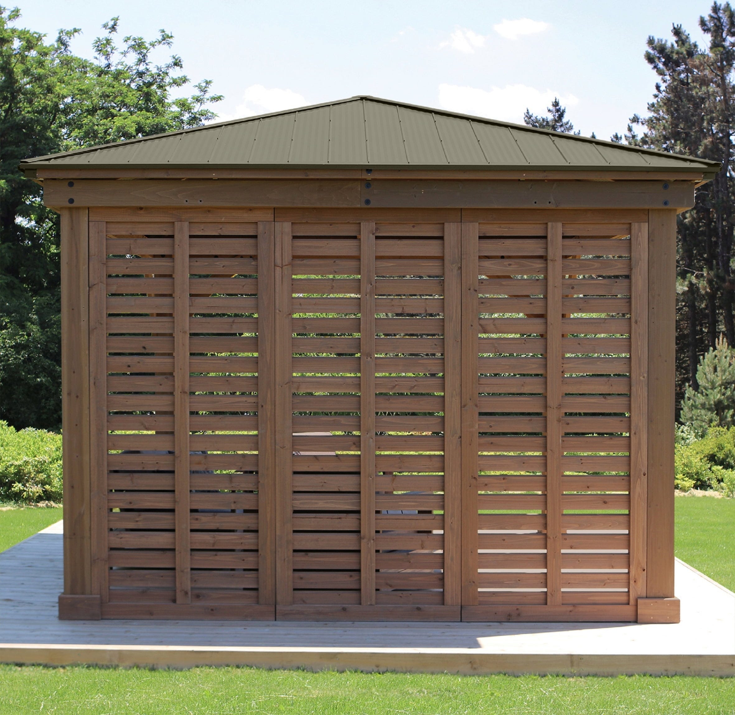 Die Wand fügt sich durch die identische Holzart und die feine Maserung nahtlos in die bestehende Struktur ein und verleiht deinem Außenbereich eine geschlossene, exklusive Optik. Dabei entscheidest du ganz individuell, an welcher Seite du den Schutz benötigst – so passt sich dein Pavillon perfekt deinen Bedürfnissen und der Ausrichtung deines Gartens an.