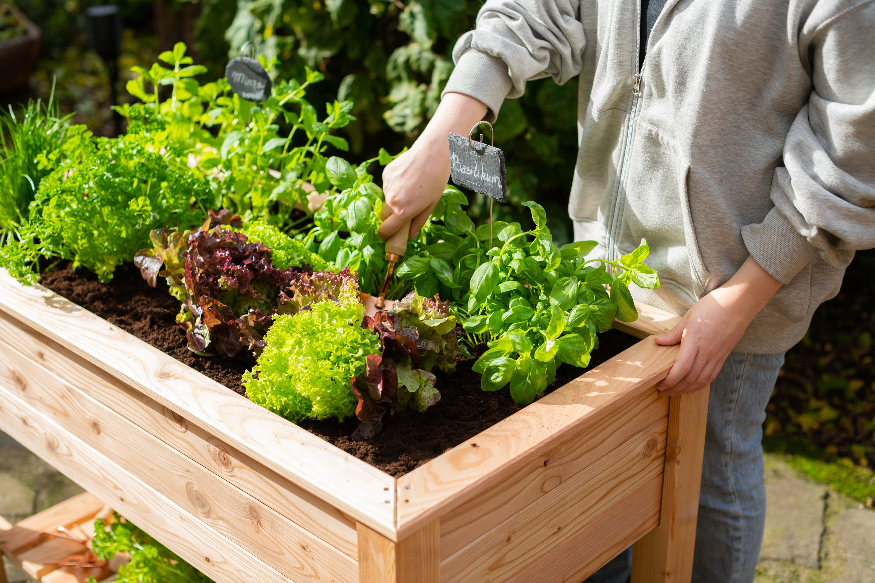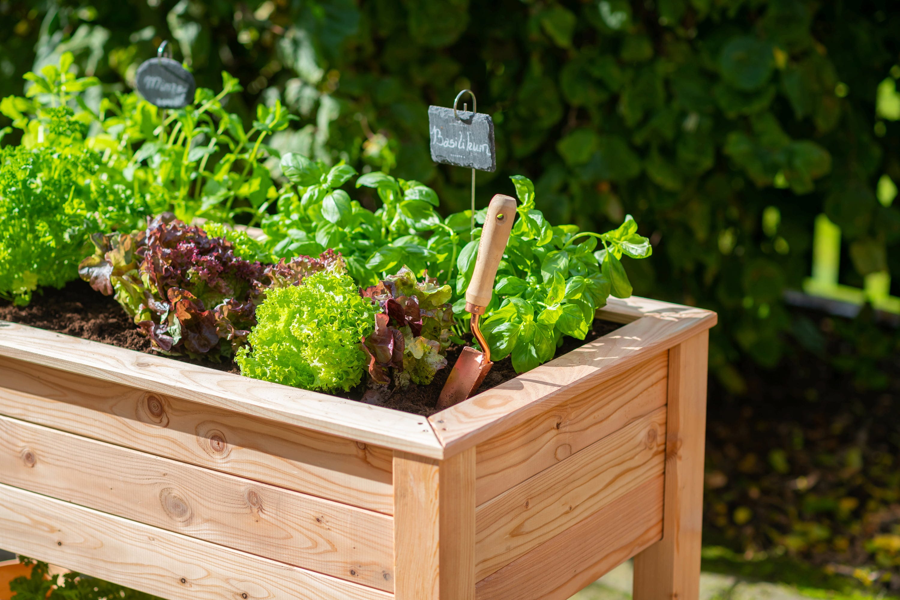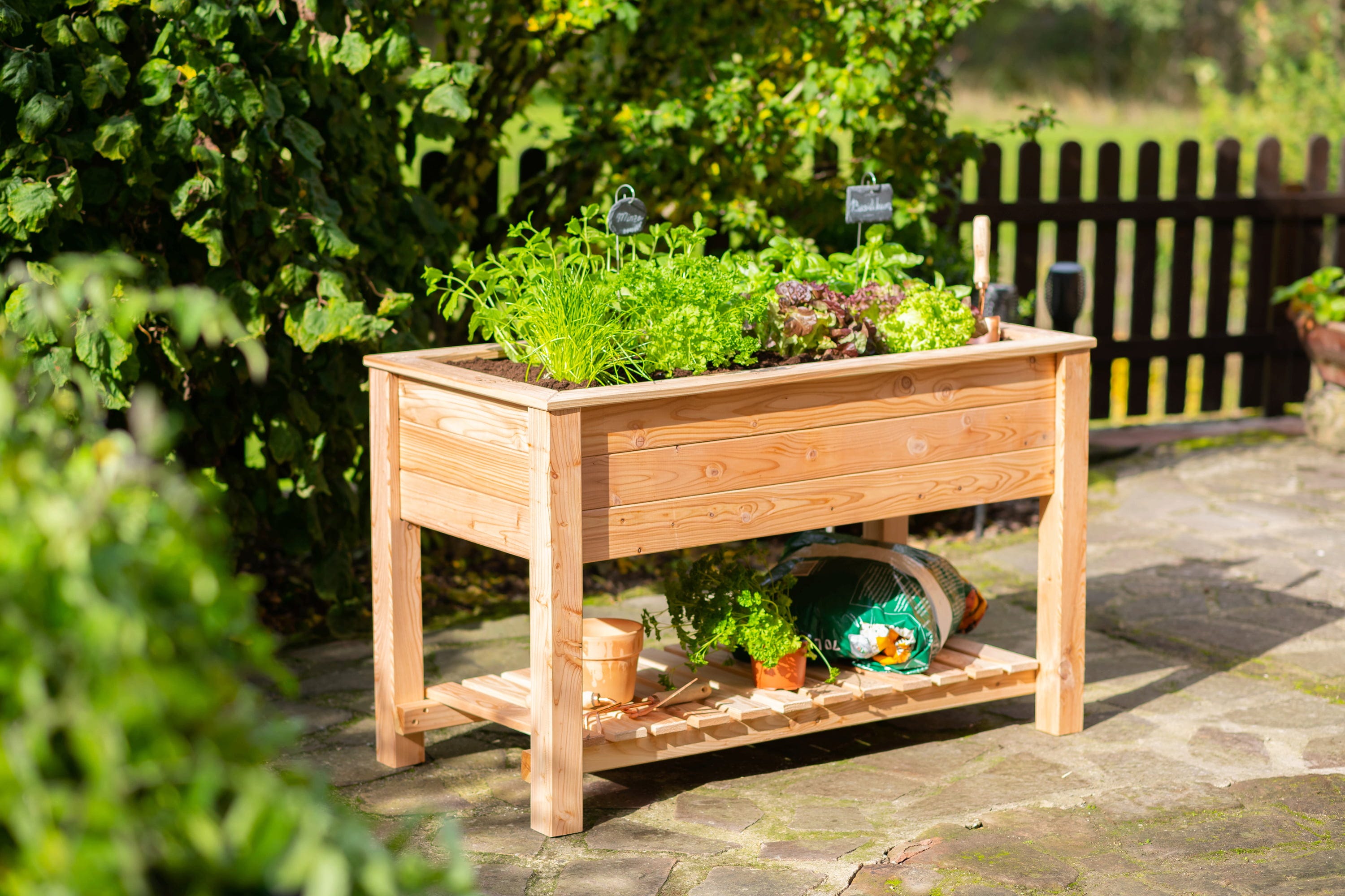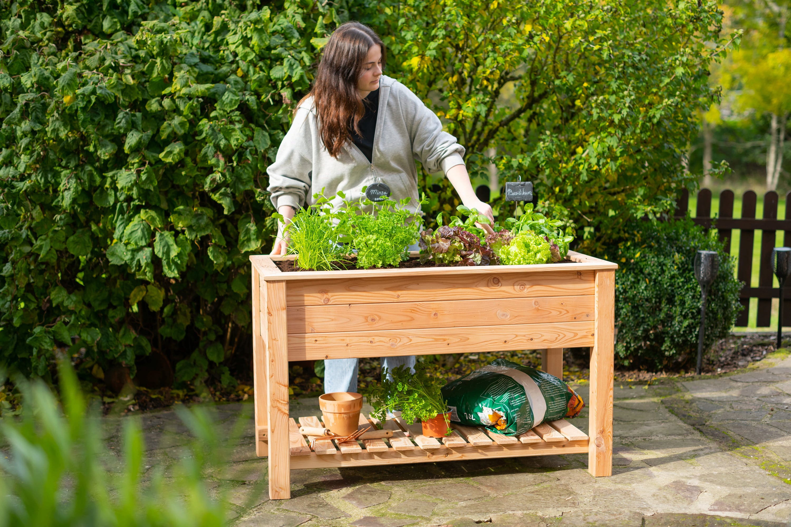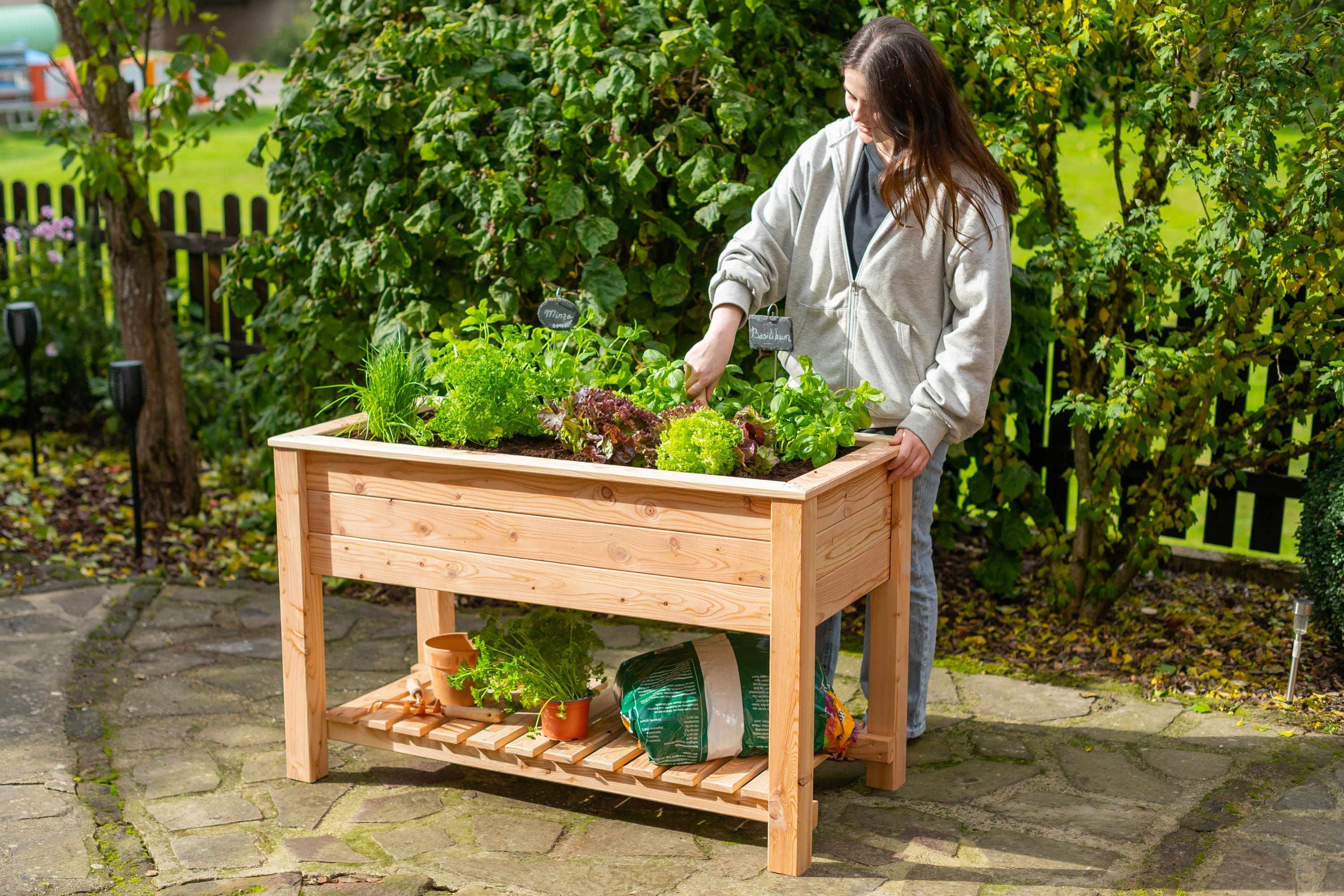 Gefertigt aus massivem Lärchenholz, steht das Hochbeet für absolute Beständigkeit. Auch das Gärtnern mit Emily gestaltet sich für dich besonders komfortabel. Die angenehme Höhe von 75 cm erlaubt es dir, Setzlinge zu pflanzen oder frische Kräuter zu ernten, ohne dich zu bücken oder zu knien. Gleichzeitig profitieren deine Pflanzen von der erhöhten Position: Die Erde im Korpus erwärmt sich schneller als im klassischen Bodenbeet, was die Nährstoffaufnahme optimiert und das Wachstum beschleunigen kann.