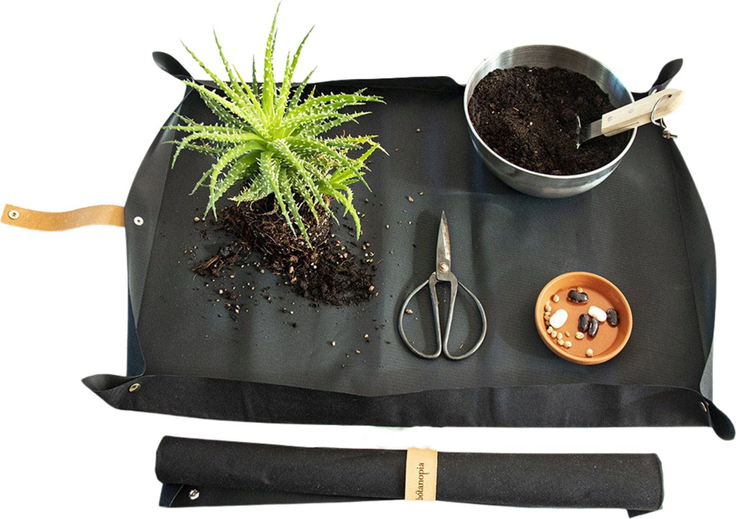 The raised corners keep earth and water on the tarpaulin, so that the environment remains clean. After work, you can easily throw waste from the planting mat into the bin and simply shake out the mat. Troublesome tidying up and cleaning are no longer necessary. To stow it away, you can simply roll up the mat, fix it with the strap and store it in a space-saving manner until the next use.