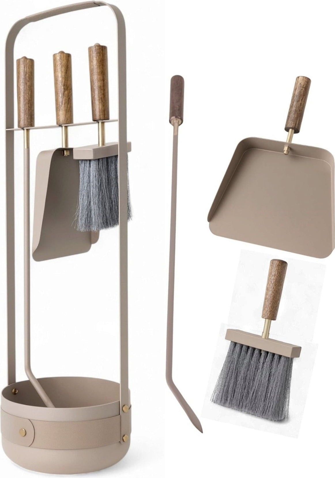 Included in the set: Shovel, brush, fire hook
