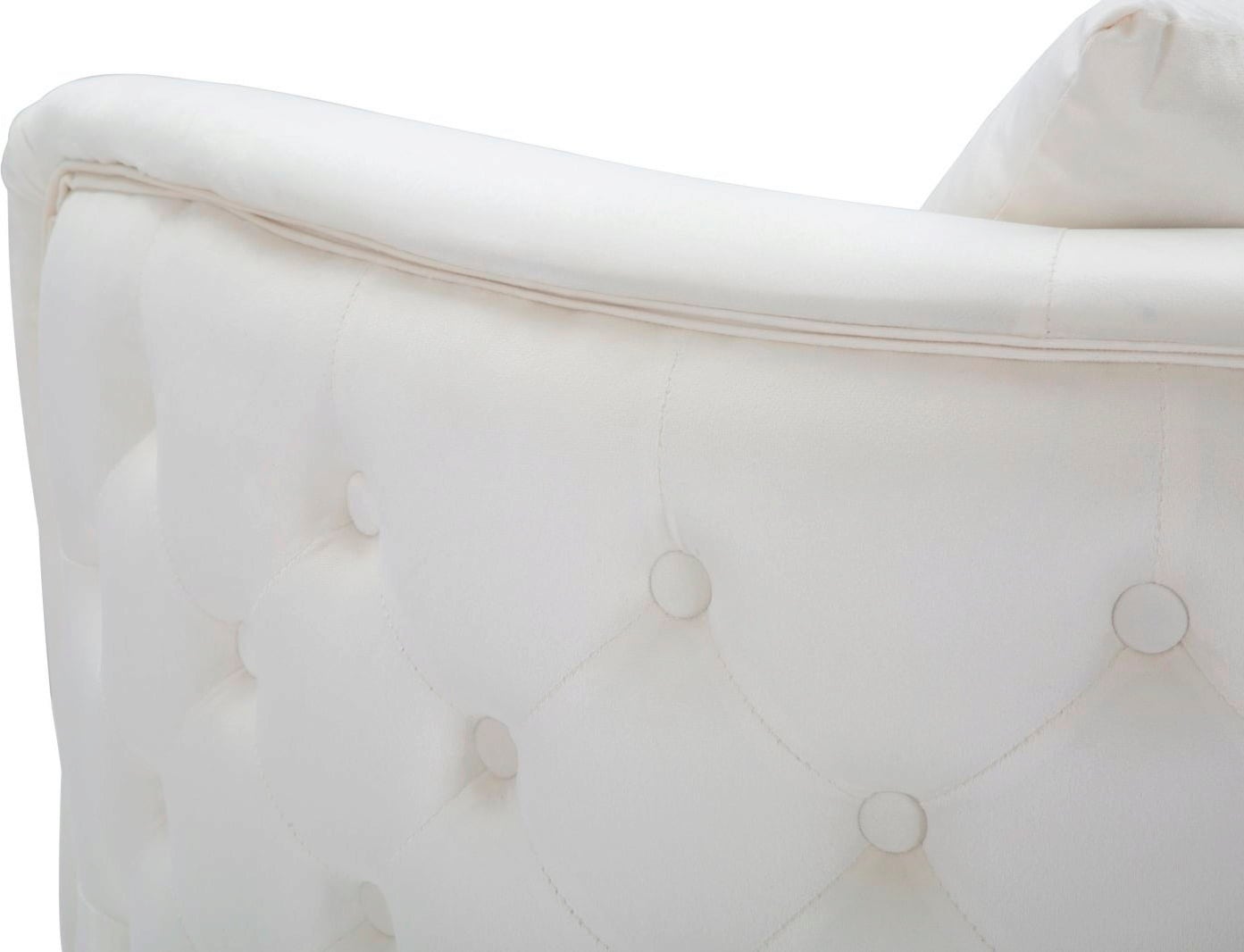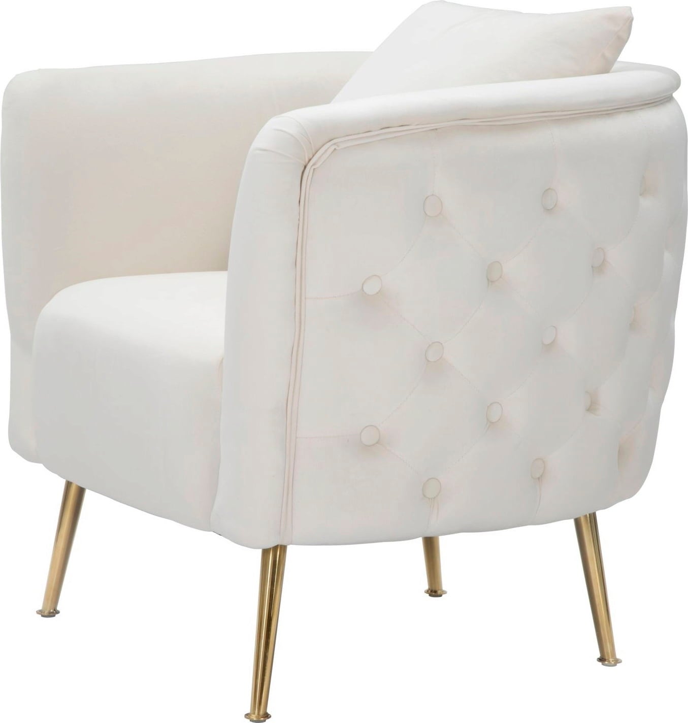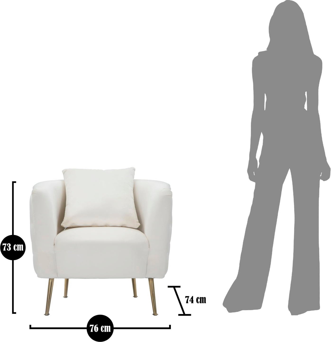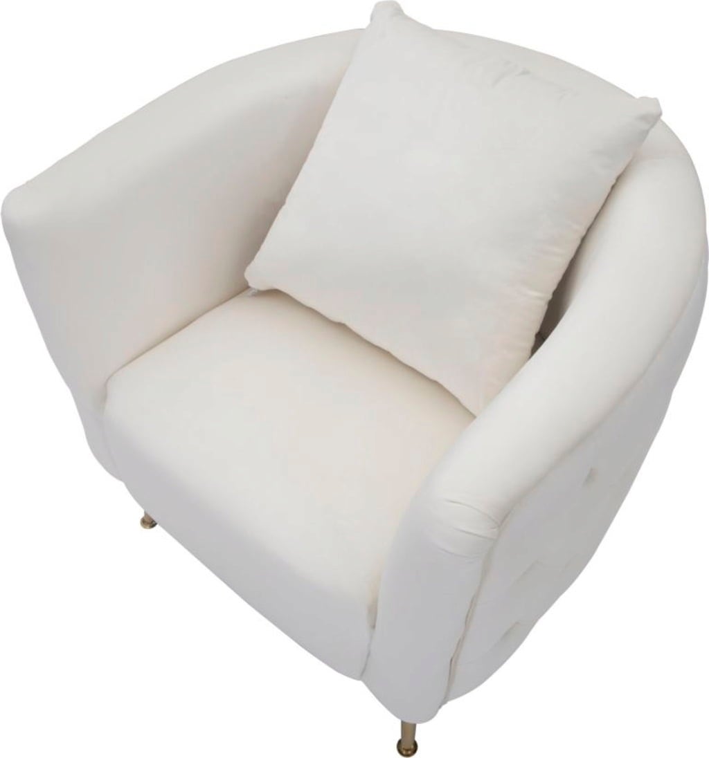 The elegance of the armchair is underlined by the slim, golden metal legs, which create a modern, glamorous contrast to the light colour. A matching back cushion is included. Ideal as an eye-catcher in the living room or for a cosy reading corner.