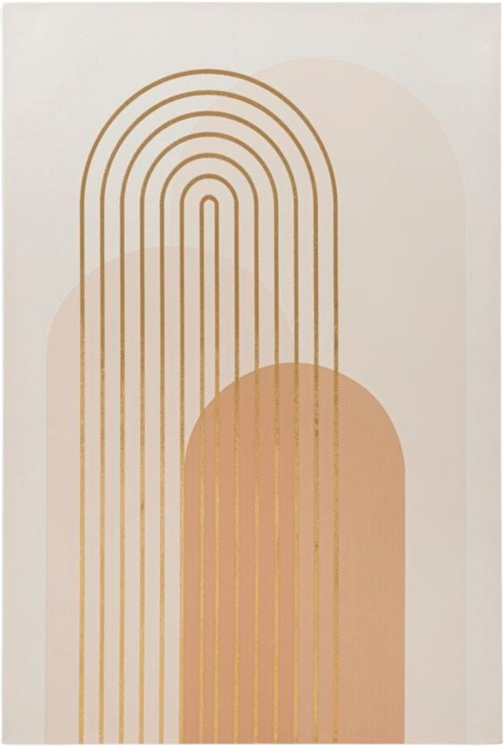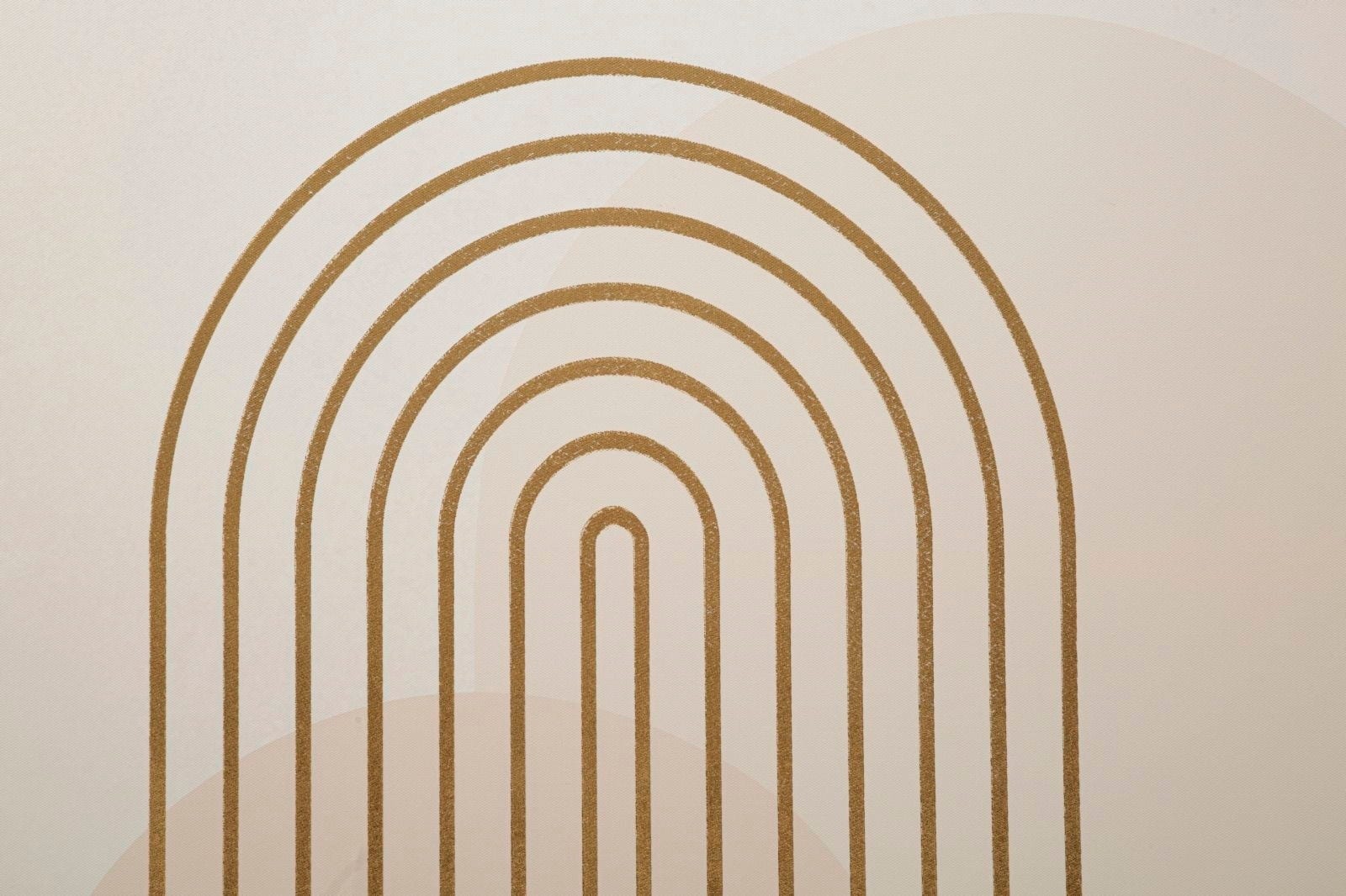 The motif masterfully plays with soft arch shapes, staggered one behind the other in various shades of beige, sand, and warm terracotta. Filigree golden lines stretch across the composition like shining sunbeams, giving the image an elegant, structured depth. Stretched on a high-quality wooden frame, Shine -A- is the perfect choice for a stylish interior that focuses on subtle elegance and harmonious color tones.