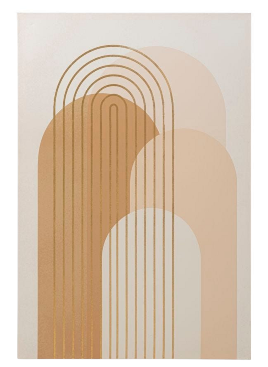 The motif masterfully plays with soft arch shapes, layered one behind the other in various shades of beige, sand, and warm terracotta. Filigree golden lines stretch across the composition like shining sunbeams, giving the image an elegant, structured depth. Stretched on a high-quality wooden frame, Shine -B- is the perfect choice for a stylish interior that focuses on subtle elegance and harmonious color tones.