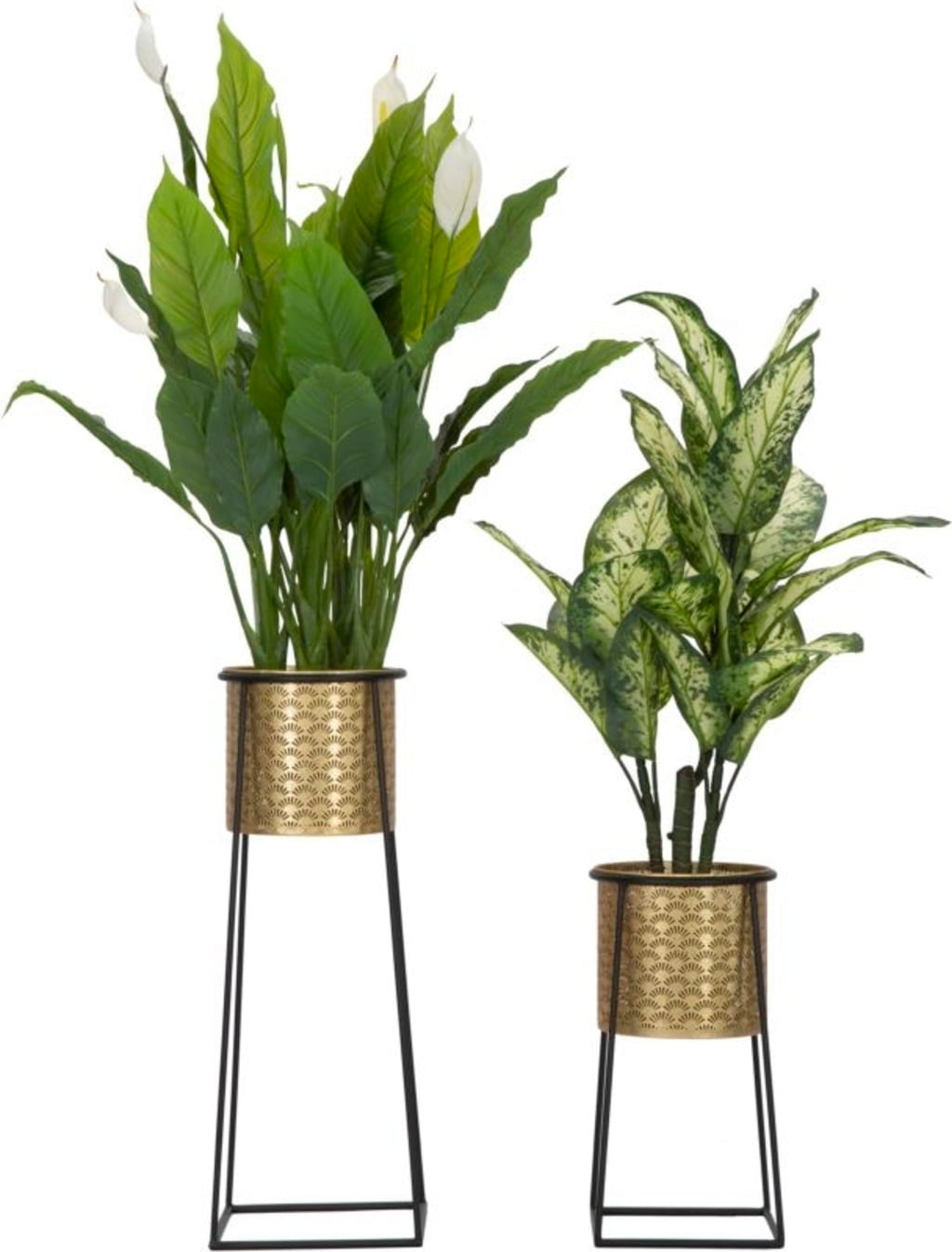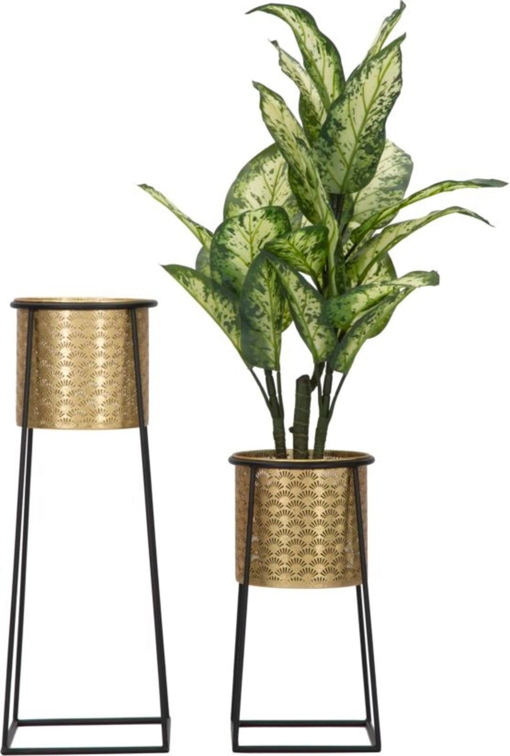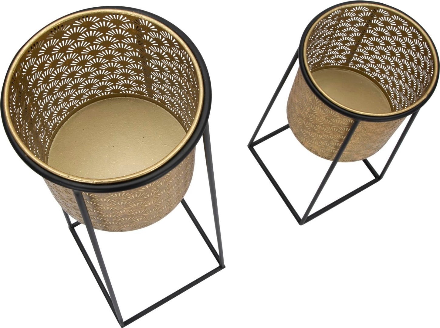 Add a touch of elegance and lightness to living spaces with these elegant flower pots in black holders in a practical set of 2. The design is characterised by a modern contrast: the round planters are made of gold-coloured metal and decorated with a delicate, geometric fan pattern, which is particularly beautiful when the light hits it.