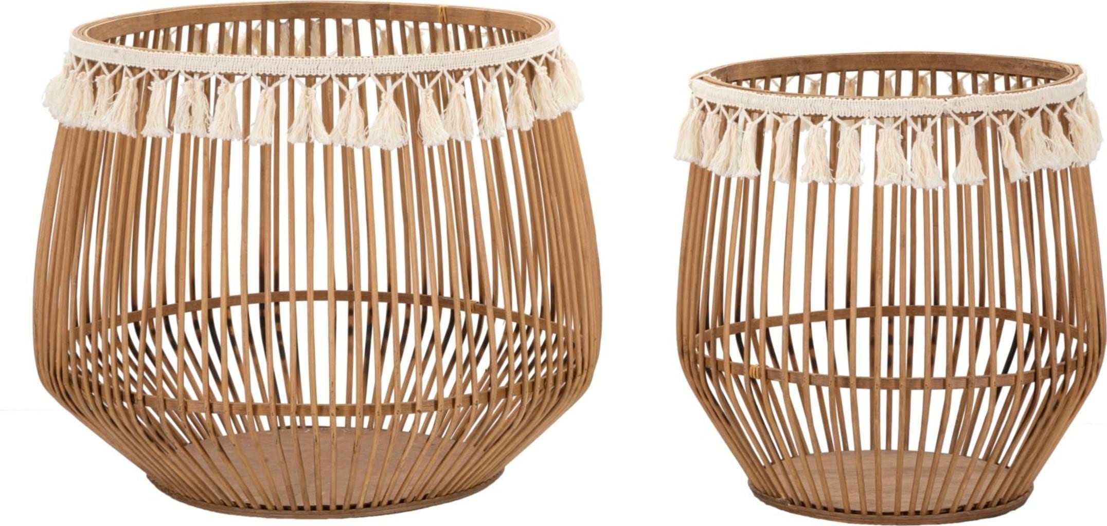 The unique eye-catcher element is the decorative fabric trim on the upper edge, which features cream-coloured fringing and a decorative ribbon - an ideal detail for a trendy boho-chic look. Whether placed in a space individually or as a duo, this basket set combines functionality and decoration elegantly and naturally.