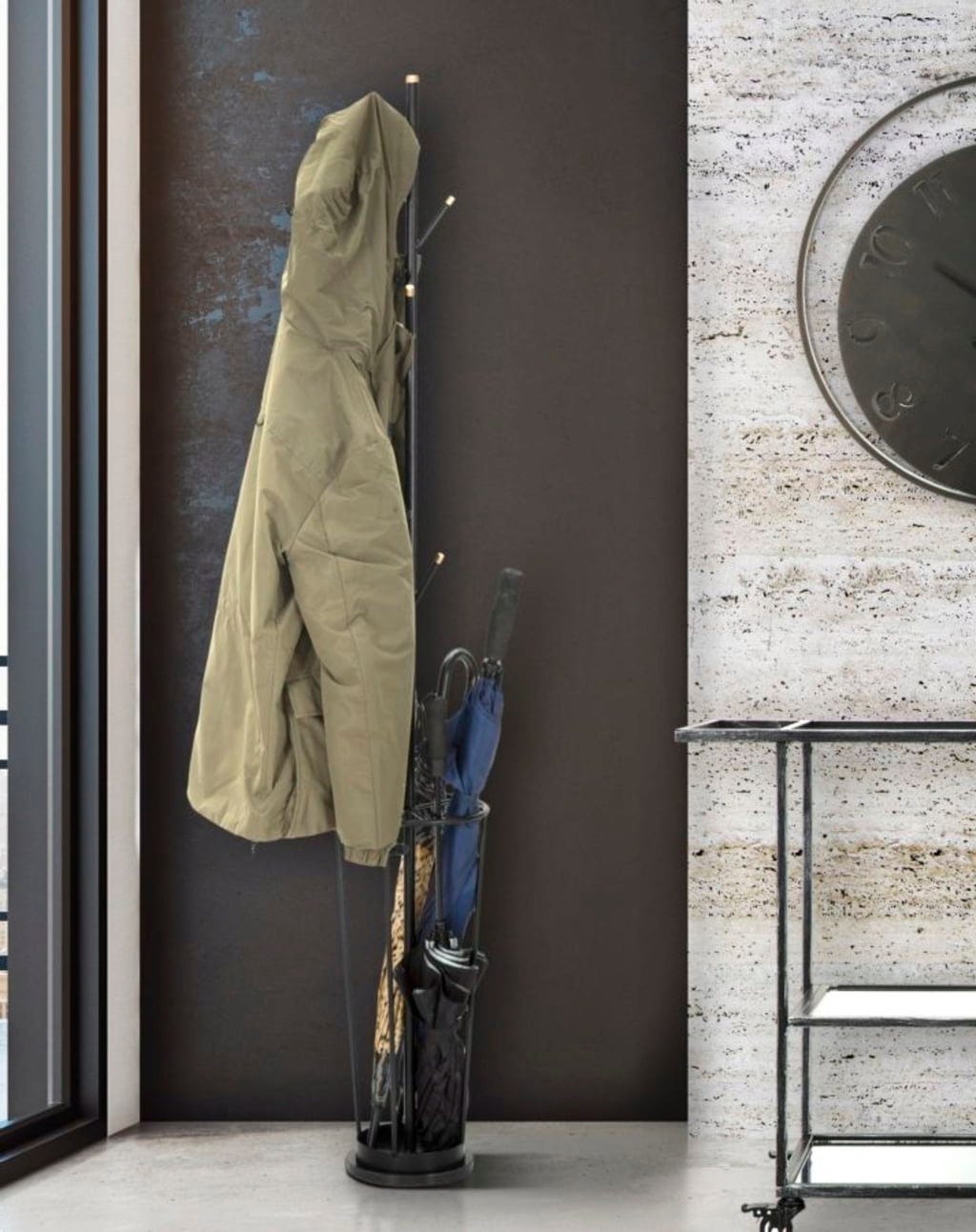 The slender, tree-like column is equipped with several staggered hooks, finished with elegant light accents at the ends, providing ample space for jackets and accessories. Particularly practical: a round umbrella stand is integrated into the lower section, keeping your umbrellas always within reach and ensuring order. Thanks to its slim silhouette, the Glam Black fits perfectly into any hallway – no matter how compact it is!