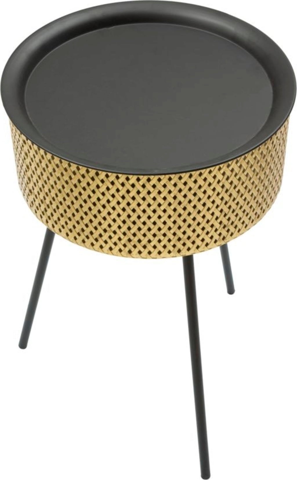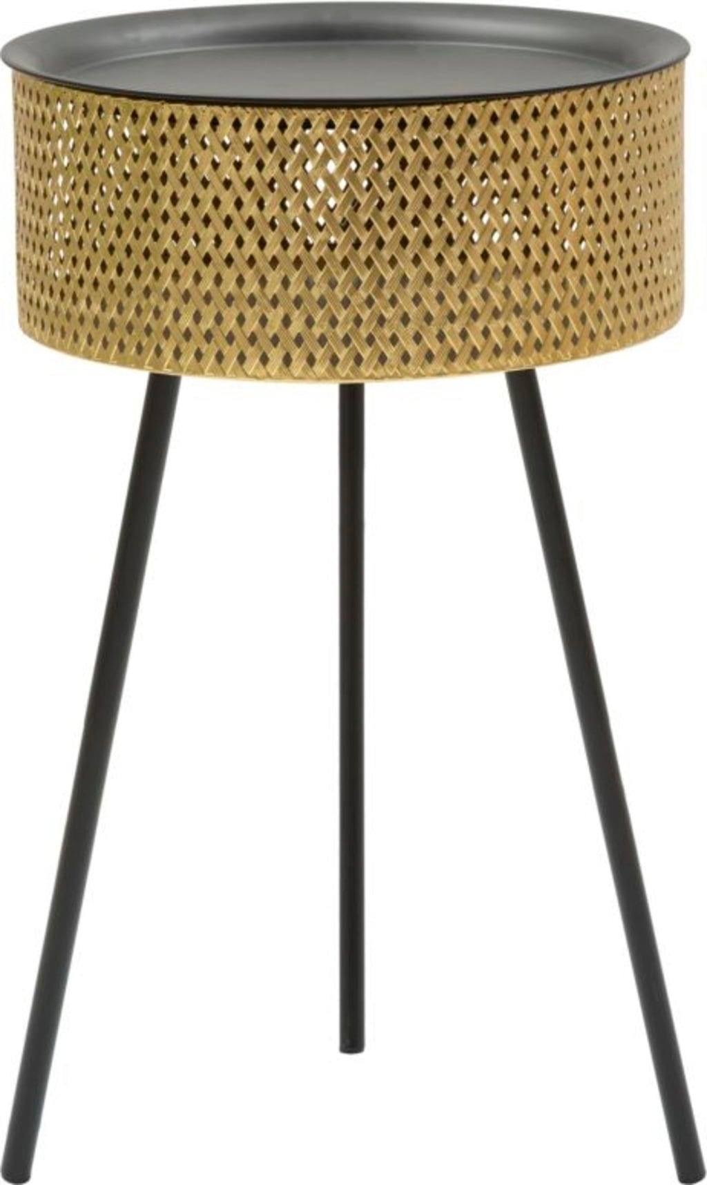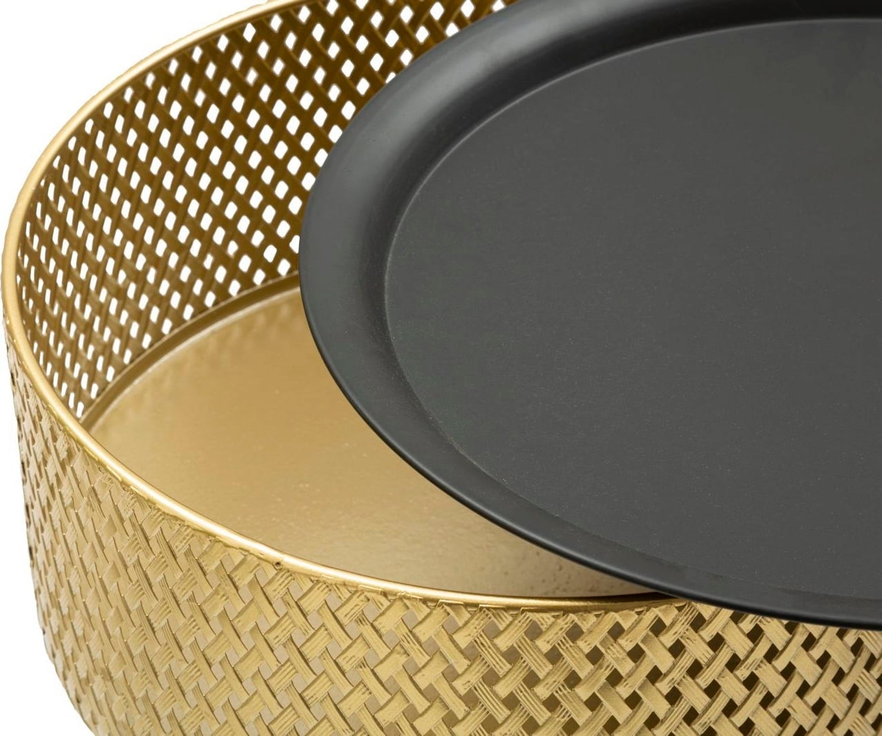 Add an elegant and practical accent to your living area with this small, round side table. It combines modern design with clever multifunctionality. The body stands out with its shiny, gold-coloured metal with a fine woven pattern that gives it a luxurious and elegant texture.