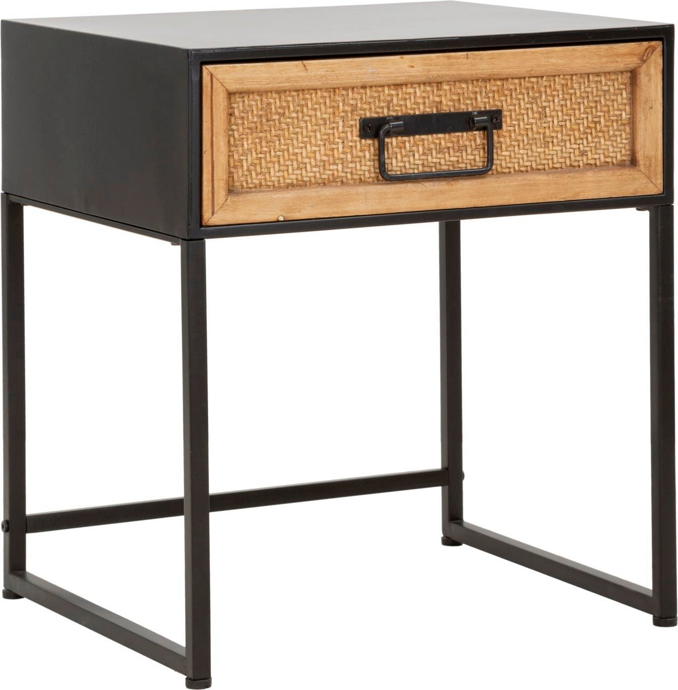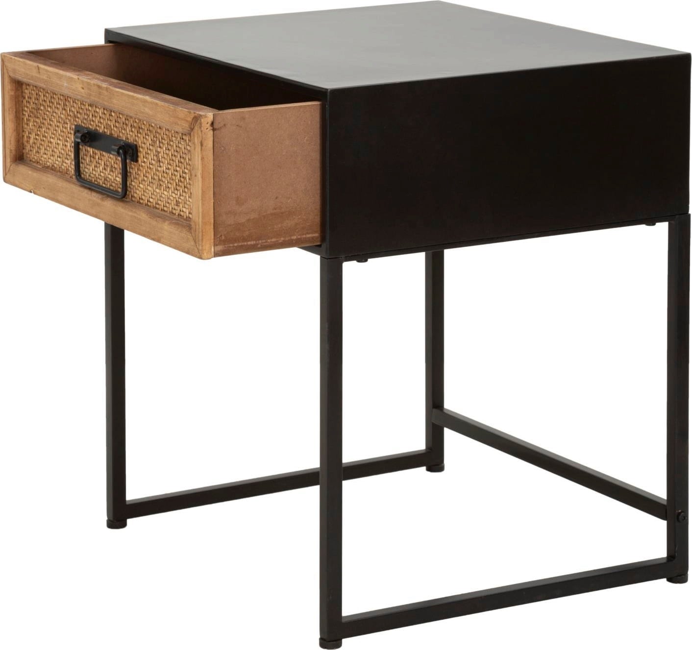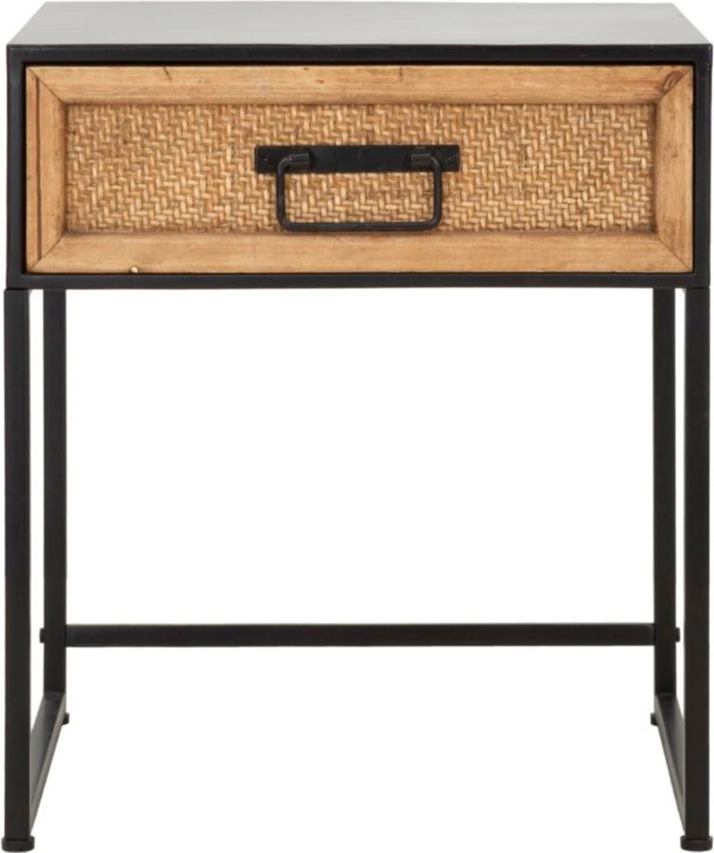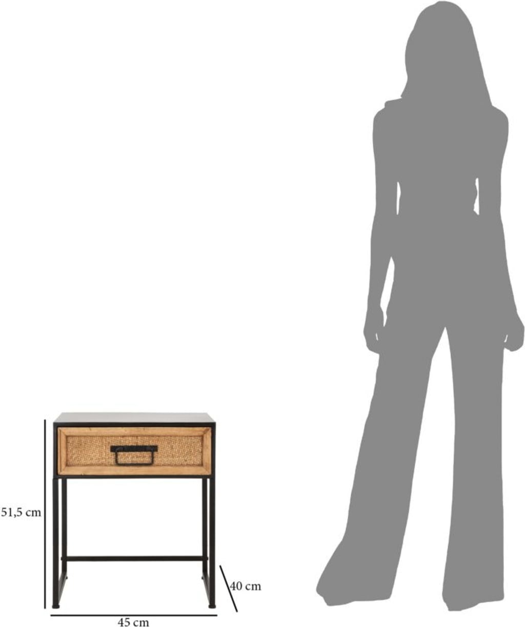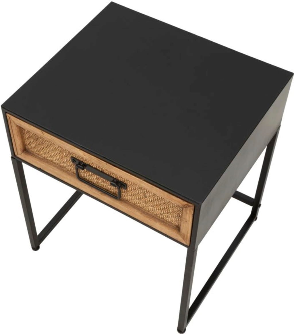 This bedside table combines the essential functionality of modern design with a touch of natural texture. It is the perfect complement to any furnishing style thanks to its clean lines and balanced shape. The solid black metal frame provides stability and adds an industrial accent.