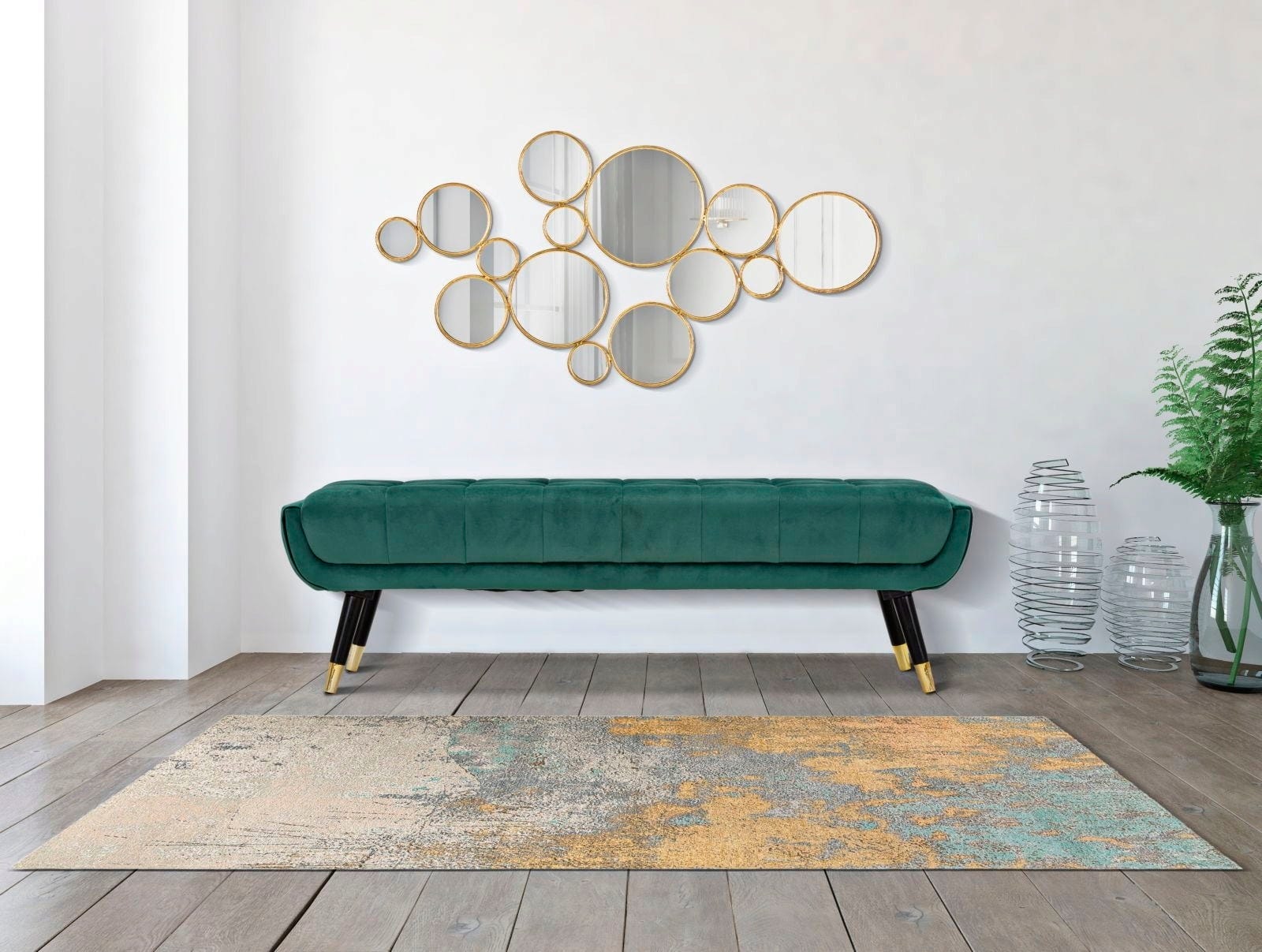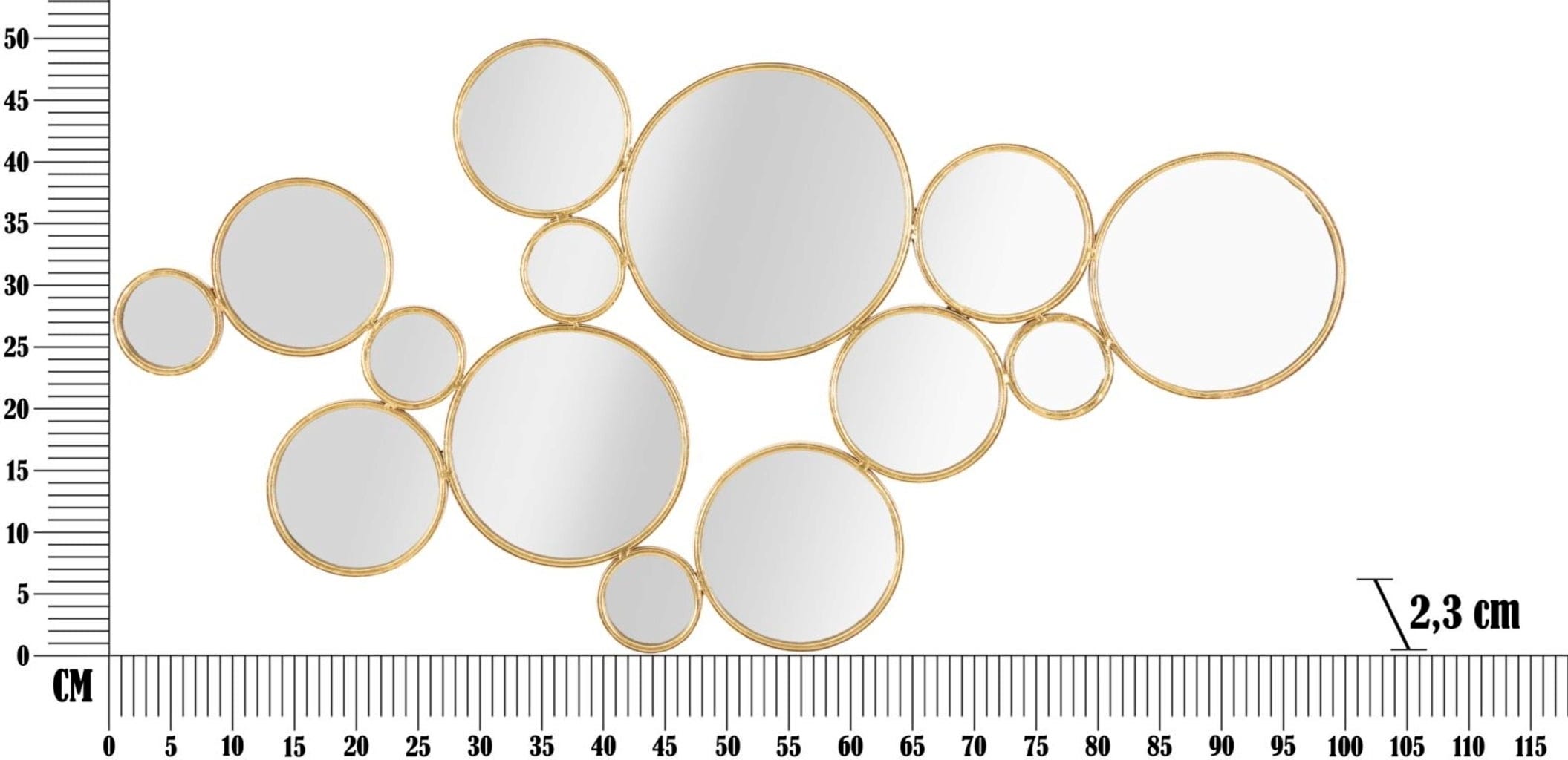 With the Mirrors Wall Decoration by Mauro Ferretti, you bring a true design highlight into your home that perfectly combines elegance and lightness. The artistic composition of numerous round mirrors in various sizes looks like a collection of floating soap bubbles, visually opening up your room and creating fascinating light reflections. Each individual mirror is encased in a simple, gold-colored frame that provides a luxurious touch without being intrusive.