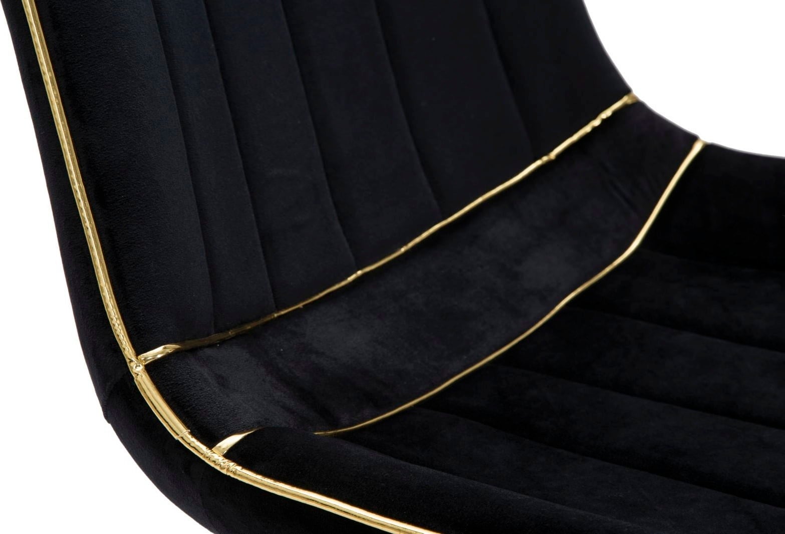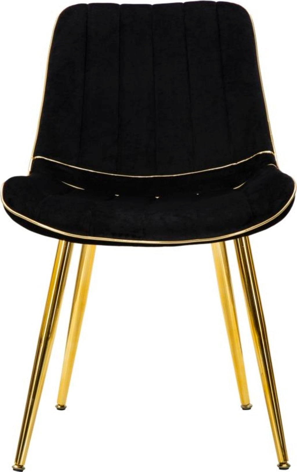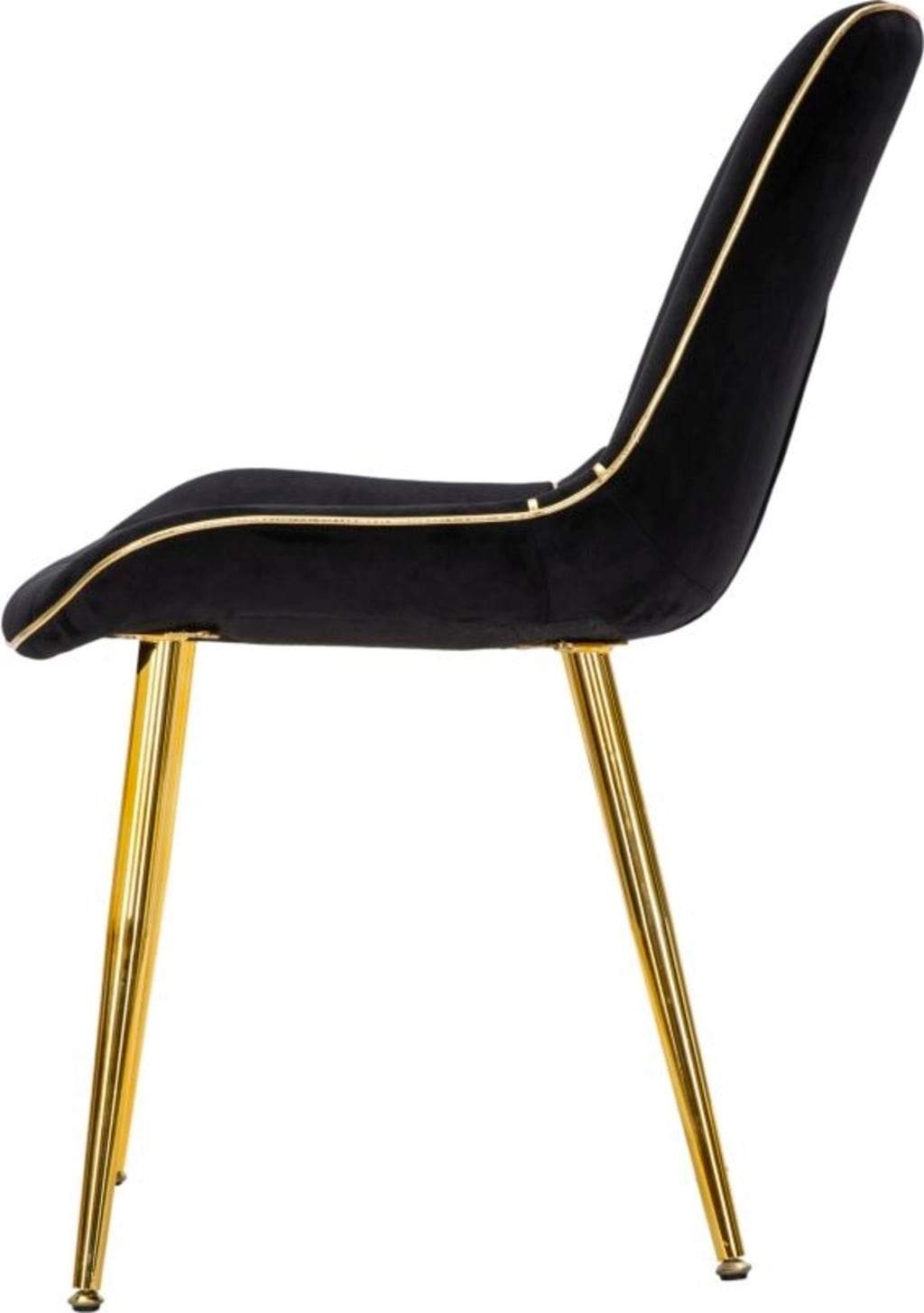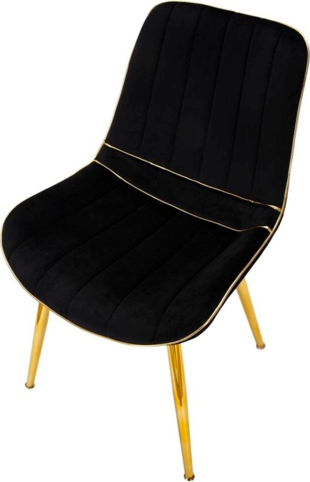 The chairs feature a soft, padded black fabric cover, accentuated by decorative gold piping and vertical quilting. The chairs are supported by slim, shiny, gold-coloured metal legs that perfectly round off the modern and luxurious design.