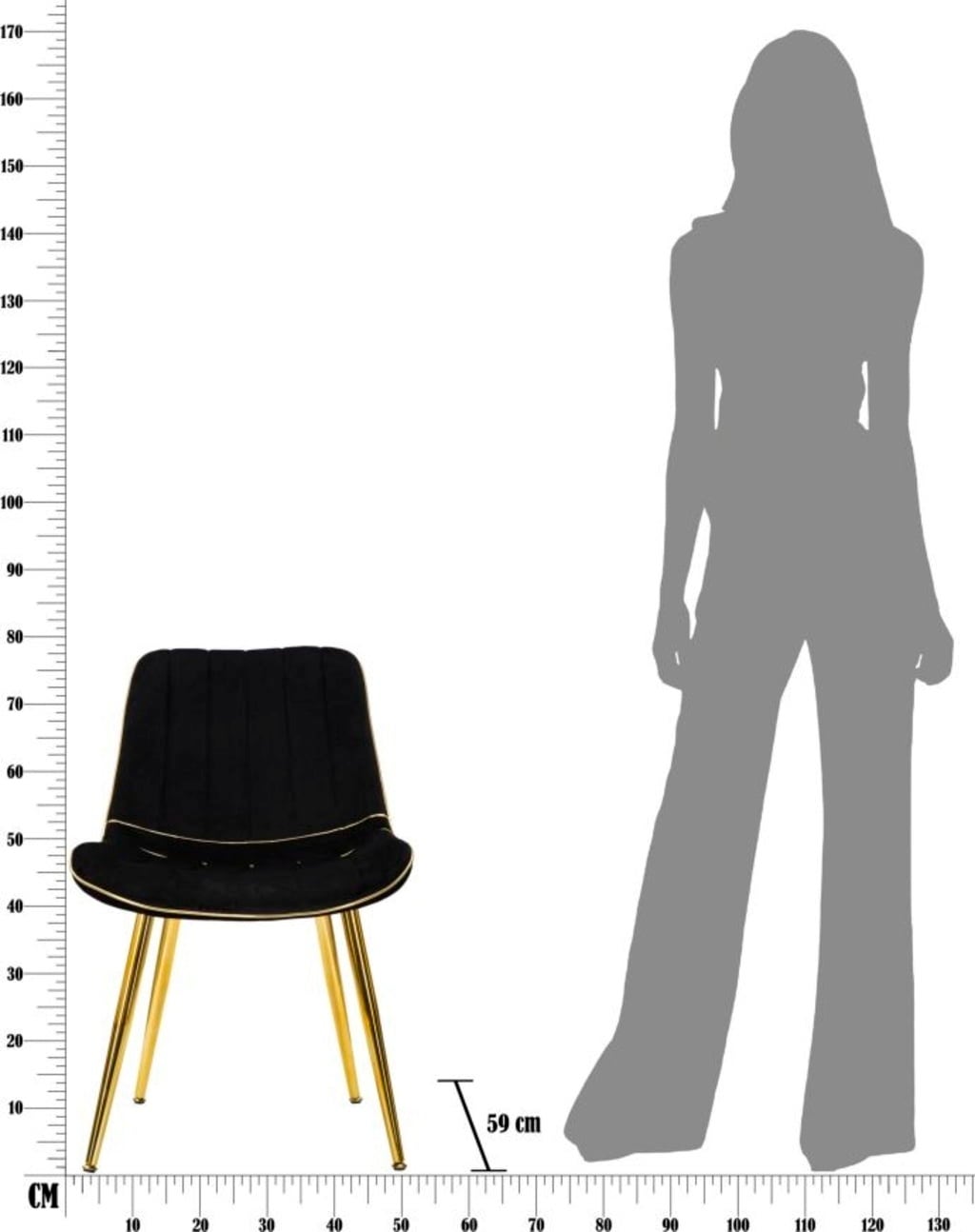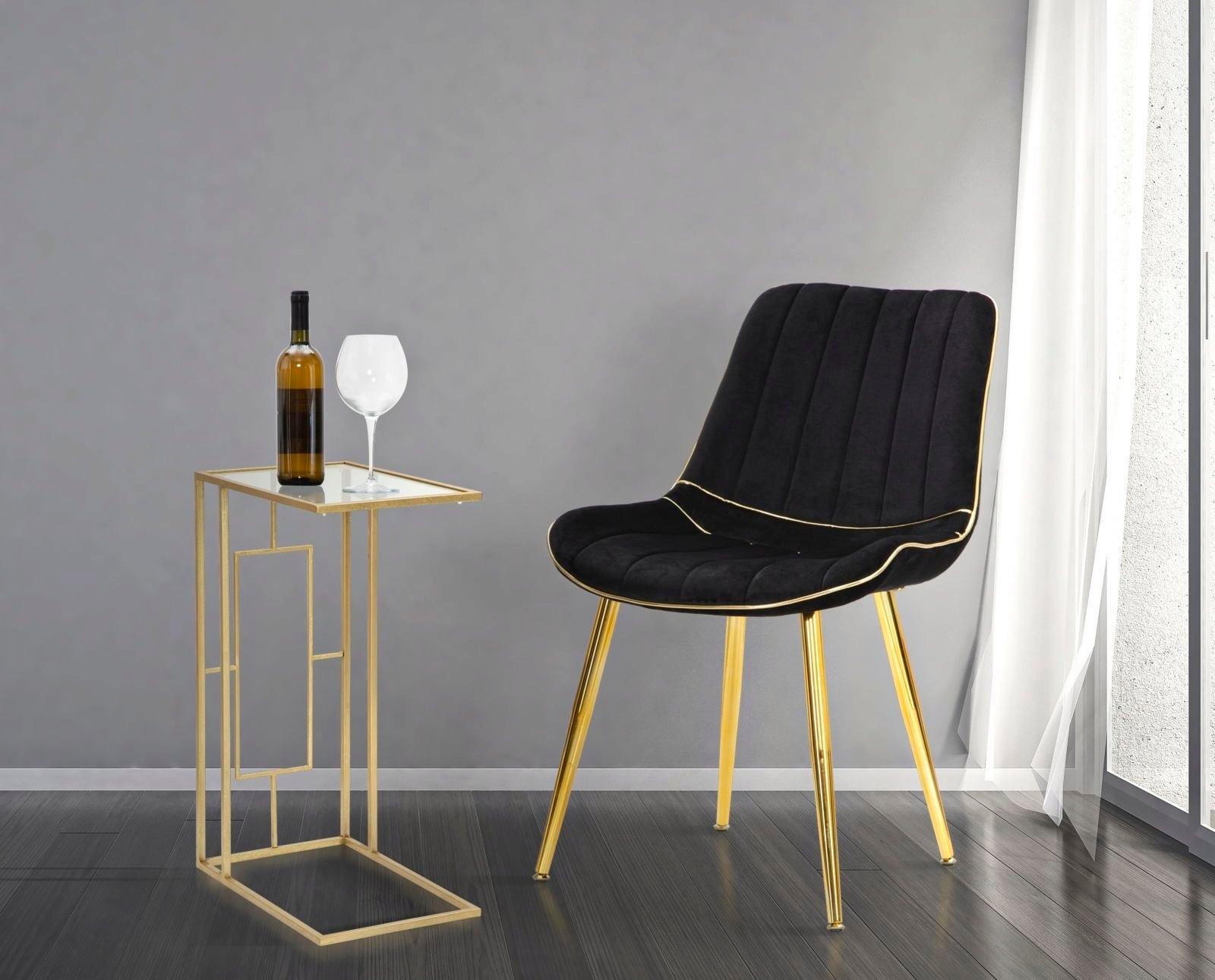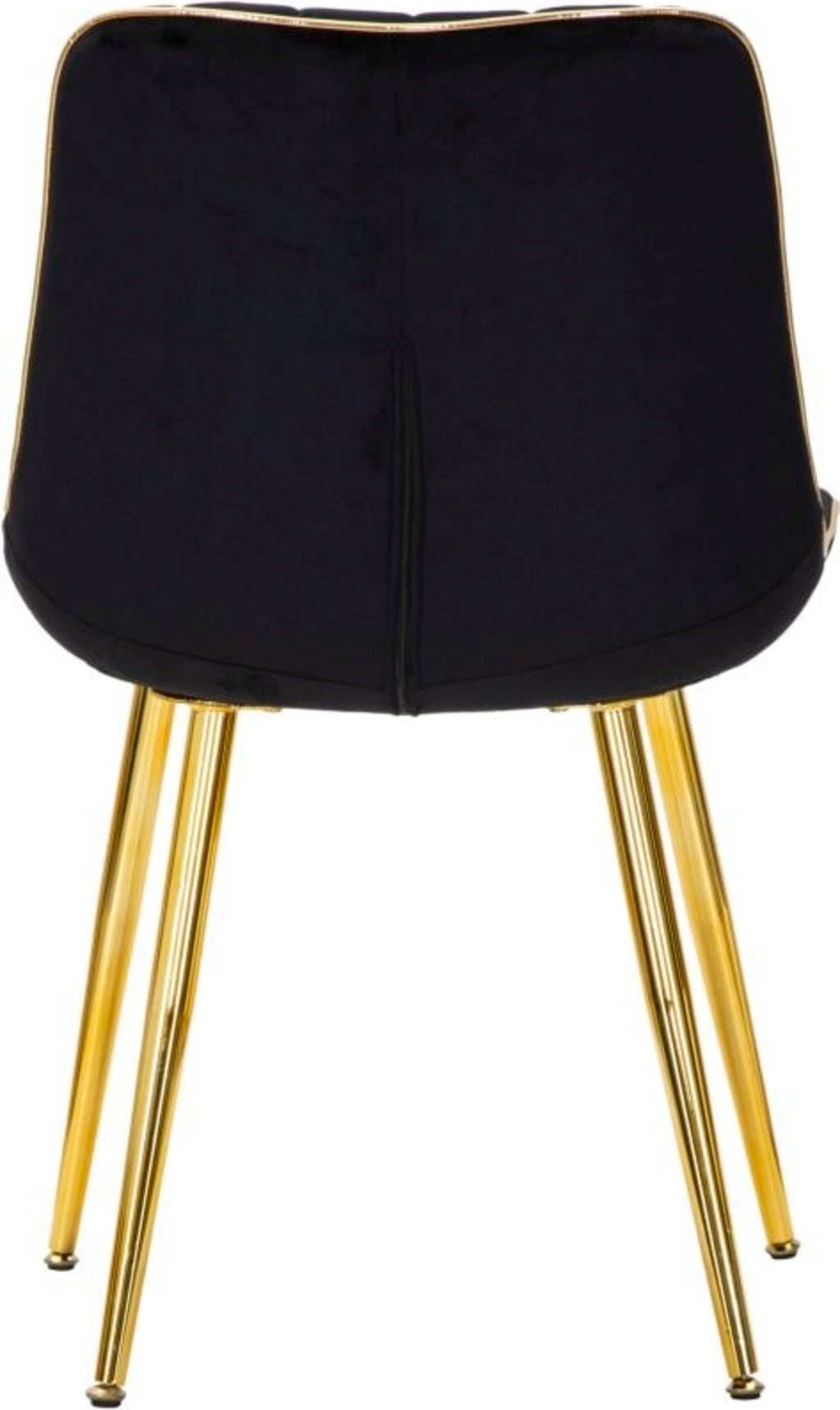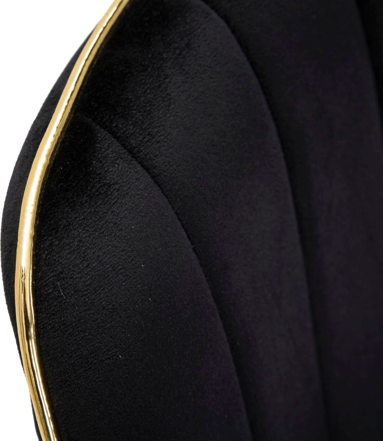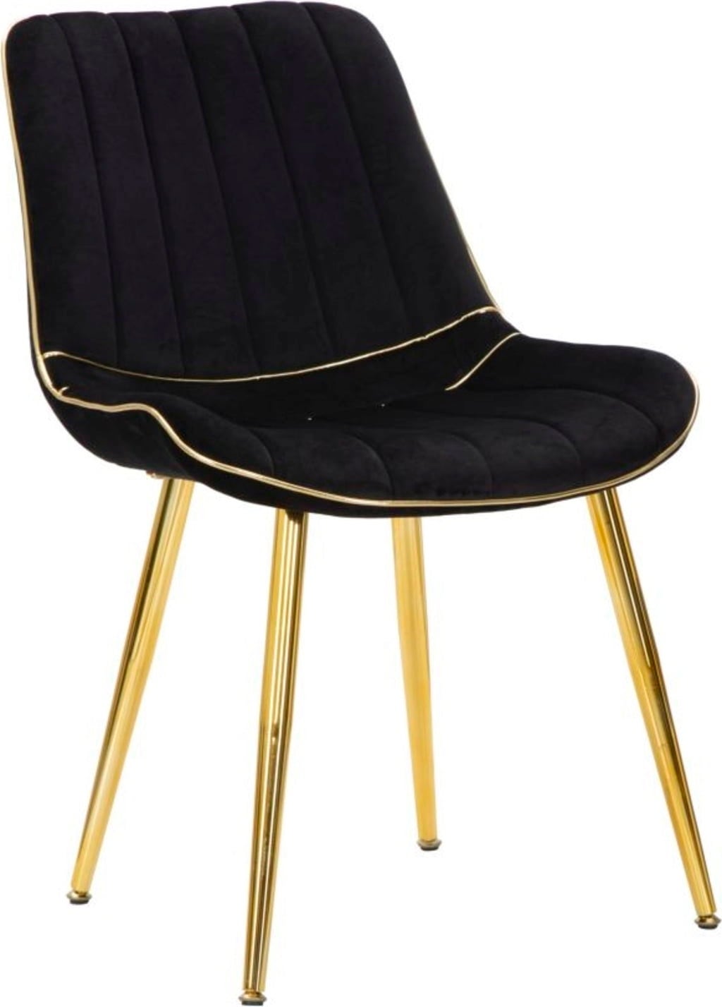 The chairs feature a soft, padded black fabric cover, accentuated by decorative gold piping and vertical quilting. The chairs are supported by slim, shiny, gold-coloured metal legs that perfectly round off the modern and luxurious design.