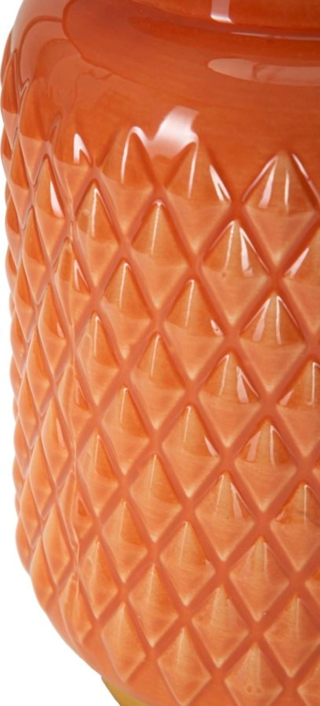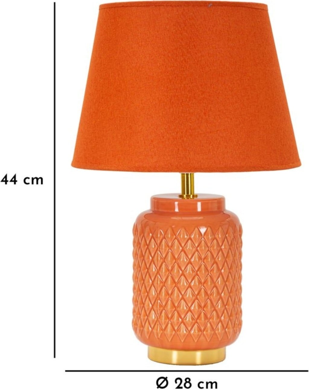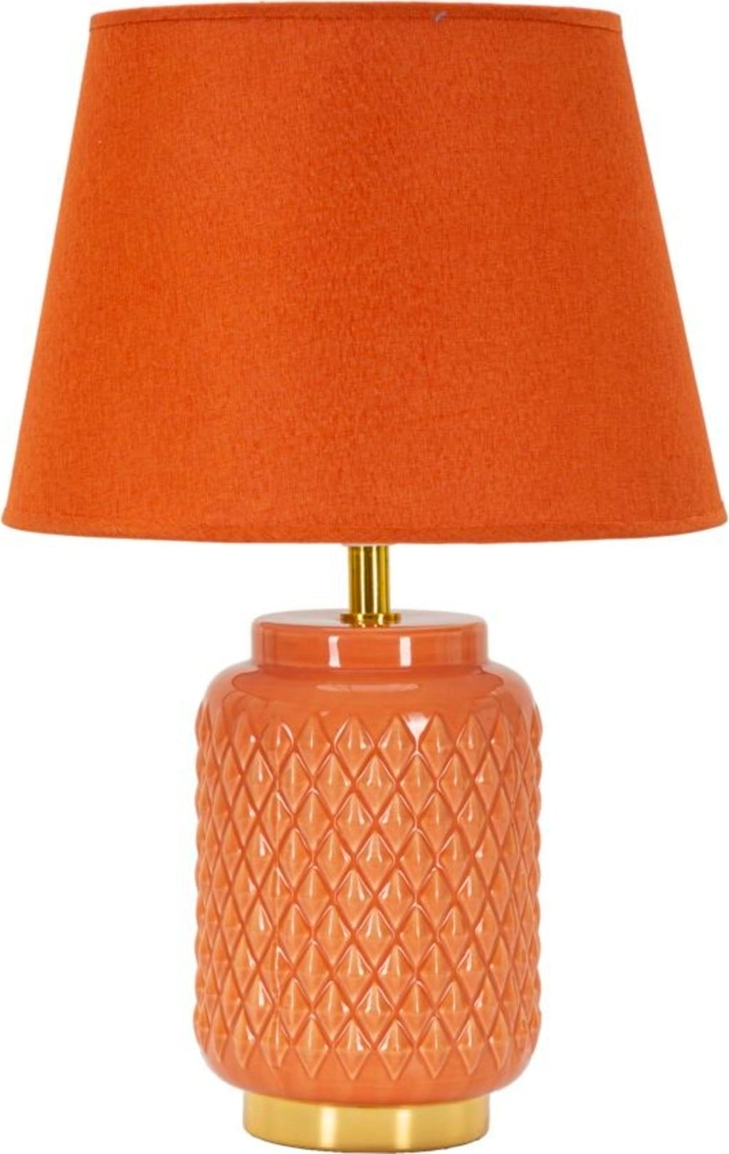 Add a bold pop of colour and bring modern design to your bedroom with this stunning bedside lamp. The cylindrical lamp base in bold orange is decorated with an elegant, embossed diamond relief that gives the surface a luxurious, tactile texture. This eye-catching design is stylishly emphasised by a shiny golden base and golden details on the neck of the lamp.