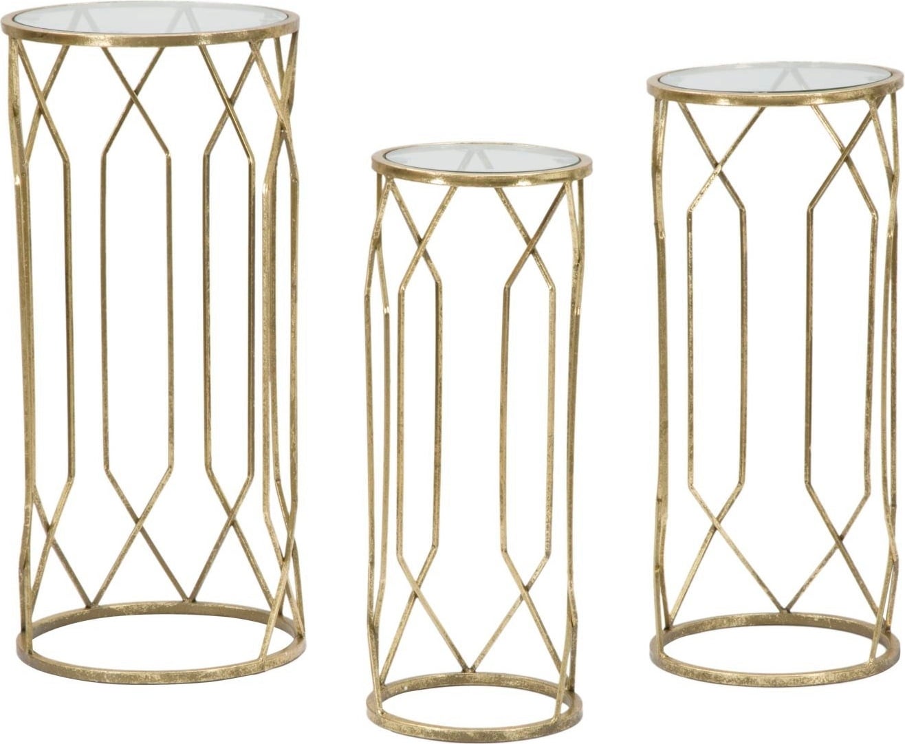 Each table is rounded off with a transparent glass top. Whether as a pedestal for sculptures or as side tables, this trio adds a touch of class to any room.
